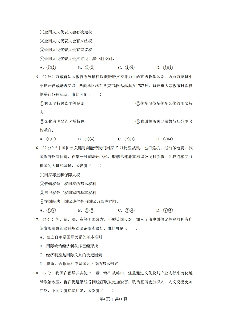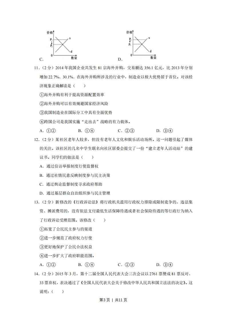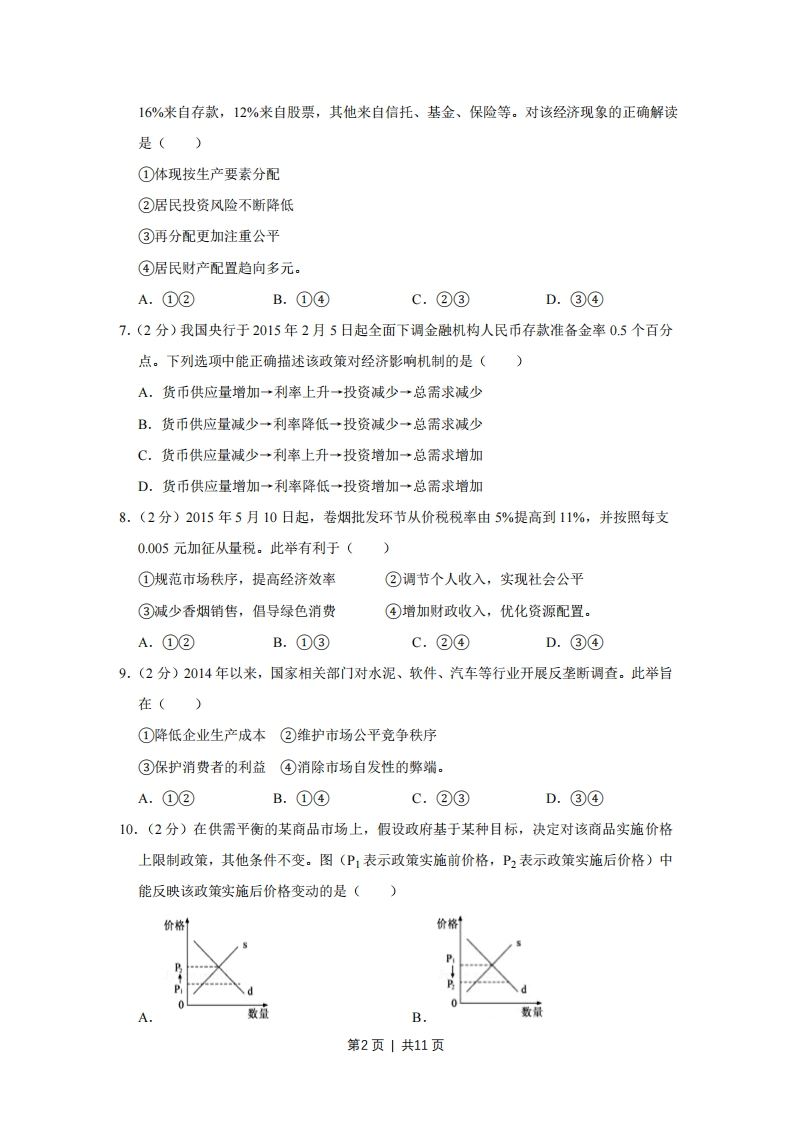 2015年江苏省高考政治试卷一、单项选释题:本大愿共33小题,每小题2分,共计66分.在每题给出的四个选项中,只有一个选项是最符合题意的1.(2分)中国人民抗日战争的胜利,谱写了中华民族不屈不挠抵抗外来侵略的壮丽史诗,彻底洗刷了近代以后中国屡遭外来侵略的民族耻辱,极大地增强了中华民族的自信心和自豪感。今年是中国人民抗日战争胜利()A.60周年B.65周年C.70周年D.75周年2.(2分)2014年6月,在第三十八届世界遗产大会上,21项文化遗产获准列入世界遗产名录,其中有中国与哈萨克斯、吉尔吉斯斯坦联合申报的“丝绸之路”和中国的()A.苏州园林B.南京明孝陵C.扬州廈西湖D.大运河3.(2分)2014年辈称为我国“全面深化改革元年”,经济社会发展迈出了坚实步伐。下列选项中,能体现激发市场活力的是()A.南水北调中线一期工程正式通水,沿线约6000万人直接受益B.国务院公布《事业单位人事管理条例》,系统规范事业单位人事管理C.国务院常务会议决定,在粤、津、闽特定区域再设三个自由贸易园区D.国务院印发《关于深化考试招生制度改革的实施意见》推进考试招生制度改革4.(2分)2014年11月,亚太经合组织第22次领导人非正式会议在北京举行。此次峰会的主题是()A.共建面向未来的亚太伙伴关系B.共建面向未来的亚太命运共同体C.共建面向未来的亚太战略伙伴关系D.共建面向未来的亚太经贸合作关系5.(2分)某科技公司凭借互联网思维、扁平灵活的管理架构和独特的供应链能力,成为互联网时代的新宠,仅用5年时间跃升为世界第三大智能手机生产商。材料表明()A.互联网应用是企业发展的根本原因B.满足市场需求是企业成功的关键C.自主创新能促进企业竞争优势形成D.获取利润是企业经营的直接目的6.(2分)据统计,2014年全国居民新增财产性收入40%来自房地产,17%来自银行理财,第1页|共11页