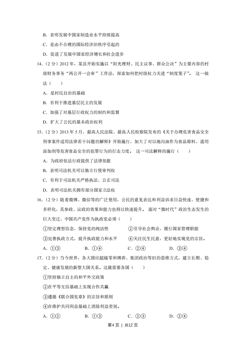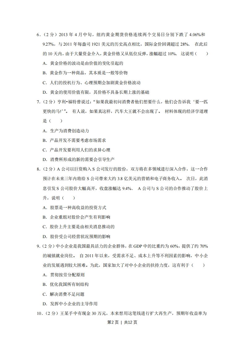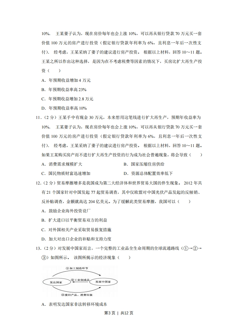 2013年江苏省高考政治试卷一、单项选择题:本大题共31小题,每小题2分,共计66分.在每题给出的四个选项中,只一个选项是最符合题意的,1.(2分)2012年11月,中国共产党第十八次全国代表大会在京举行。会议指出,解决“三农”问题的根本途径是()A.城乡发展一体化B.推动科技创新C.建设社会主义新农村D.优化产业结构2.(2分)2013年2月,国务院批转《关于深化收入分配制度改革的若干意见》.根据改革目标,2020年要实现比2010年翻一番的是()A,城镇居民财产性收入B.国家财政收入C.农村居民人均纯收入D.城乡居民人均实际收入3.(2分)2012年12月,我国自主建设、独立运行的全球卫星导航系统正式提供区域服务,范围覆盖包括我国及周边地区在内的亚太大部分地区。该系统是()A.“伽利略”导航系统B.GPS全球定位系统C.“格洛纳斯”导航系统D.北斗卫星导航系统4.(2分)2013年3月,国家主席习近平进行了一系列国事访问并出席金砖国家领导人第五次会晤。此次会晤的地点是()A.南非德班B.俄罗斯莫斯科C.印度新德里D.巴西里约热内卢5.(2分)一般来说,一国粮食产量大幅度增加,将会导致粮食价格和需求量的变动。在图1中,可以较为准确反映这种变动的是()价价格格需求量需求量价价需求量需求量第1页|共12页