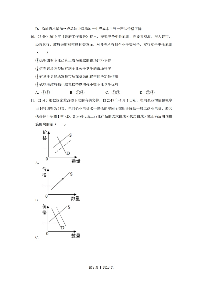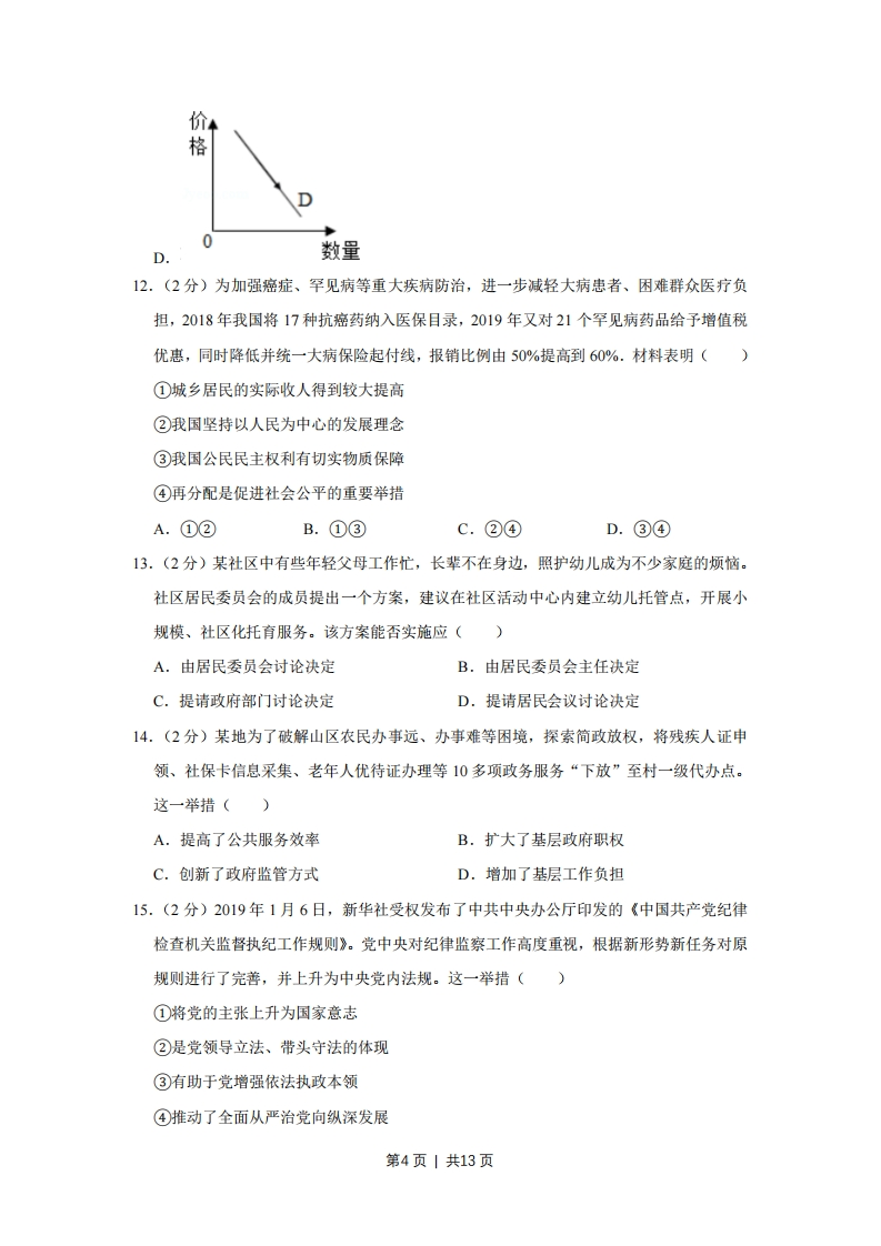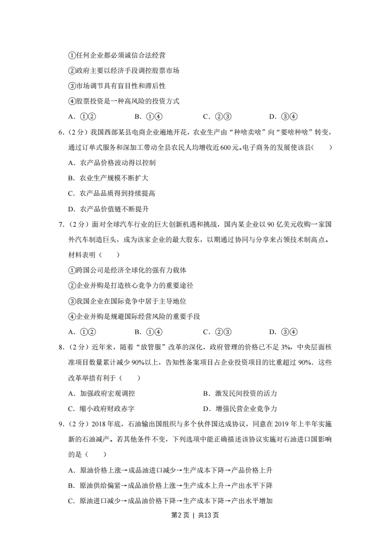 2019年江苏省高考政治试卷一单项选释题:本大题共33小题,每小题2分,共计66分.在每题给出的四个选项中,只有一个选项是最符合题意的。1.(2分)改革开放40年的发展历程证明,开放深刻改变了中国,也深刻影响了世界。下列选项能充分展示中国持续扩大开放决心和信心的是()①中国国际进口博览会在上海举行②颁布《中华人民共和国外商投资法》③在上海证券交易所设立科创板④实施个人所得税专项附加扣除政策A.①②B.①④C.②③D.③④2.(2分)2018年,我国获准列入《世界遗产名录》和《人类非物质文化遗产代表作名录》的分别是()A.鼓浪屿二十四节气B.可可西里甲骨文C.梵净山藏医药浴法D.神农架藏戏3.(2分)2018年10月24日,创造多项世界之最的港珠澳大桥正式通车运营。建设港珠澳大桥的主要意义是()A.促进粤南粤北地区协调发展B.推动海南自由贸易试验区发展C.助力粤港澳大湾区融合发展D.缓解珠江三角洲地区交通压力4.(2分)2019年我国要打好精准脱贫攻坚战,重点解决实现“两不愁、三保障”面临的突出问题。“两不愁、三保障”是指在让贫困人口不愁吃、不愁穿的同时,保障其()A.义务教育、基本医疗和住房安全B.职业教育、基本医疗和饮水安全C.职业教育、基本医疗和基本养老D.义务教育、基本医疗和就业稳定5.(2分)2018年11月16日深交所宣布,因某企业违法生产、销售狂犬病疫苗,对其正式启动强制退市机制。该企业成为退市规则修订后首家因危害公共健康安全而退市的上市公司。材料表明()第1页|共13页