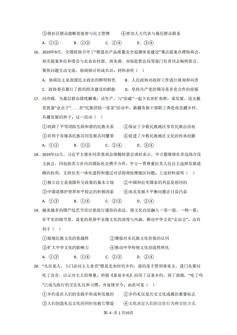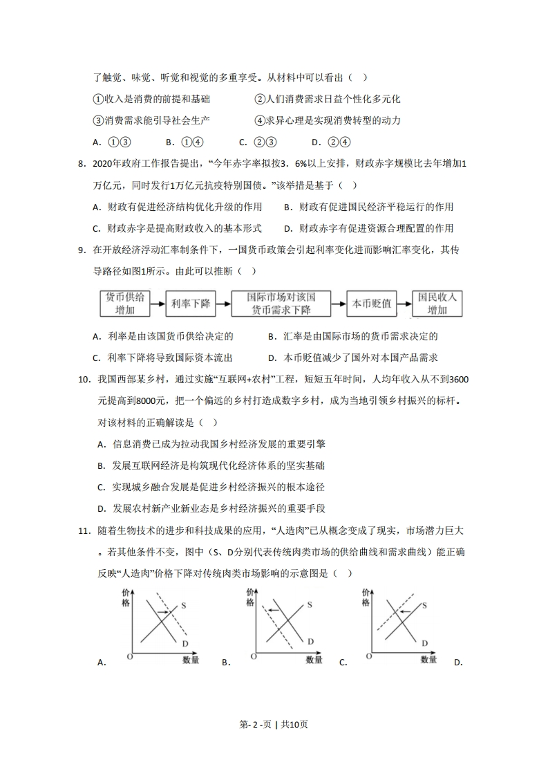 2020年普通高等学校招生全国统一考试(江苏卷)政治试题一、单项选择题:本大题共33小题,每小题2分,共计66分。在每题给出的四个选项中,只有一个选项是最符合题意的。1.2020年中央一号文件指出,要采取措施保障重要农产品有效供给和促进农民持续增收。这是因为,治国理政的头等大事是确保()A.就业安全B.生态安全C.食品安全D.粮食安全2.2019年我国国内生产总值达到99.1万亿元,按当年平均汇率折算,人均国内生产总值首次突破()A.3000美元B.5000美元C.10000美元D.50000美元3.2019年8月,中共中央、国务院印发的《关于支持深圳建设中国特色社会主义先行示范☒的意见》明确了示范区的战略定位。其中深圳发展更具竞争力的文化产业和旅游业、全面推进城市精神文明建设对应的战略定位是()A.高质量发展高地B.城市文明典范C.可持续发展先锋D.民生幸福标杆4.曾被授予“全国道德模范*“最美奋斗者”等荣誉称号,并获得共和国勋章和2019年国家最高科学技术奖的是()A.黄旭华B.曾庆存C.钟南山5.某市属国企在混合所有制改革前由该市国资委持股100%,2019年3月引入战略投资者以后,国资委仅持股45%。2020年1月,该企业营业收入同比增长20%,利润增长超过40%。由此可见,混合所有制改革能()A.强化对我国国有资产的监管B.完善我国多层次资本市场体系C.促进我国收入分配制度完善D.实现多种所有制资本优势互补6.某企业从2017年第一家门店开业到海外上市,仅用了不到两年的时间。2020年4月,该公司却爆出22亿元销售收入造假丑闻,被提起集体诉讼和要求退市。材料说明()①企业须维护信誉和形象②企业应积极开拓国际国内两个市场③企业应该强化风险控制④良好的市场秩序要靠市场规则维护A.①③B.①④C.②③D.②④7.适应消费需求新变化和新趋势,某地依托深厚的文化底蕴,通过定制夜游、美食夜市和演艺活动等项目,使古代文化和现代文明交相辉映。越来越多的消费者前来打卡,获得第-1-页1共10页