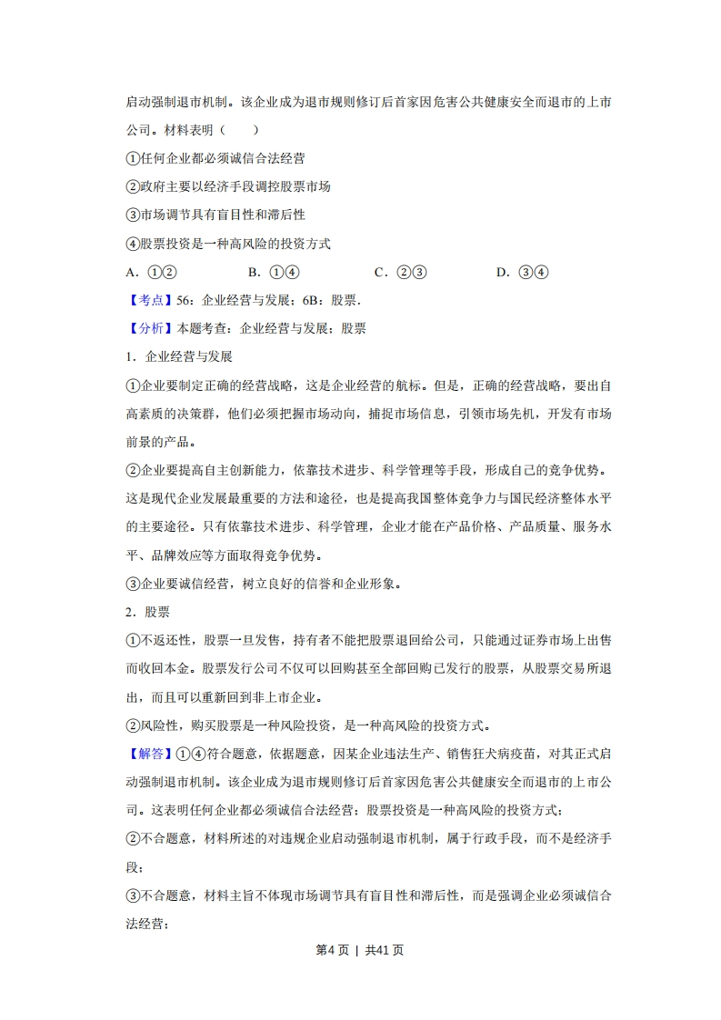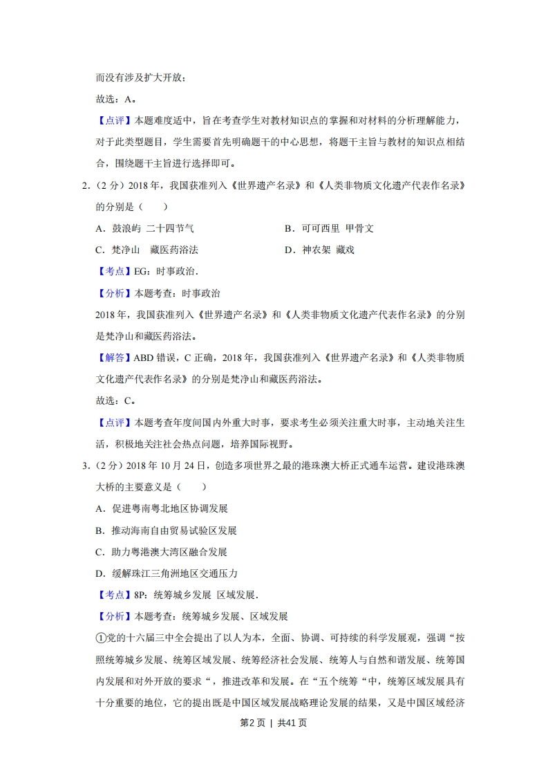 2019年江苏省高考政治试卷解析版◆考答案与试题解析一.单项选择题:本大题共33小题,每小题2分,共计66分。在年题给出的四个选项中,只有一个选项是最符合题意的。1.(2分)改革开放40年的发展历程证明,开放深刻改变了中国,也深刻影响了世界。下列选项能充分展示中国持续扩大开放决心和信心的是()①中国国际进口博览会在上海举行②颁布《中华人民共和国外商投资法》③在上海证券交易所设立科创板④实施个人所得税专项附加扣除政策A.①②B.①④C.②③D.③④【考点】9E:全面提高开放型经济水平.【分析】本题考查:全面提高开放型经济水平①实行更加积极主动的开放战略,完善互利共赢、多元平衡、安全高效的开放型经济体系。②要加快转变对外经济发展方式,推动开放朝着优化结构、拓展深度、提高效益方向转变,着力培育开放型经济发展新优势。形成以技术、品牌、质量、服务为核心的出口竞争新优势,促进加工贸易转型升级,发展服务贸易。提高利用外资综合优势和总体效益,推动引资、引技、引智有机结合。③促进“引进来”和“走出去”更好结合。经过多年的发展,我国“走出去”的条件越来越成熟,要求越来越迫切。实施“走出去”战略是我国对外开放新阶段的重大举措。“走出去”,是指通过到境外投资办厂、对外承包工程与劳务输出等各种形式,与其他国家进行经济技术合作。【解答】①②符合题意,中国国际进口博览会在上海举行、颁布《中华人民共和国外商投资法》,为扩大开放提供了平台、优化了营商环境,充分展示中国持续扩大开放决心和信心:③不合题意,在上海证券交易所设立科创板是进一步落实创新驱动发展战略、增强资本市场对提高我国关键核心技术创新能力的服务水平的体现,而没有涉及扩大开放:④不合题意,实施个人所得税专项附加扣除政策涉及的是促进公平正义,释放内需潜力,第1页1共41页