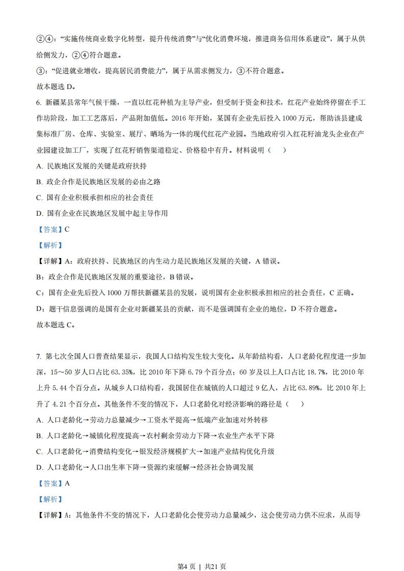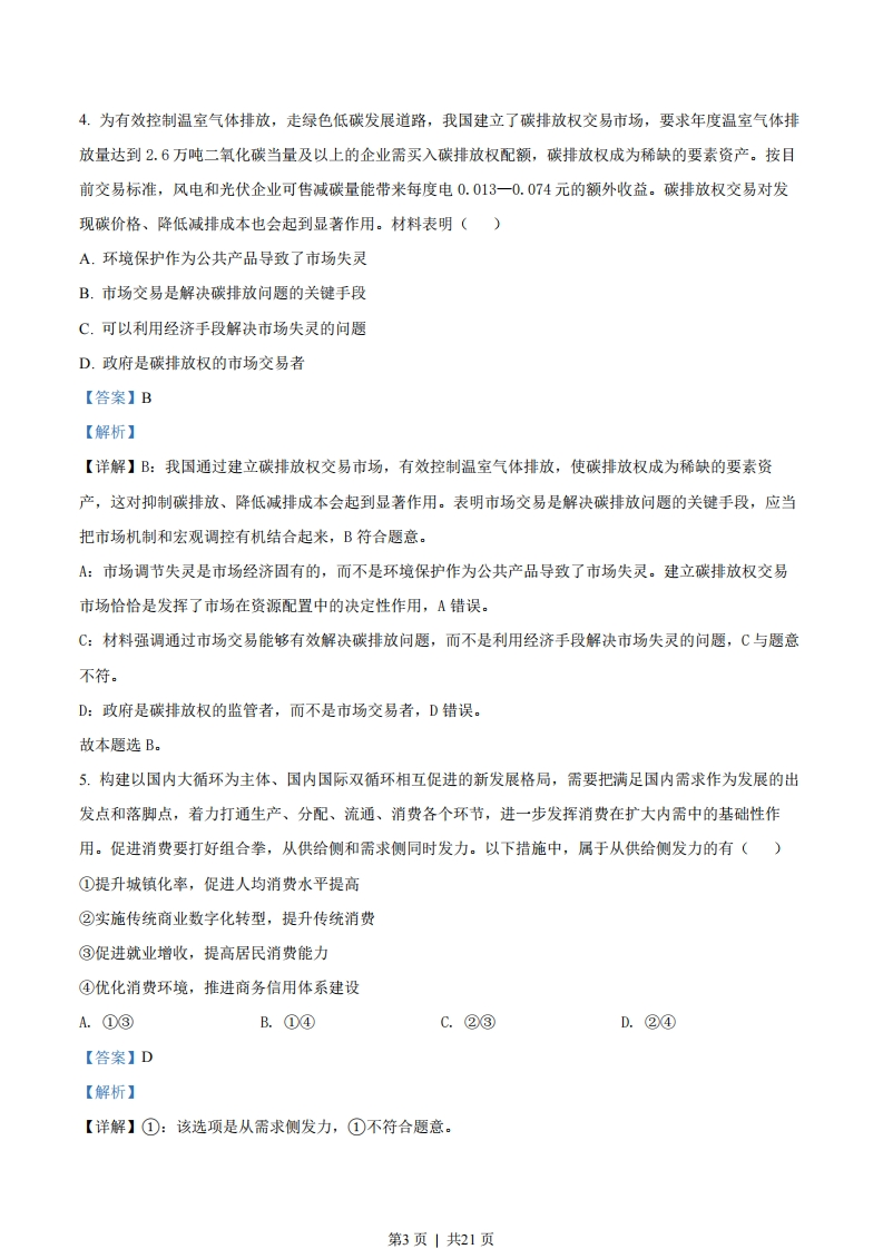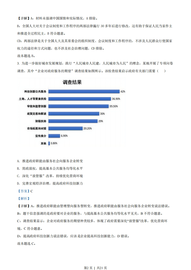 2021江苏高考思想政治一、单项选释题:共15题,每题只有一个选项最符合题意。1.教育是民族振兴、社会进步的重要基石。“十四五”期间,我国将以立德树人为根本任务,以推动高质量发展为主题,以深化供给侧结构性改革为主线,以改革创新为根本动力,大力推进高质量教育体系建设。建设高质量教育体系有助于()A.保障公民的发展权,更好地服务国家建设B.调动公民直接参与教育决策和管理的积极性C.实现教育公平,维护公民基本的民主权利D.促进教育均衡发展,健全多层次社会保障体系【答案】A【解析】【详解】A.:从题干中“教育是民族振兴、社会进步的重要基石”以及“我国将以立德树人为根本任务,以推动高质量发展为主题,以深化供给侧结构性改革为主线”等内容可以看出,我国建设高质量教育体系主要是通过此举保障公民的发展权,更好地服务于国家建设,故A正确。B.:在我国,公民并不能直接参与教育决策和管理,故B错误。C:公民基本的民主权利是选举权和被选举权,而不是教育公平,故C错误。D.我国建设高质量教育体系主要是保障公民受教育的权利,服务国家发展,与健全多层次社会保障体系无关,故D错误。故本题选A。2.会议制度和工作程序。全国人大议事规则规定了全国人大及其常委会的组织制度、会议制度和工作程序。2021年3月11日,十三届全国人大四次会议表决通过了对这两部法律的修改决定,这是两部法律施行30多年后的首次修改。这两部法律的修改()A表明人民代表大会制度符合中国国情和实际B.有助于保证人民当家作主和推进全过程民主C.丰富了人民群众行驶国家权力的途径和方式D.有利于完善社会治理机制,提升社会治理水平【答案】B【解析】第1页」共21页