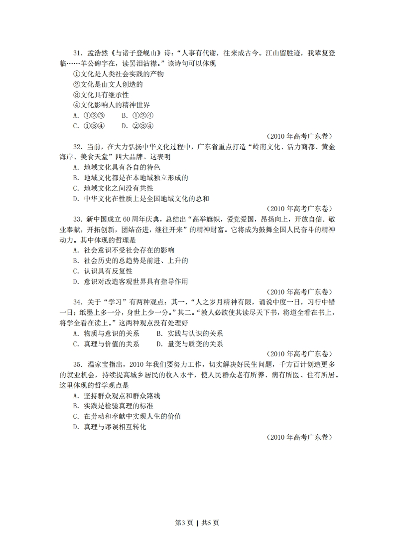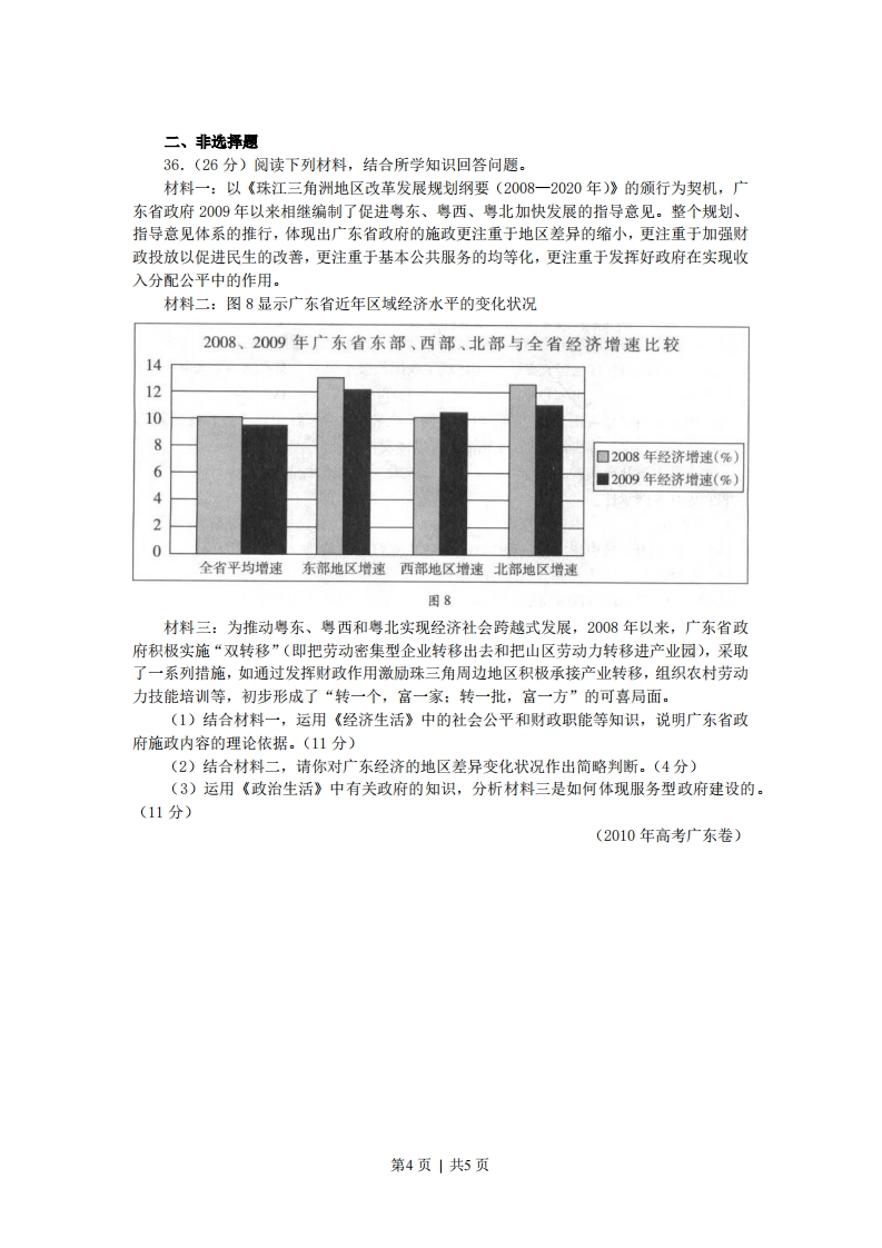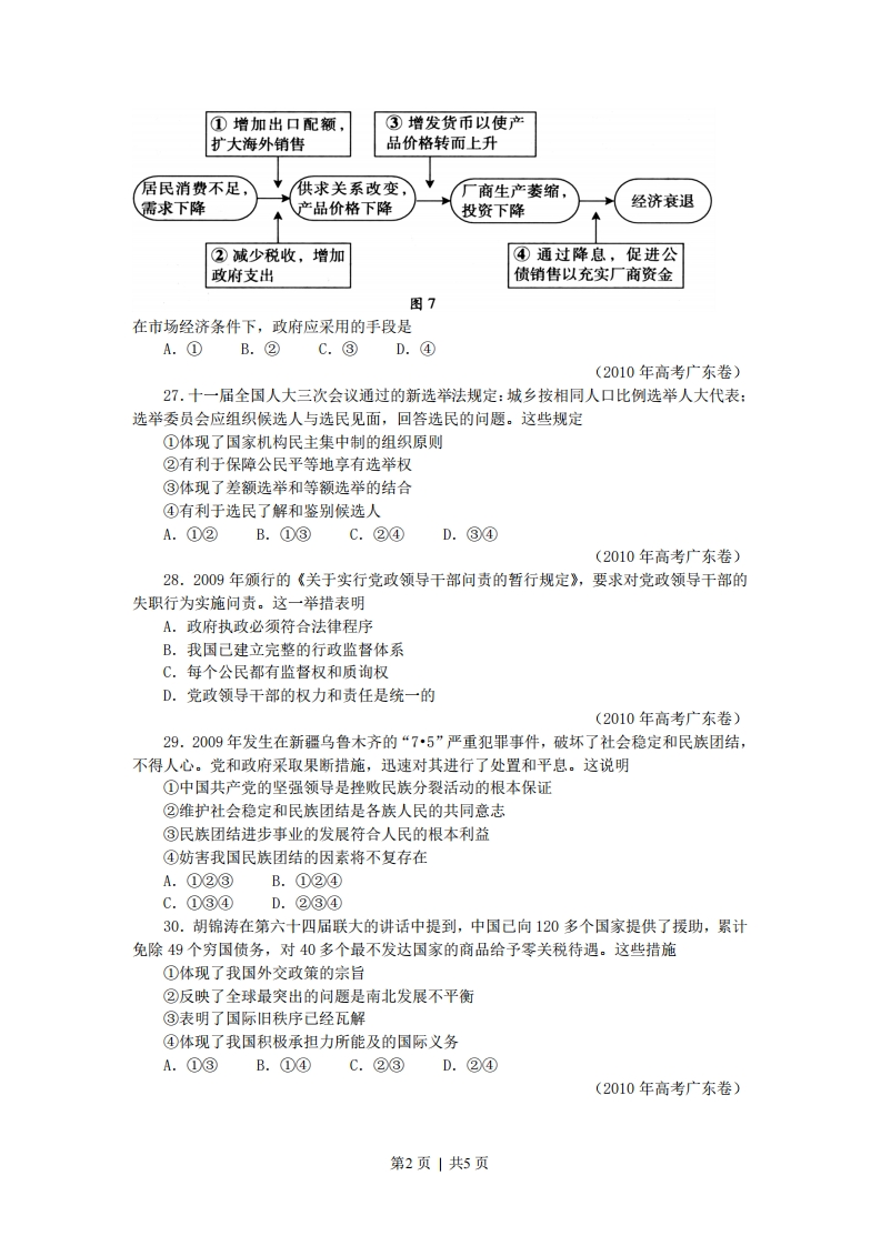 2010年广东高考政治解析版一、单项选择题24.图5、6中商品甲、乙是两种互不关联的普通商品。价格需求曲线需求曲线PP2P200Q'Q*商品甲数量Q*商品乙数量图5图6当两商品的价格P均从P1同幅下降到P2时。对于需求量Q的变化,若有如下判断:①两商品的需求量与价格同向变动②两商品的需求量与价格反向变动③两商品相比,商品甲是高档耐用品④两商品相比,商品甲是生活必需品其中正确的是A.①③B.①④C.②③D.②④(2010年高考广东卷)25.2005~2009年,广东居民人民币储蓄存款余额从19051亿元增至31346亿元。若其间伴随如下变化:①利息税税率上升②利息率上升③居民收人上升④消费上升⑤储蓄机构增加其中导致储蓄增长的原因是A.①②B.①④C.②③D.④⑤(2010年高考广东卷)26.图7横向箭头显示的是一种宏观经济的收缩过程,纵向箭头显示的是针对过程中各环节相应的调控手段。第1页|共5页