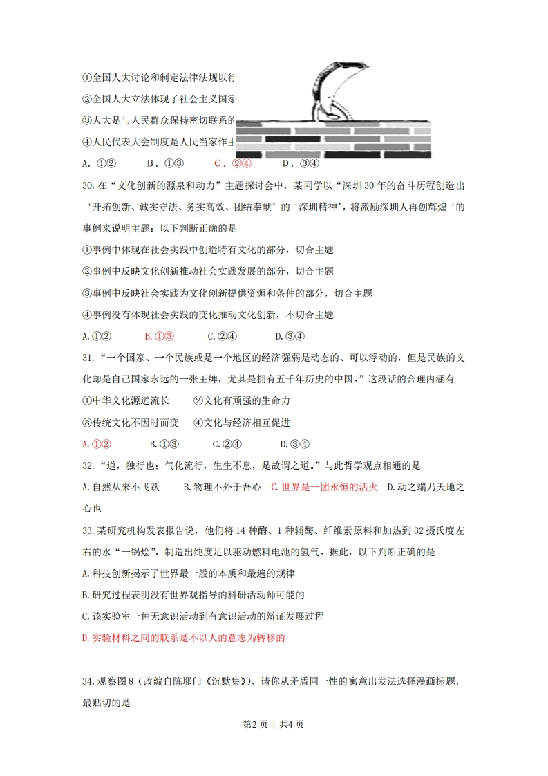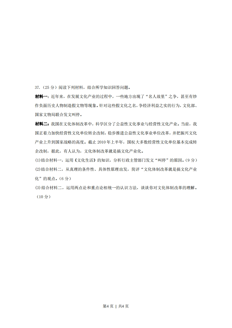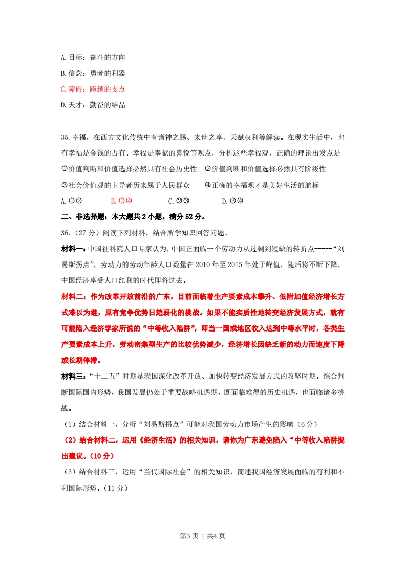 2011广东高考文综(政治部分)解析版24.图7描述的是某品牌奶粉的需求曲线由D1左移到D2。下列事件中能导致这种变动关系的是:P价A.该奶粉生产商供应减少格B.政府提高了商品消费税C.居民收入水平大幅上升需求量QD.该奶粉检测出有害物质25.2011年一季度我国消费者价格指数(CPI)同比上升5.0%,居民的通货膨胀预期日益强烈。在此情况下,不考虑其他因素,消费者理性的应对措施是:A.增加现期消费B.提前归还债务C.持有债券D.增加储蓄26.某企业某年利润1.2亿元,称之为私人收益,但污染造成居民的经济损失约0.4亿元,这样社会收益约0.8亿元。由于政府新颁布了环境保护条例,在同样情况下,该企业为避兔可能面临的0.4亿元的罚款,投入0.2亿元解决了污染问题,此时社会收益为1.0亿元。这一过程表明:27.A.法律法规是资源配置的基本手段B.污染是公共物品,必须由政府治理28.C.市场在政府调控下对资源配置起基础性作用D.市场调节具有滞后性的弊端29.27、某县委员2010年底试行权力公开透明运行工作以来,出现了“组织公开什么,群众就看到什么”到“群众关注什么,组织就公开什么”的转变。这种转变体现了党:A.重视人民主体地位B.增加人民监督权力C.强化人民政治责任D.扩大人民政治权利28.2009年,广东全省性社会团体有138个承担政府委托、转移职能326项,有184个获得政府购买服务收入9820万元。过假“十二五”规划纲要提出,坚持培育发展和管理监督并重,推动社会组织健康发展,发挥其提供服务、反映诉求、规范行为的作用。这表明:①政府职能正逐步减少②政府职能正逐步市场化③社会组织的发展有利于推动公民有序政治参与④社会组织在政府和公民之间的桥梁作用将会加强A.①②B.②③C.②④D.③④29.十一届全国人大常委会第20次会议决定,将个人所得税法律修正案草案向社会全文公布征求意见,进一步修改完善后,再审议表决。根据材料,以下认识正确的是:第1页|共4页