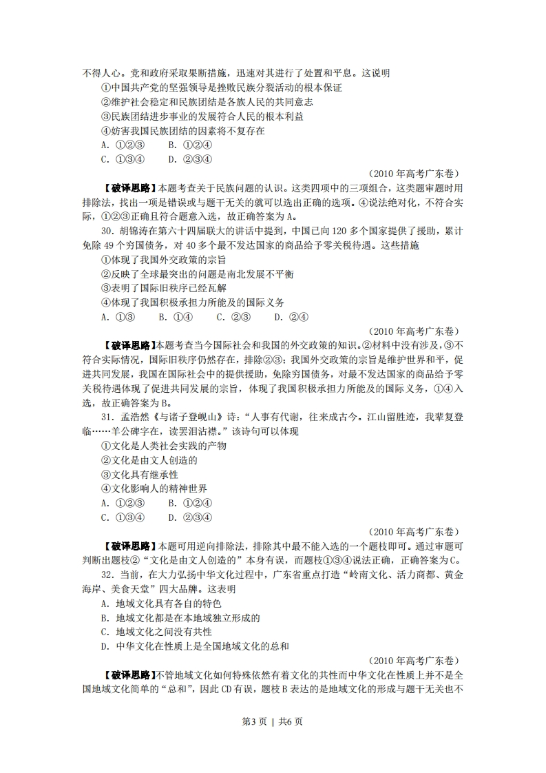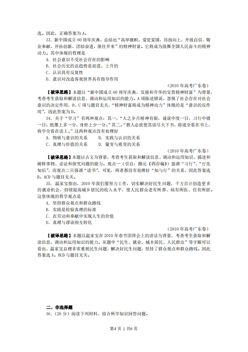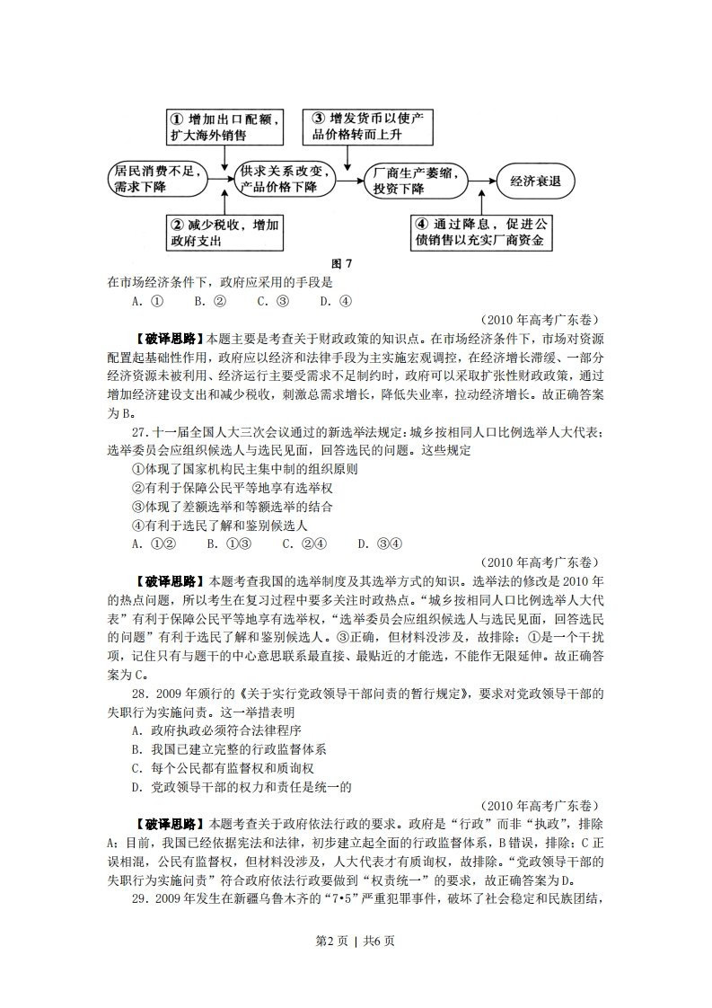 2010年广东高考政治解析版一、单项选择题24.图5、6中商品甲、乙是两种互不关联的普通商品。价格需求曲线需求曲线PPP2P20Q'Q*商品甲数量0Q*商品乙数量图5图6当两商品的价格P均从P1同幅下降到P2时。对于需求量Q的变化,若有如下判断:①两商品的需求量与价格同向变动②两商品的需求量与价格反向变动③两商品相比,商品甲是高档耐用品④两商品相比,商品甲是生活必需品其中正确的是A.①③B.①④C.②③D.②④(2010年高考广东卷)【破译思略】本题考查商品价格变动对需求量的影响知识点。价格变动对生活必需品的影响比较小,对高档耐用品的影响比较大,可得④:由图表中价格箭头方向及需求曲线的变化可得②。故正确答案为D。25.2005~2009年,广东居民人民币储蓄存款余额从19051亿元增至31346亿元。若其间伴随如下变化:①利息税税率上升②利息率上升③居民收人上升④消费上升⑤储蓄机构增加其中导致储蓄增长的原因是A.①②B.①④C.②③D.④⑤(2010年高考广东卷)【破译思路】本题考查关于储蓄存款的相关知识。把题干给出的广东居民人民币储蓄存款余额大幅增加看作是结果,居民收入上升和利息率上升可以作为原因,故②③入选:而①利息税税率上升和②消费上升只可能导致储蓄减少,⑤储蓄机构增加与储蓄增长与否无关。故正确答案为C。26.图7横向箭头显示的是一种宏观经济的收缩过程,纵向箭头显示的是针对过程中各环节相应的调控手段。第1页|共6页