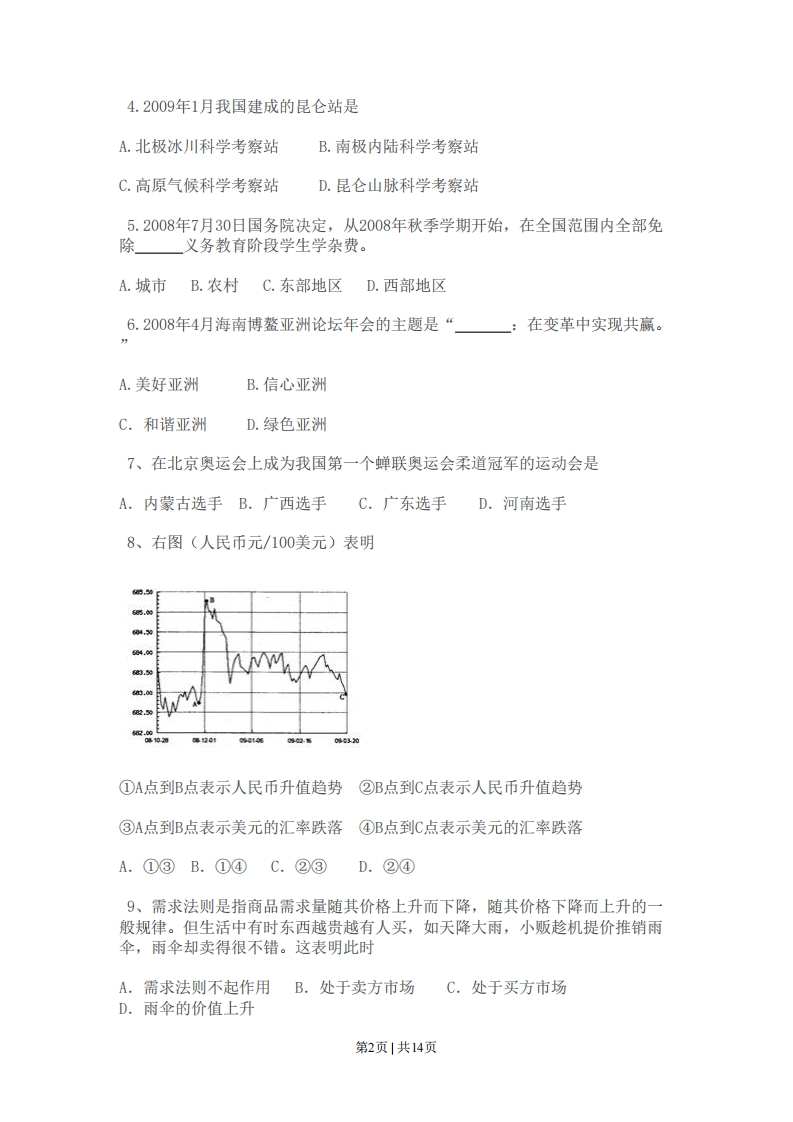 2009年普通高等学校招生全国统一考试(广东卷)政治试题及答案本试卷共8页,41小题,满分150分.考试用时120分钟。注意事项:1.答卷前,考生务必用黑色字迹的钢笔或签字笔将自己的姓名和考生号、试室号、座位号填写在答题卡上,用2B铅笔将试卷类型(B)填涂在答题卡相应位置上。将条形码横贴在答题卡右上角“条形码粘贴处”。2.选择题每小题选出答案后,用2B铅笔把答题卡上对应题目选项的信息点涂黑,如需改动,用橡皮擦干净后,再选涂其他答案,答案不能答在试卷上。3.非选择题必须用黑色字迹钢笔或签字笔作答,答案必须写在答题卡各题目指定区域内相应位置上:如需改动,先划掉原来的答案,然后再写上新的答案:不准使用铅笔和涂改液。不按以上要求作答的答案无效。4.作答选做题时,请先用2B铅笔填涂选做题的题号对应的信息点,再作答。漏涂、错涂、多涂的,答案无效。5.考生必须保持答题卡的整洁。考试结束后,将试卷和答题卡一并交回。一、选择题I:本大题共26小题,每小题2分,满分52分。在每小题给出的四个选项中。只有一项是最符合题意的。1.十七届三中全会通过的《中共中央关于推进农村改革发展若干重大问题的决定》要求,到2020年农民人均比2008年翻一番。A.土地收入B.粮食产量C.纯收入D.非农收入2.十一届全国人大常委会第七次会议通过,并于2009年6月1日开始实施的法律是A.循环经济促进法B.劳动合同法C.防震减灾法D.食品安全法3.国家统计局2008年10月27日公布的报告显示,30年来,中国居世界的位次由第十位上升到第四位的经济指标是A.外汇储备B.居民人均收入C.国内生产总值D.进出口总额第1页1共14页