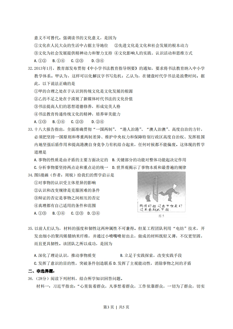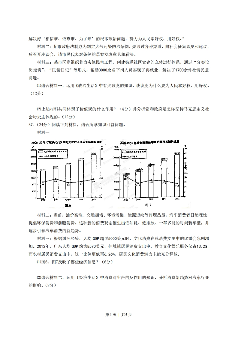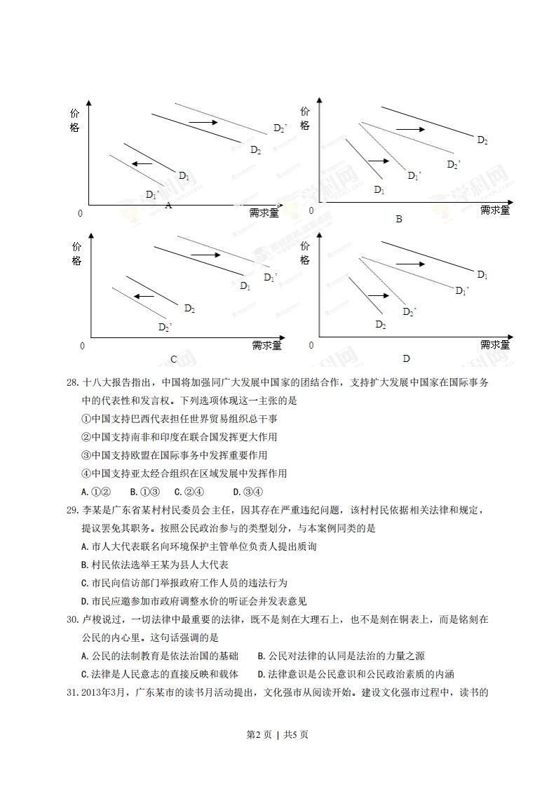 2013亭号广东文综议治试题一、选择题24.2012年10月,某跨国公司关闭其苏州工厂,将生产线向越南、束埔寨等劳动力成本更低的国家转移,导致该厂与我国300多家代工企业的合同被解除。这给我们的启示是A.经济全球化对我国的经济安全构成极大威胁B.发达资本主义国家主导跨国公司投资的方向C.企业应从代加工向自主创新、自创品牌转变D.对外开放战略应由“引进来”转向“走出去”25.我国18.26亿亩耕地中,中低产田约70%,大量劣质土地效益低。为此,财政部制定农业综合建设规划,拟到2020年,依靠科学技术和综合治理,改造中低产田、建设高标准农田4亿亩。此举有利于①加强农业的基础地位,保障国家粮食安全②扩大耕地面积,增加产量,降低农产品价格③实现农业现代化,提高农民收入④保障农民权益,推进土地制度改革A.①③B.①④C.②③D.②④26.在开放性经济中,因国际大宗商品价格上涨,扩张性财政政策可能带来通货膨胀的压力。其传导路径正确的是①对原材料的进口增加扩张性②进口成本上升,生产成本增加物价上涤通货博胀财政政策③经济建长文出增加④生产扩张,总需对片A.①→②→③→④B.③-①→④→②C.③→④→①→②D.④→③→①→②27.假设甲国化妆品市场高档品牌被进口品牌垄断,为保护国内产业发展,甲国对进口化妆品提高关税,致其价格飙升:受此影响,消费者转向国产中低档品牌,使进口高档品牌的需求曲线(D1)和国产中低档品牌的需求曲线(D2)发生变动。不考虑其他因素,能正确反映这一变化的图形是第1页|共5页