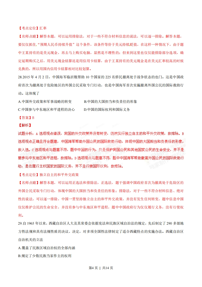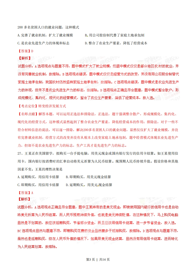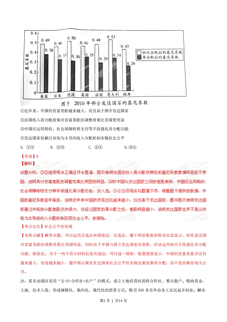 绝密女启封前2015年普通高等学校招生全国统一考试文科综合能力测试政治(广东卷)A卷一、选择题:本题共12小愿,每小题4分,共48分。在每小愿给出的四个选项中,只有一项是符合题目要求的。24.2014年5月,团省委与某股权交易中心共同发起设立国内首个“青年大学生创业板”股权众筹平台。投资机构出资入股,与创业公司共享收益、共担风险。截止当年年底,该平台累计上板项目112项,其中55项与投资公司达成投资意向,融资近5000万元。该股权众筹平台()A.创新了公司基本组织形式B.扶持了大学生创业,改善了产业结构C.实现了项目与资源的有效对接D.使投资公司定期获得稳定的经营收益【答案】C【解析】试题分析:A选项观点与题意不符,题中股权众筹平台并没有创新公司基本组织形式,公司基本组织形式仍然是有限责任公司和股份有限公司,故排除。B选项观点与题意不符,题中股权众筹平台扶持了大学生创业,但并没有改善产业结构,故排除。C选项观点正确且符合题意,通过题中股权众筹平台,大学生创业项目与投资公司的资源实现了有效对接,故入选。D选项观点与题意不符,股票投资是高风险投资,投资公司并不会获得稳定的经营效益,故排除。【考点定位】市场配置资源【名师点睛】解答本题,可以运用正选法和排除法,正选法,题目信息强调该股权众筹平台能够把大学生创业项目与投资公司实现有效对接:排除法,对于一些绝对性的说法、不符合材料信息的说法,可以逐一排除,股票投资是高风险投资,不可能获得稳定的经营收益:股权众筹平台改善的是大学生就业,而不是产业机构,公司的基本组织形式并不会因为股权众筹平台的建立而改变。25、基尼系数是判断居民内部收入分配差异程度的指标,该系数介于01之间,值越小表明收入分配越平均,反之,表明收入差距越大。国际上通常把0.40作为贫富差距的警戒线。2010-2014年,中国收入再分配后的基尼系数分别是0.481、0.477、0.474、0.473和0.469.对比图5,不考虑各国发展阶段和发展水平的差异,可以推断出第1页|共14页