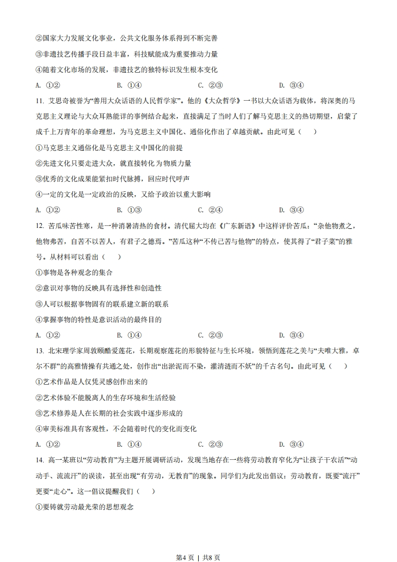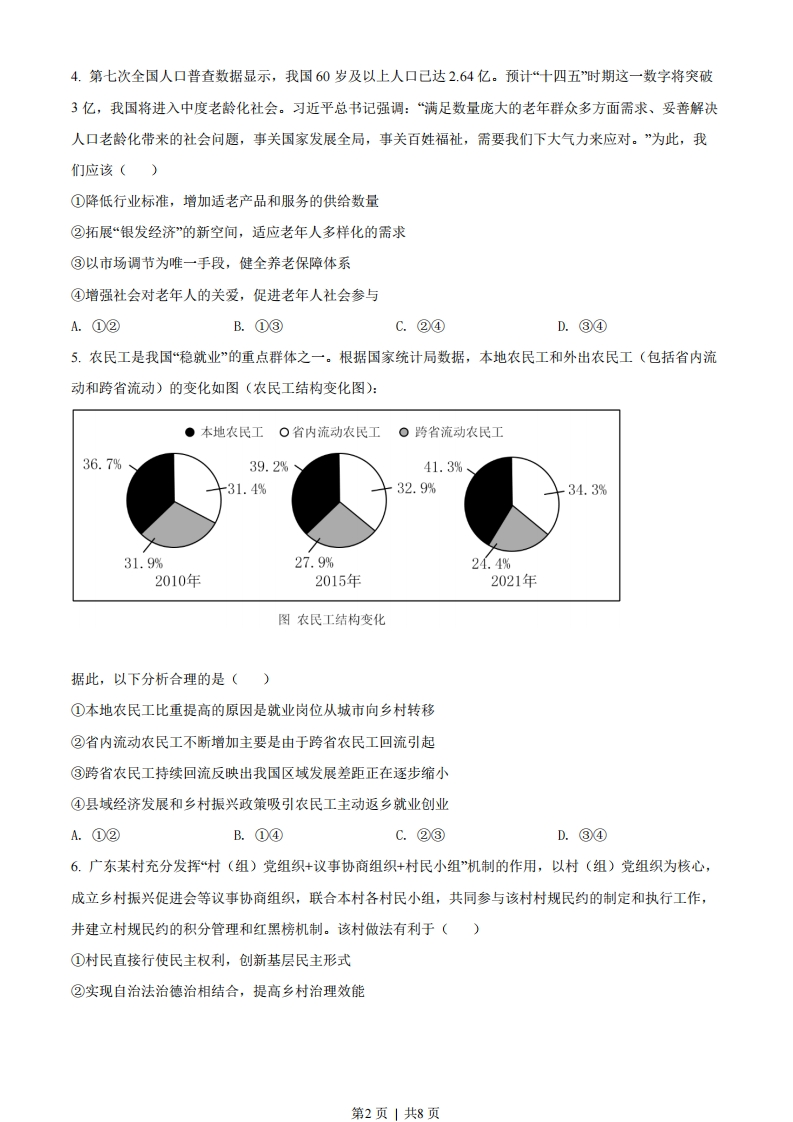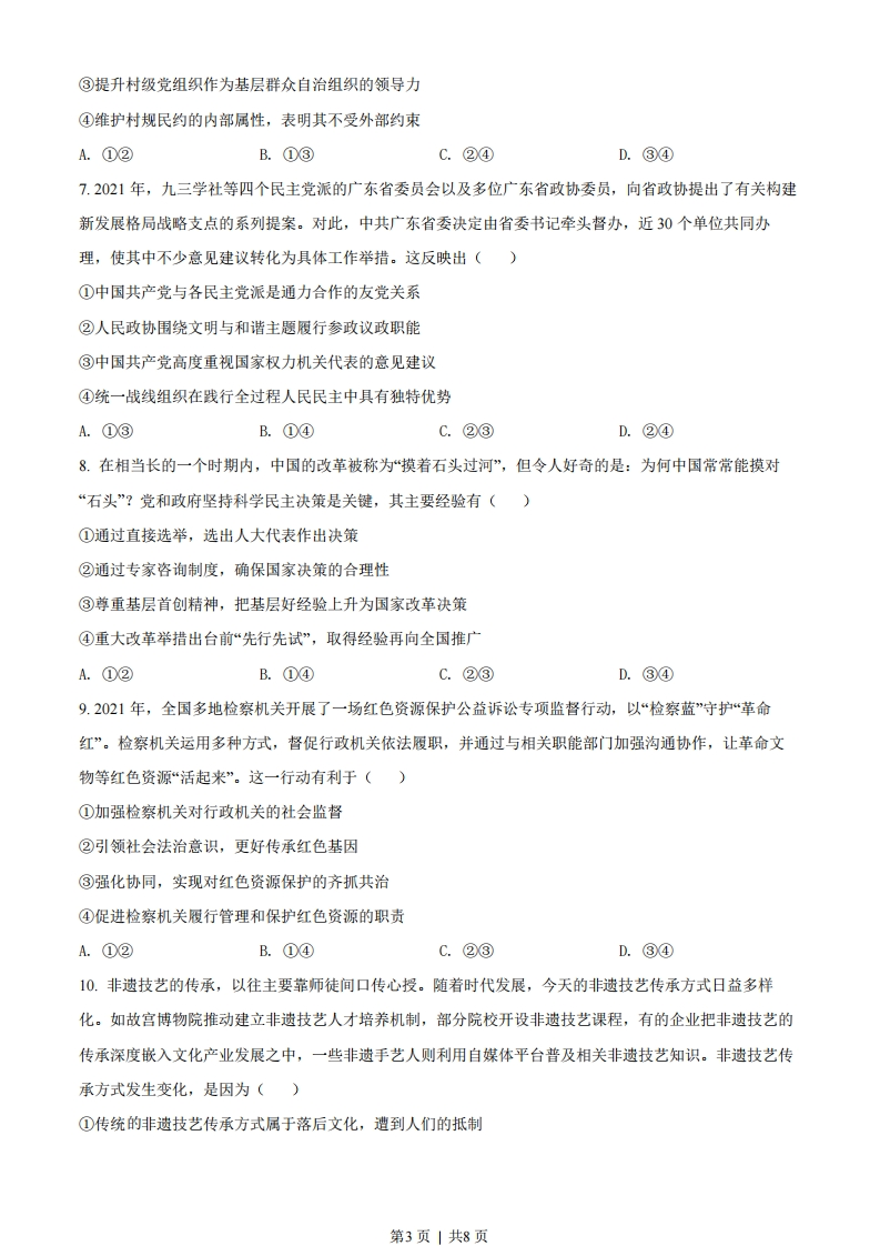 2022年广东省普通高中学业水平选择性考试思想政治一、选择题:本大题共16小题,每小题3分,共48分,在每小题给出的四个选项中,只有一项是符合题目要求的。1.在人类历史长河中,货币形式(包括贵金属、纸币等)逐步发生着演变。在网络课堂《神奇的货币》中,某老师在讲述货币形式演变历史之前,给出三张图片,同学们纷纷留言。其中观点正确的是()唐代银铤人民币纸币数字人民币A.货币形式演变的根本原因在于科技进步B.虽然货币的形式不同,但都可以充当流通手段C.电子货币的制作成本很低,便于任意发行D.任何国家的货币发生贬值时,其汇率都可以保持稳定2.“粤贸全球”是广东省的一项重要工程,通过举办系列境外展会和经贸活动拓展国际市场。为应对新冠肺炎疫情变化,2020年推出线上展览平台和经贸对接会,通过补贴等方式支持中小企业网上洽谈,稳住订单:2021年推出“粤贸全国”,以线下展会为主,线上同步发力,鼓励企业抱团参展,突出展示广东优势品牌。该工程有利于()①主动融入新发展格局,推进广东省经贸高质量发展②鼓励广东外贸企业从以出口为主转为以内销为主③利用行政手段帮扶广东中小企业,提高市场竞争力④促进广东企业营销方式从线下为主向线上线下融合转变A.①②B.①④C.②③D.③④3.地方消费券是指由地方各级政府在本级预算中安排发放的用于兑换商品(或服务)的有价支付凭证。2022年,为了应对新冠肺炎疫情对经济的影响,某地即将发放一批消费券。请你设计这批消费券,使其促消费助企业的效果最好。下列组合最优的是()①券面设计为一次消费满100元抵扣20元和满200元抵扣40元两种②券面设计为一次消费满200元抵扣20元和满400元抵扣40元两种③消费券主要用于价格每下降一个单位,销量增幅更大的商品④消费券主要用于价格每下降一个单位,销量增幅很小的商品A.①③B.①④C.②③D.②④第1页|共8页