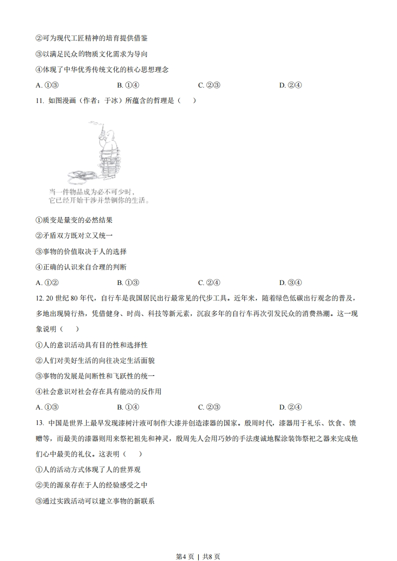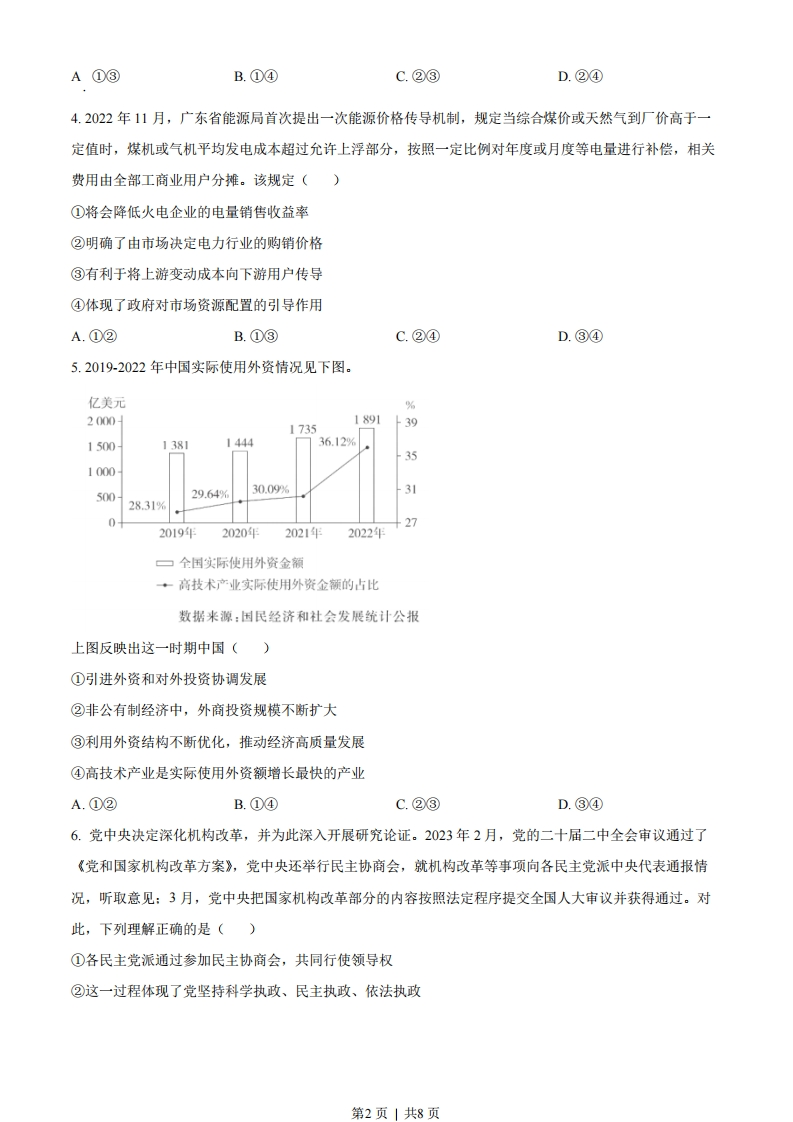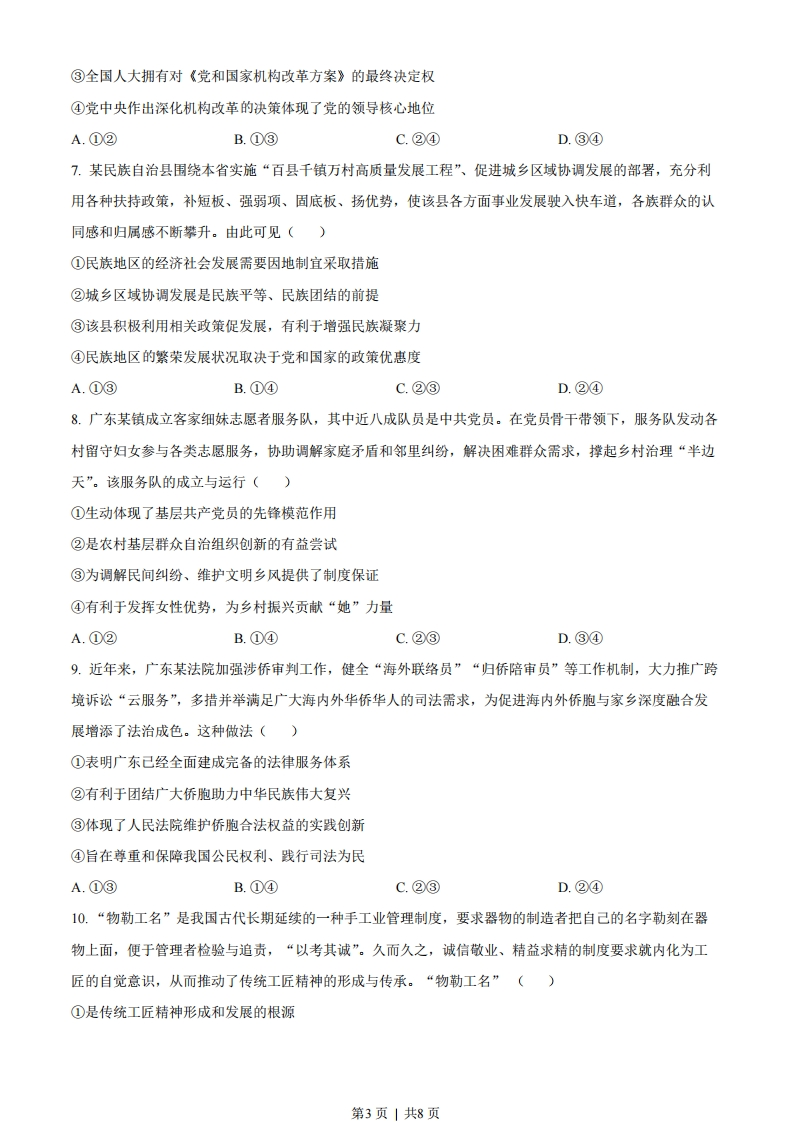 2023年普通高中学业水平选择性考试(广东卷)思想政治本试卷满分100分,考试时间75分钟。一、选择题:本大题共16小题,每小题3分,共48分。在每小题给出的四个选项中,只有一项是符合题目要求的。1.1956年,党的八大提出尽快把我国从落后的农业国变为先进的工业国:1987年,党的十三大提出把我国建设成为富强、民主、文明的社会主义现代化国家:2017年,党的十九大提出把我国建设成为富强民主文明和谐美丽的社会主义现代化强国:2022年,党的二十大提出以中国式现代化全面推进中华民族伟大复兴。从这一探索历程可见()①实现现代化彰显了中国共产党人的初心和使命②实现现代化是中国共产党不懈奋斗的最高理想③中国式现代化的提出有其历史逻辑和实践逻辑④中国式现代化是发展中国家实现现代化的必由之路A.①③B.①④C.②③D.②④2.党的二十大审议通过了《中国共产党章程(修正案)》,把党的十九大以来习近平新时代中国特色社会主义思想新发展写入党章,以更好反映以习近平同志为核心的党中央推进党的理论创新、实践创新、制度创新成果。这一修改()①全面具体地总结了十八大以来党和国家各项事业的伟大成就②为更好坚持和发展中国特色社会主义提供了制度保障和法律依据③更加彰显习近平新时代中国特色社会主义思想的真理力量和实践伟力④适应形势和任务的发展变化,有利于更好发挥党章的规范和指导作用A.①②B.①④C.②③D.③④3.2022年1月,企业职工基本养老保险全国统筹信息系统启动。截至2022年6月底,全国所有省份完成基金财务系统部省对接,企业职工基本养老保险基金“一本账”基本形成,在全国范围内实现“五统一”,即统一缴费政策、统一基金收支管理、统一待遇调整、统一信息系统、统一经办服务管理。这有利于()①实现数据集中管理,提升数据要素价值②加大社会保险费对个人所得税的抵减作用③实时查询缴费信息,在线申领社会救助金④改善公共服务能力,推动养老保险制度公平化第1页」共8页