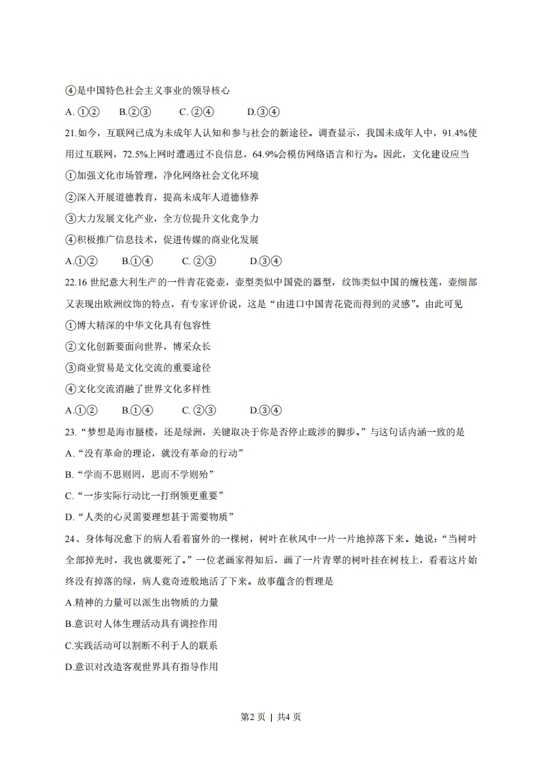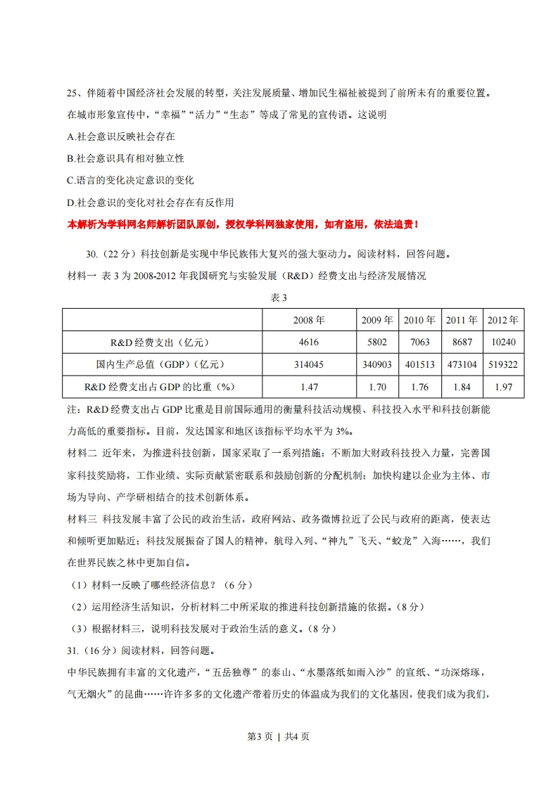 2013年普通高等学校招生全国统一考试(山东卷)文科综合政治试题17、山东省自2012年开始试点推行政策性农业保险,保险费用由政府承担80%,农户承担20%。在保险期间,因暴雨、干旱等人力无法抗拒的自然灾害对投保农产品造成的损失,由保险公司根据受灾程度给予农民补偿。政策性农业保险的实施有利于(2)降低生产成本,确保农民稳定增收B.优化资源配置,转变农业发展方式C完善初次分配,实现社会公平正义D.降低生产风险,切实保护农民利益18、2012年,我国综合运用各种手段对国民经济进行调控,实现了预期调控目标。下列调控目标、调控政策、具体措施三者对应最恰当的是A.控物价一一稳健的货币政策一一严控对高耗能、高污染行业的贷款B稳增长一一积极的财政政策一一减轻服务业和小微型企业税收负担C.调结构一一积极的财政政策一一下调金融机构一年期存贷款基准利率D.惠民生一一稳健的货币政策一一加大对战略性新兴产业财政支持力度19、2013年3月,新一轮国务院机构改革正式启动,内容之一是实行铁路政企分开,组建国家铁路局和中国铁路总公司,不再保留铁道部。这项改革旨在A协调政府与企业的关系,减少市场监管职能B进一步加快政府职能转变,扩大政府职权C.强化对权力的监督,提高政府工作的透明度D理顺政府与市场的关系,建设服务型政府201992年,党的十四大明确提出了建立社会主义市场经济体制的改革目标。20多年来,党坚持理论创新和实践创新,使我国实现了从高度集中的计划经济体制向充满活力的社会主义市场经济体制的历史转折。这体现了中国共产党①坚持科学执政和民主执政②具有与时俱进的执政能力③具有组织社会主义经济建设的职能第1页|共4页