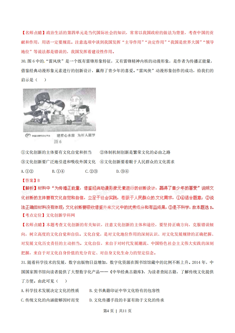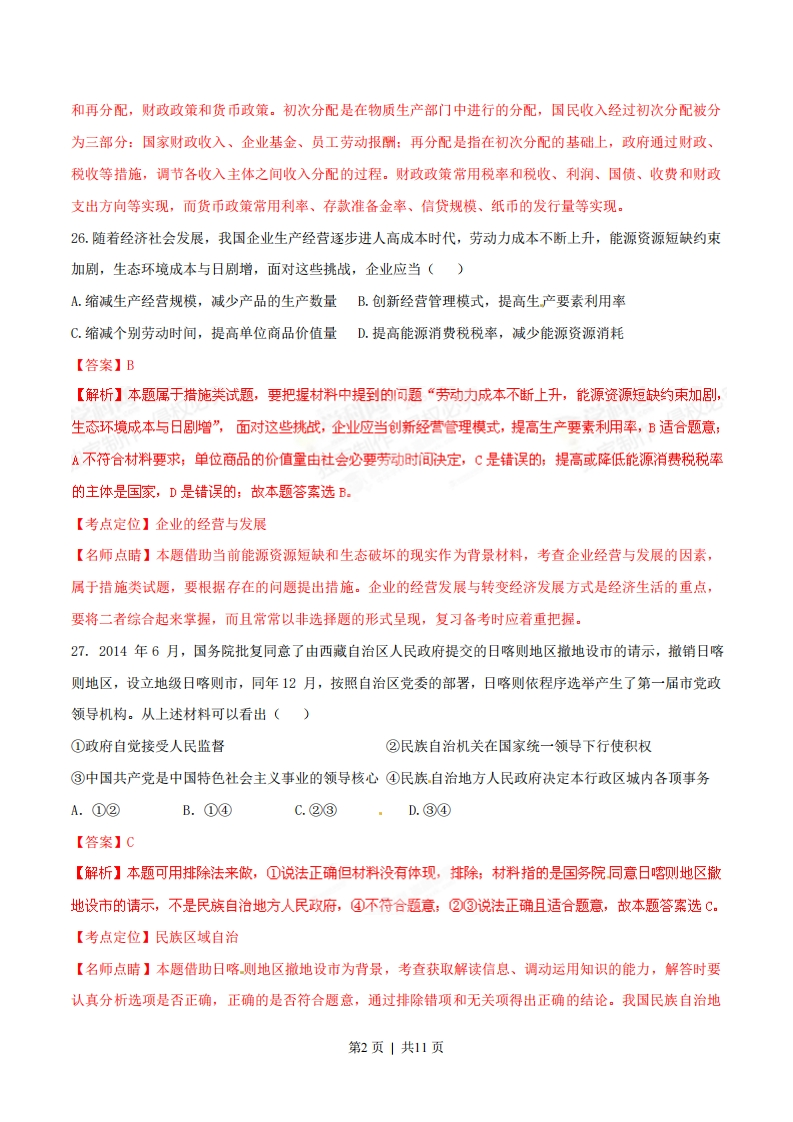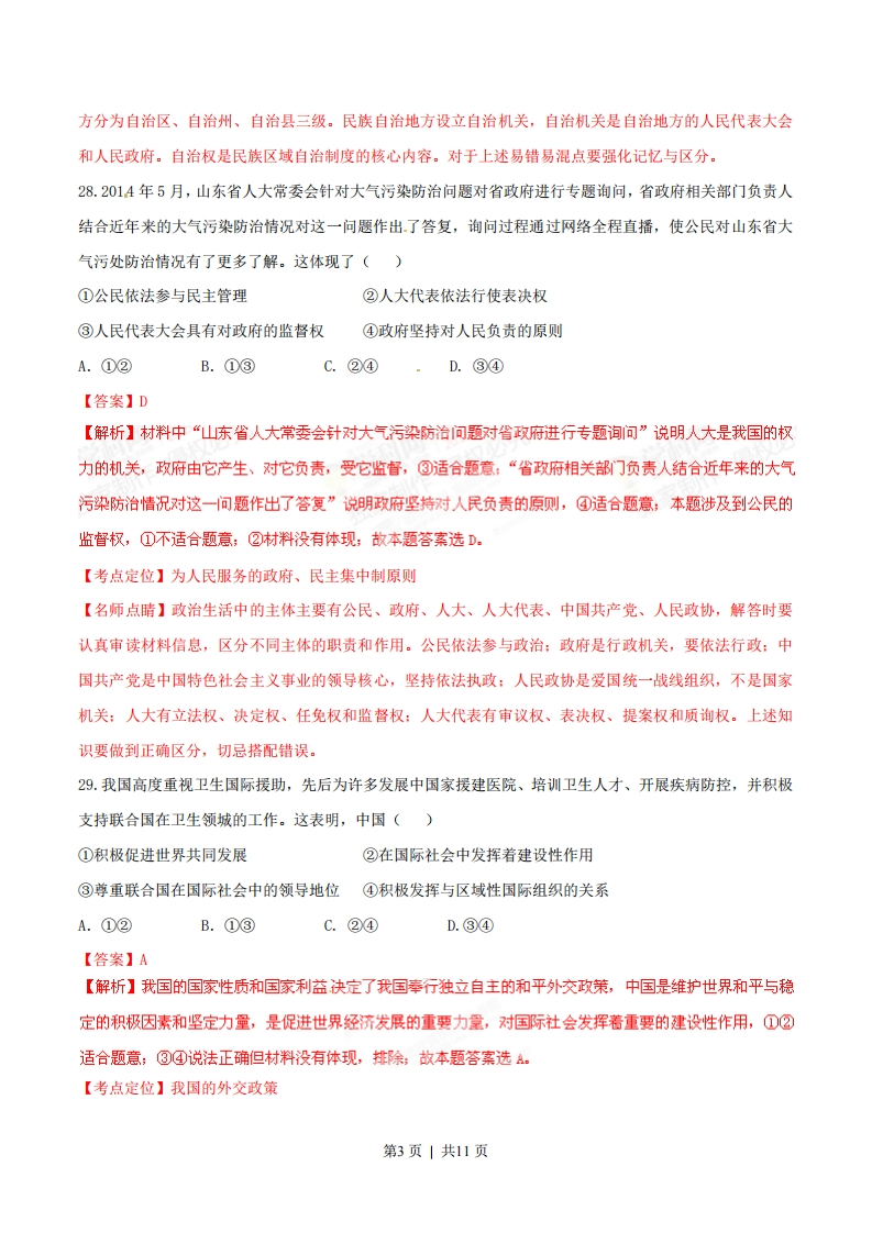 2015年普通高等学校招生全国统一考试文科综合能力测试政治(山东卷)一、选择题:本题共12小题,每小题4分,共48分。在每小题给出的四个选项中,只有一项是符合题目要求的。24.近年来,在我国与越南,新加坡、俄罗斯等国家的贸易中,使用人民币评价、结算的业务量不断上升,从2010年的0.51万亿元上升到2014年的6.55万亿元。对外贸易中使用人民币计价、结算,有助于()A.我国外贸企业规避汇率风验B.发挥人民币的贮藏手段职能C.我国外贸企业加快转型升级D.增强人民币国际市场购买力【答案】A【解析】对外贸易中使用人民币计价、结算,有助于我国外贸企业规避汇率风险,A适合题意;具有贮藏手段职能的货币必须是金银条块或金属铸币,人民币不具备贮藏手段职能,B是错误的:C说法正确但与题意无关:用人民币计价、结算并没有改变人民币国际市场购买力,D是错误的。【考点定位】结算方式、货币的职能学科网【名师点晴】本题通过对外贸易中使用人民币计价、结算为背景材料,考查这样做的现实意义和对教材基础知识的理解和运用。对外贸易中使用人民币计价、结算,有助于规避因汇率变动而产生的风险,但是并没有改变国际购买力:而且要注意区分货币的五种职能,人民币主要是代替金属货币执行流通手段和支付手段的职能,不具备贮藏手段职能。25,国务院决定,2015年我国城乡居民基本医疗保险财政补助标准由2014年的每人每年320元提高到380元,下列选项中,对国务院的这一决定理解正确的是()A.提高医疗补助标准,优化城乡居民的消费结构B.健全初次分配机制,协调国家与个人的利益关系C.加大再分配力度,提高城乡居民基本医疗保障水平D.增加货币供应量,提高城乡居民基本医疗保险筹资水平【答案】C【解析】解答本题的关键是把握关键词“城乡居民基本医疗保险财政补助标准提高”,这属于再分配注重公平的表现,有利于提高城乡居民基本医疗保障水平,C适合题意,排除:A中的优化消费结构不适合题意:这样做并不是增加货币供应量,D是错误的:故本题答案选C.【考点定位】实现收入分配的公平【名师点睛】本题借助基本医疗保险财政补助标准的提高考查调动运用知识的能力,要正确区分初次分配第1页|共11页