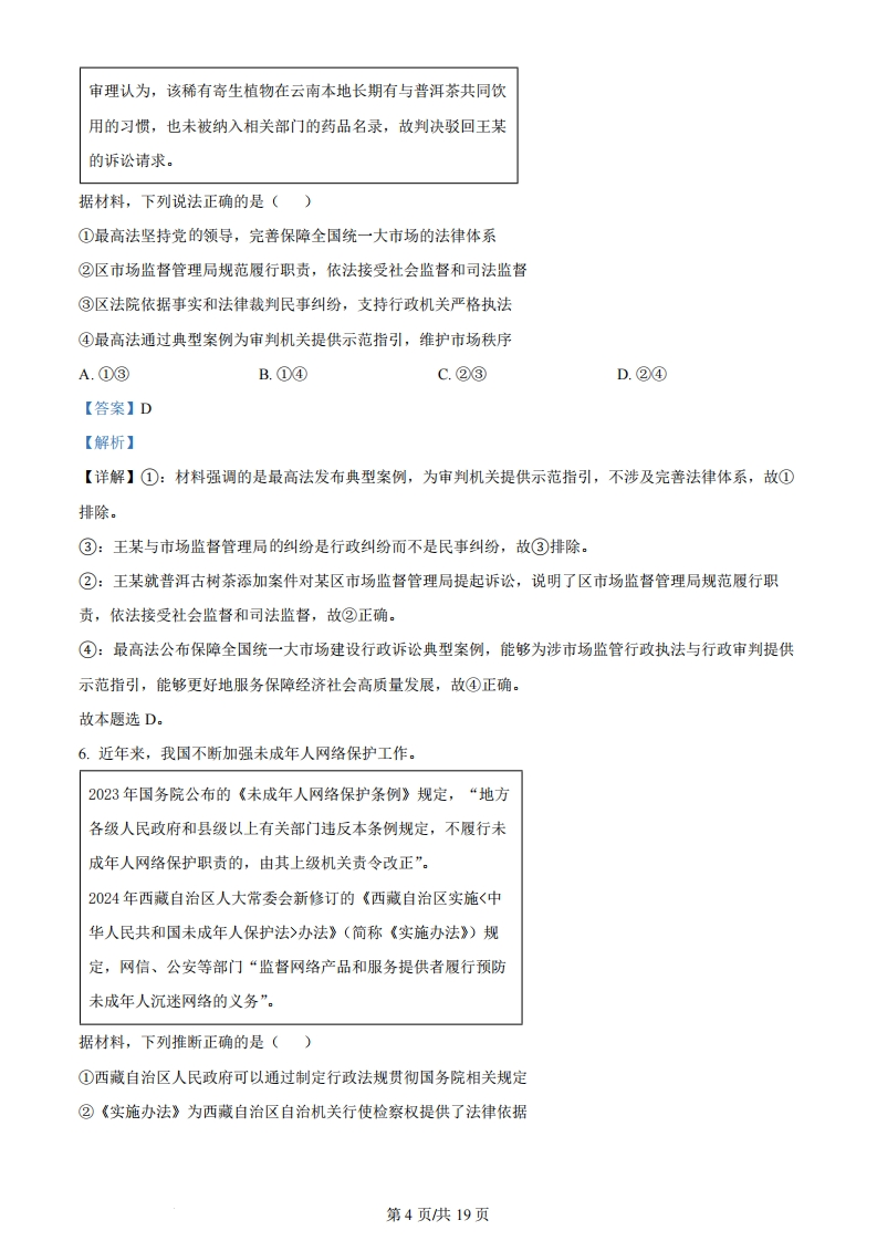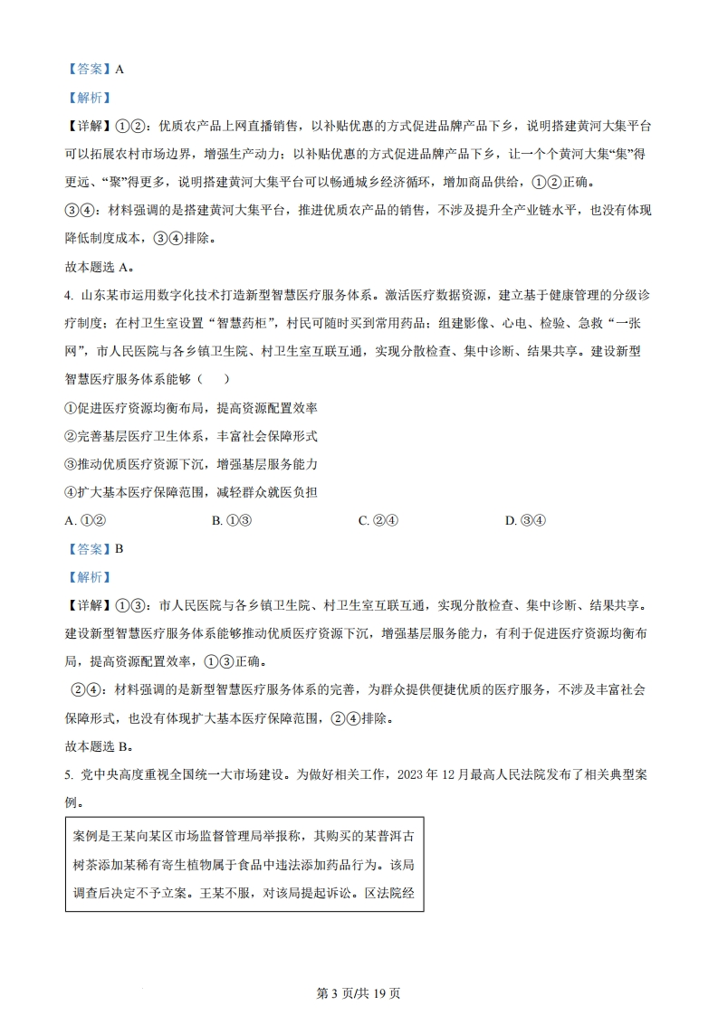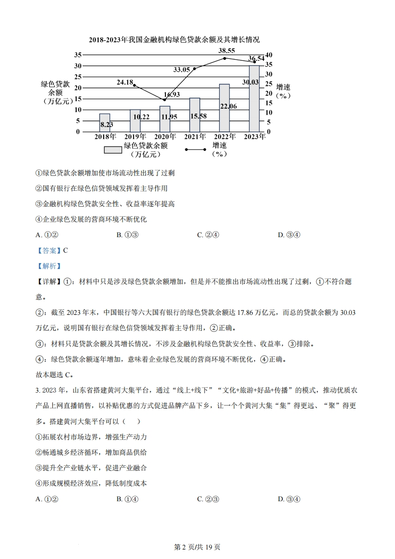 2024年全省普通高中学业水平等级考试思想政治注意事项:1.答卷前,考生务必将自己的姓名、考生号等填写在答题卡和试卷指定位置。2.回答选择题时,选出每小题答案后,用铅笔把答题卡上对应题目的答案标号涂黑。如需改动,用橡皮擦干净后,再选涂其他答案标号。回答非选择题时,将答案写在答题卡上。写在本试卷上无效。3。考试结束后,将本试卷和答题卡一并交回。一、选择题:本题共15小题,每小题3分,共45分。每小题只有一个选项符合题目要求。1.新中国成立后,毛泽东提出,“中国应当对于人类有较大的贡献”。新的历史条件下,习近平指出,“只要是对全人类有益的事情,中国就应该义不容辞地做,并且做好”。下列选项能够体现材料主旨的是()①坚持胸怀天下是中国共产党百年奋斗的重要历史经验②人类的前途命运应该由世界各国人民来把握和决定③中国式现代化展现了不同于西方现代化模式的新图景④吸收借鉴人类文明优秀成果,中国才能更好地赢得未来A.①③B.①④C.②③D.②④【答案】A【解析】【详解】①③:毛泽东和习近平的话都强调中国对世界的贡献,坚持胸怀天下是中国共产党百年奋斗的重要历史经验,中国式现代化展现了不同于西方现代化模式的新图景,为世界贡献了中国智慧中国方案,①③符合题意。②④:材料强调中国对世界的贡献,不涉及人类的前途命运应该由世界各国人民来把握和决定,不涉及吸收借鉴人类文明优秀成果,中国才能更好地赢得未来,②④排除。故本题选A。2.贷款余额是指在某一时间点上银行尚未收回的各类贷款本金总额,反映银行的信贷规模。截至2023年末,中国银行等六大国有银行的绿色贷款余额达17.86万亿元。图是2018-2023年我国金融机构绿色贷款余额及其增长情况。据材料,可以推断出()第1页供19页
