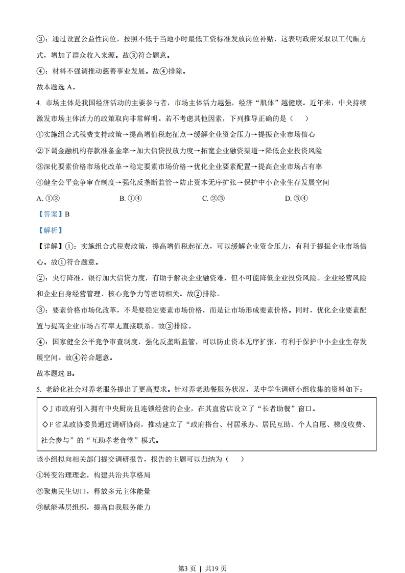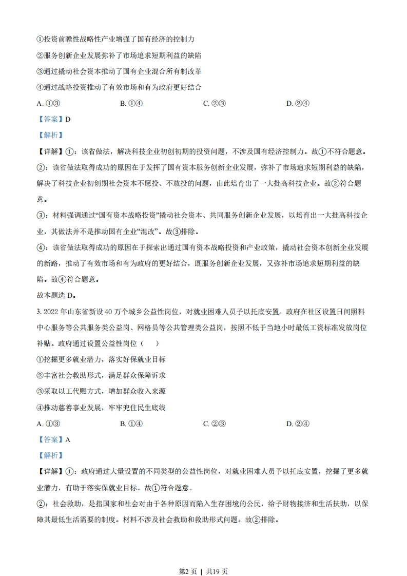 山东省2022年普通高中学业水平等级考试思想政治注意事项:1.答卷前,考生务必将自己的姓名、考生号等填写在答题卡和试卷指定位置。2.回答选择题时,选出每小题答案后,用铅笔把答题卡上对应题目的答案标号涂黑。如需改动,用橡皮擦干净后,再选涂其他答案标号。回答非选择题时,将答案写在答题卡上。写在本试卷上无效。3。考试结束后,将本试卷和答题卡一并交回。一、选择题:本题共15小题,每小题3分,共45分。每小题只有一个选项符合题目要求。1.马克思认为,在未来的社会主义制度中,社会生产力的发展将如此迅速,生产将以所有人的富裕为目的。习近平指出,共同富裕是全体人民共同富裕,是人民群众物质生活和精神生活都富裕,不是少数人的富裕,也不是整齐划一的平均主义。关于共同富裕,下列理解正确的是()A.消除社会基本矛盾是实现共同富裕的必由之路B.建设高福利国家是实现共同富裕的根本路径C.促进共同富裕和促进人的全面发展是高度统一的D.共同官裕会随社会生产力的迅速发展而自发实现【答案】C【解析】【详解】A:消除社会基本矛盾表述错误。社会基本矛盾贯穿人类社会始终。故A排除。B:国家的福利水平应该与国家经济社会发展相适应,建设高福利国家如果不与国家经济社会发展相适应,反而不利于实现共同富裕,因此该选项的说法错误,故B排除。C:共同富裕是全体人民共同富裕,是人民群众物质生活和精神生活都富裕,促进人民共同富裕,有助于以促进人的全面发展,而促进人的全面发展也有助于实现共同富裕。促进共同富裕和促进人的全面发展是高度统一的。故C符合题意。D:共同富裕的实现,离不开生产力的迅速发展,但不会自发实现,需要加强国家宏观调控。故D排除。故本题选C。2.在从“0”到“1”的原始创新成果孵化期,企业迫切需要资本支持,但因投资风险高,融资困难。某省探索出以“国有资本战略投资”撬动社会资本、共同服务创新企业发展的新路,通过产业政策和国有资本投资,解决了科技企业初创期社会资本不愿投、不敢投的问题,在前瞻性战略性产业“育种育苗”,由此培育出了一大批高科技企业。该省做法取得成功的原因在于,国有资本()第1页」共19页