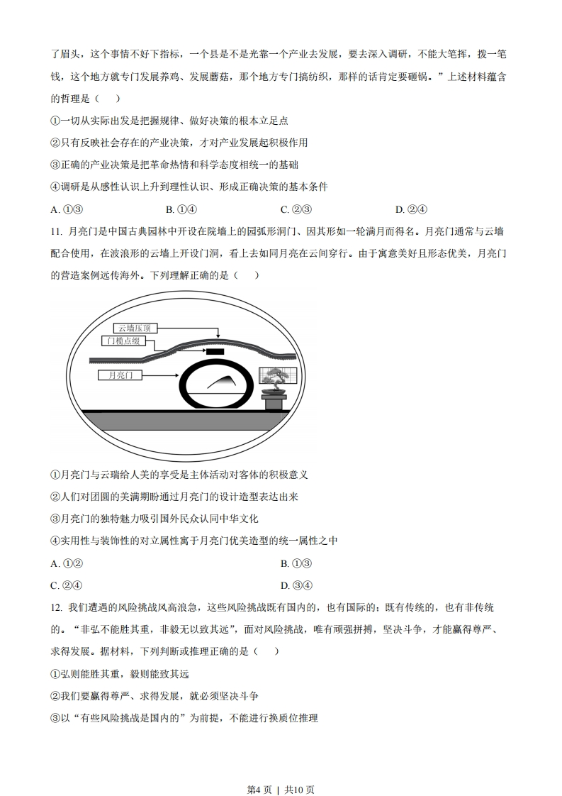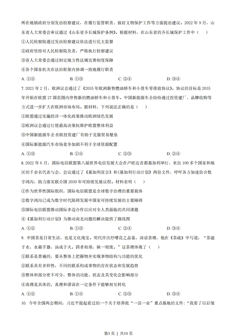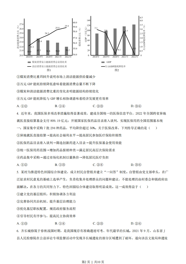 2023年全省普通高中学业水平等级考试思想政治注意事项:1.答卷前,考生务必将自己的姓名、考生号等填写在答题卡和试卷指定位置。2.回答选择题时,选出每小题答案后,用铅笔把答题卡上对应题目的答案标号涂黑。如需改动,用橡皮擦干净后,再选涂其他答案标号。回答非选择题时,将答案写在答题卡上。写在本试卷上无效。3.考试结束后,将本试卷和答题卡并交回。一、选择题:本题共15小题,每小题3分,共45分。每小题只有一个选项符合题目要求。1.从马克思恩格斯的“为绝大多数人谋利益”到李大钊的“为大多数人谋幸福”,从毛泽东的“全心全意为人民服务”到习近平的“为民造福”,共产党人始终心怀人民群众,把群众的事一件一件办好。下列表述与材料主旨相同的是()①人民,只有人民,才是创造世界历史的动力②人民对美好生活的向往,就是我们的奋斗目标③尊重人民主体地位,尊重人民首创精神、拜人民为师④全面小康、摆脱贫困是我们党给人民的交代A.①②B.①③C.②④D.③④2.2022年,全民健身“热气腾腾”。滑雪、滑冰、冰球,“带动三亿人参与冰雪运动”的愿望己然成为现实:贵州黔东南、福建泉州、河南新乡,乡村篮球赛为乡村振兴注入新力量:骑行、掷飞盘、玩腰旗橄榄球,户外运动蓬勃发展:“全民健身线上运动会”“云走齐鲁”在线健身成为新的生活方式。全民健身的开展可以()①拓展体育消费场景,促进体育产业转型升级②增加体育用品支出,推动居民消费结构优化③丰富体育服务供给,实现城乡公共服务均等化④赋能乡村文化振兴,推动一二三产业融合发展A.①②B.①④C.②③D.③④3.图1是2018-2022年我国煤煤和清洁能源消费量占能源消费总量的比重变化情况,图2是2018-2022年我国GDP、万元GDP能耗降低率变化情况。据此,下列推断正确的是()第1页」共10页