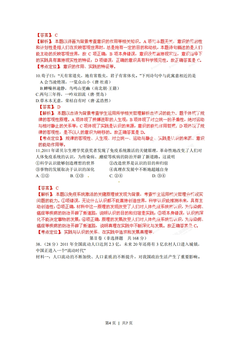 2012年高考安徽文综政治试卷解析(教师版)【试卷总评】本套试卷中的政治试题分选择题与非选择题,选择题的考点分布较广,覆盖面较大,背景材料鲜活,有图表、漫画、古诗等,设问角度独特,体现了学科内综合的特点,贴近学生、贴近实际。非选择题能力立意明显,有安徽地方特色,如第39题。试题整体难度不大,区分度一般。第卷(选择题共132分)本卷共33小题,每小题4分,共132分。在每题给出的四个选项中,只有一项是符合题目要求的。1.2012年我国经济社会发展要突出把握好稳中求进的工作总基调。下列选项中符合这一要求且表述正确的是A.运用经济手段一国内生产总值增长目标略微调低为7.5%B.运用行政手段—调整金融机构存款准备金率C.采取积极的财政政策—规范并引导民间融资健康发展D.采取稳健的货币政策一落实和完善支持小微企业的税收优惠政策【答案】A【解析】本题以我国宏观经济形势为背景考查宏观调控手段的有关知识,考查学生正确判断经济手段与行政手段的区别。A项正确,将我国国内生产总值增长目标微调为7.5%,属国家通过经济计划的调整来影响和调节经济活动,属于宏现调控的经济手段,调整金融机构存款准备金率属于货币玫策的内容,是经济手段,故B项排除:C项错误,国家规范并引导民间融资健康发展应属于法律手段和行攻手段范畴;D项错误,税收优惠政策属于财政政策而非货币政策,因此正确答案为A。【考点定位】宏观调控的手段、财政攻策、货币政策等。2.图1反映的是在商品价格和其它因素不变时,收入(M0变化引起A商品需求量(X)变化的曲线。下列判断正确的有①随着收入增加,A商品需求量相应增加②随着收入增加,A商品需求量相应减少③随着收入增加,A商品需求量的增加幅度递增④随着收入增加,A商品需求量的增加幅度递减A.①③B.①④C.②③D.②④第1页1共7页