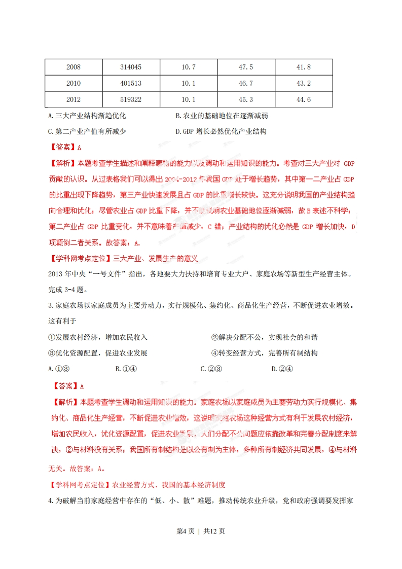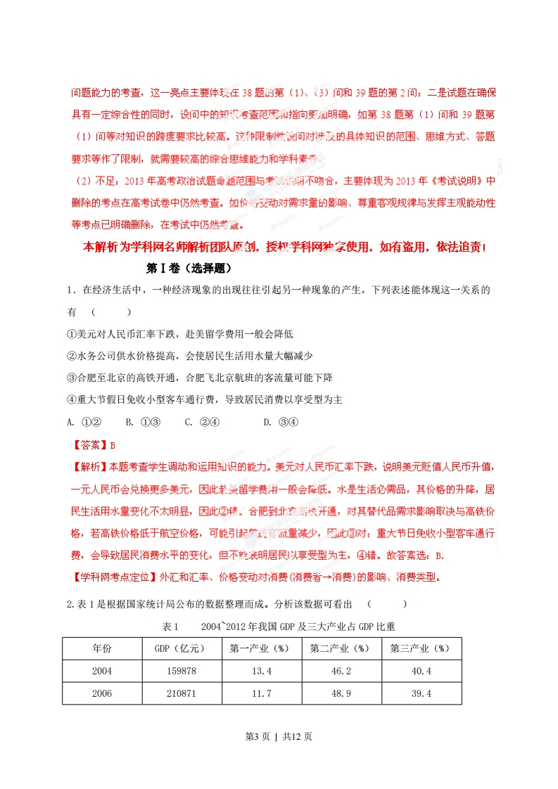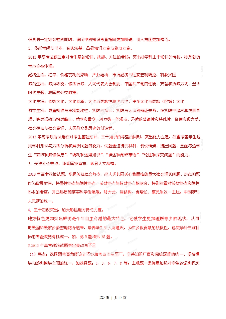 2013年普通高等子校招王全国统一考试(安徽卷)文科综合能力测试-政治部分山东省东营市河加区第一中学:徐杰QQ:530691671说明:研究高考试题从中获取有效信息,从而发挥高考的导向作用,增强高考备考的针对性,成为2014年高三备考的重要课题。现就2013年文综试题谈谈自己的一点肤法看法。学科网试卷总评:总的来说今年文综试题较往年相比难度加大,主要体现地理部分难度明显加大,分析理解的内容增多:历史部分题目更加灵活,答题角度和深度更难以把握,答题需要更注重结合现实进行分析,而且大分值题目增多;政治部分题目难度与去年相差不大。因此今年文综科目的内容比去年难度大,可以预测文综科目的整体分数可能会比去年低。政治学科试题总评:一、2013年高考政治试题整体评价高考文综政治试题,严格遵循课程标准和《考试明》,直正做到了以教材为本,以时代为主题,以问题为截体,以人类所面临和关心的现实或重大热点问为素材,以发展为灵魂,突出科学发展、和谐发展、人文发展理念,坚持以题、能力立心,稳中求进,稳中求新,注重突出素质教育,注重探究性、创新性、开放性和时代性,体现方特色。整试题没有出现偏题、怪题和超纲题,难度适中,具有一定的区分度,不失为一份成功的卷。二、2013年高考文综政治试题的特点1.与2012年相比,2013年高考攻治试题稳中求变、稳中求新。2013年高考政治试题整体结构没有什么大的变化,依然包括11道选择题和2个主观题共5个设问,经济、攻治、文化与哲学四个模块之间选择题目的比例依然是3:3:2:3,四模块分值此例依然是28:24:20:28。题目呈现的方式依然有热点材科、漫画题、图表题、哲学名言和综合探究题。无论是结构、题型,还是分值和难度等方面,都保持了基本稳定,使考生可以在相对熟悉亲切的试题环境中以平衡的心态正常发挥。在保持相对稳定性的同时,试题力求实现适度、科学的创新,在主题集中性、内容综合性、材料简洁性、设问逻辑性等方面实现了可喜的突破。为适当减少考生阅读量,选择题题干的表述整体上更为简洁:为适当降低主观题的难题,试题在确第1页|共12页
