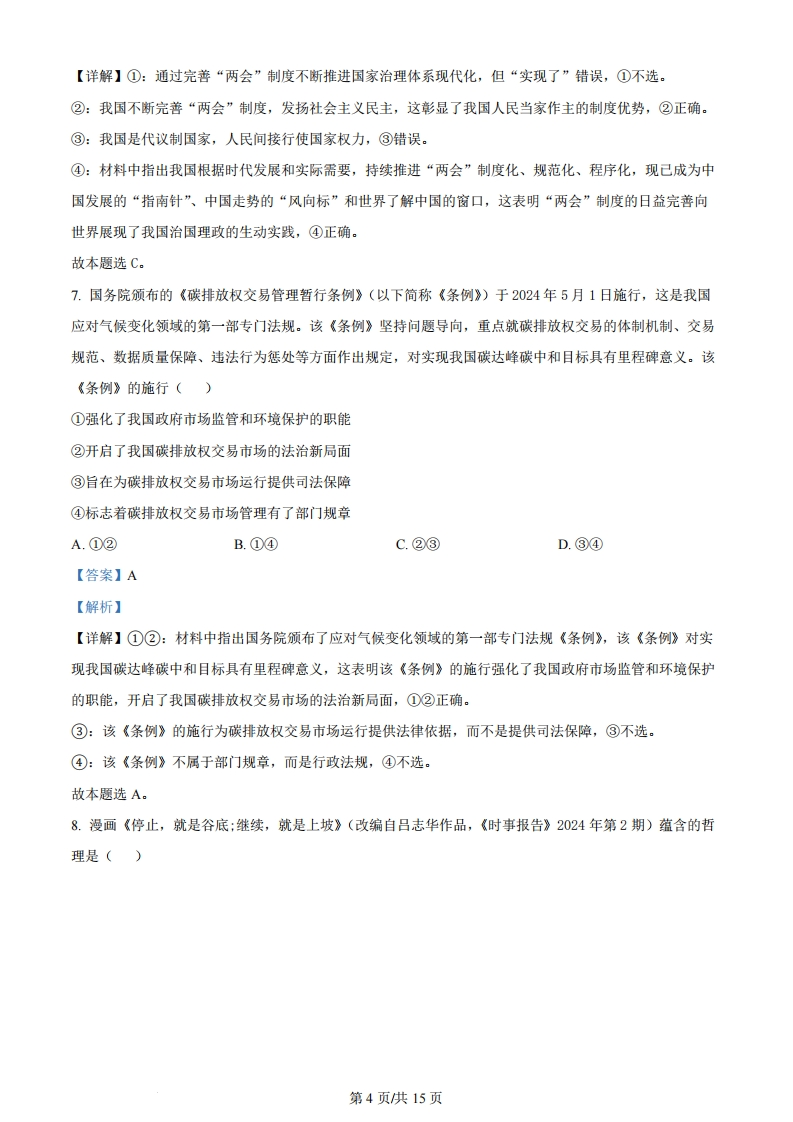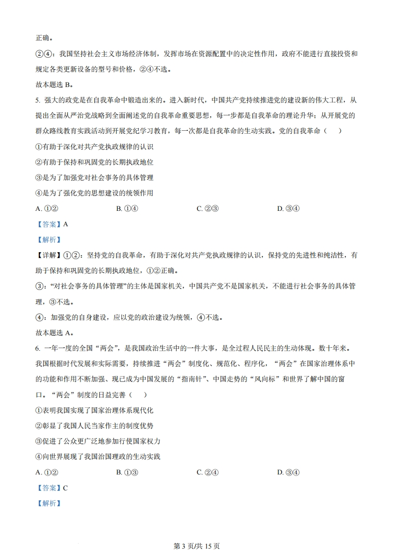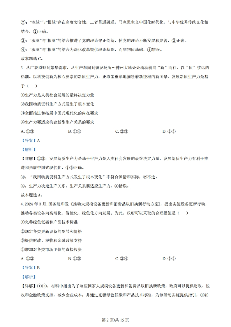 2024年普通高中学业水平选择性考试思想政治(安徽卷)一、选择题:本题共16小题,每小题3分,共48分。在每小题给出的四个选项中,只有一项是符合题目要求的。1.为了实现中华民族伟大复兴,中国共产党团结带领中国人民,浴血奋战、百折不挠,推翻帝国主义、封建主义、官僚资本主义三座大山,完成了新民主主义革命,建立了中华人民共和国。中华人民共和国的成立()A.开创了人类社会历史发展的新纪元B.实现了社会主义从理论到实践的飞跃C.标志着社会主义革命取得决定性胜利D.实现了中国向人民民主制度的伟大跨越【答案】D【解析】【详解】A:俄国十月革命的胜利,建立了世界上第一个社会主义国家,开创了人类历史的新纪元,A不选。B:俄国十月革命的胜利,实现了社会主义从理论到实践的飞跃,B不选。C:1956年三大改造的胜利完成,在中国建立了社会主义制度,标志着社会主义革命取得决定性胜利,C不选。D:1949年,中华人民共和国的成立,实现了中国向人民民主制度的伟大跨越,D正确。故本题选D2.习近平总书记指出:“马克思主义中国化时代化这个重大命题本身就决定,我们决不能抛弃马克思主义这个魂脉,决不能抛弃中华优秀传统文化这个根脉。”下列对“魂脉”与“根脉”理解正确的是()①“魂脉”与“根脉”的思想来源相同,二者一脉相承②“魂脉”与“根脉”存在高度契合性,二者贯通融通③“魂脉”与“根脉”的结合推进了党的理论守正创新④“魂脉”与“根脉”的结合为深化改革提供物质基础A.①③B.①④C.②③D.②④【答案】C【解析】【详解】①:“魂脉”与“根脉”的思想来源不同,马克思主义来自西方,中华优秀传统文化是土生土长的中国文化,①错误。第1页供15页