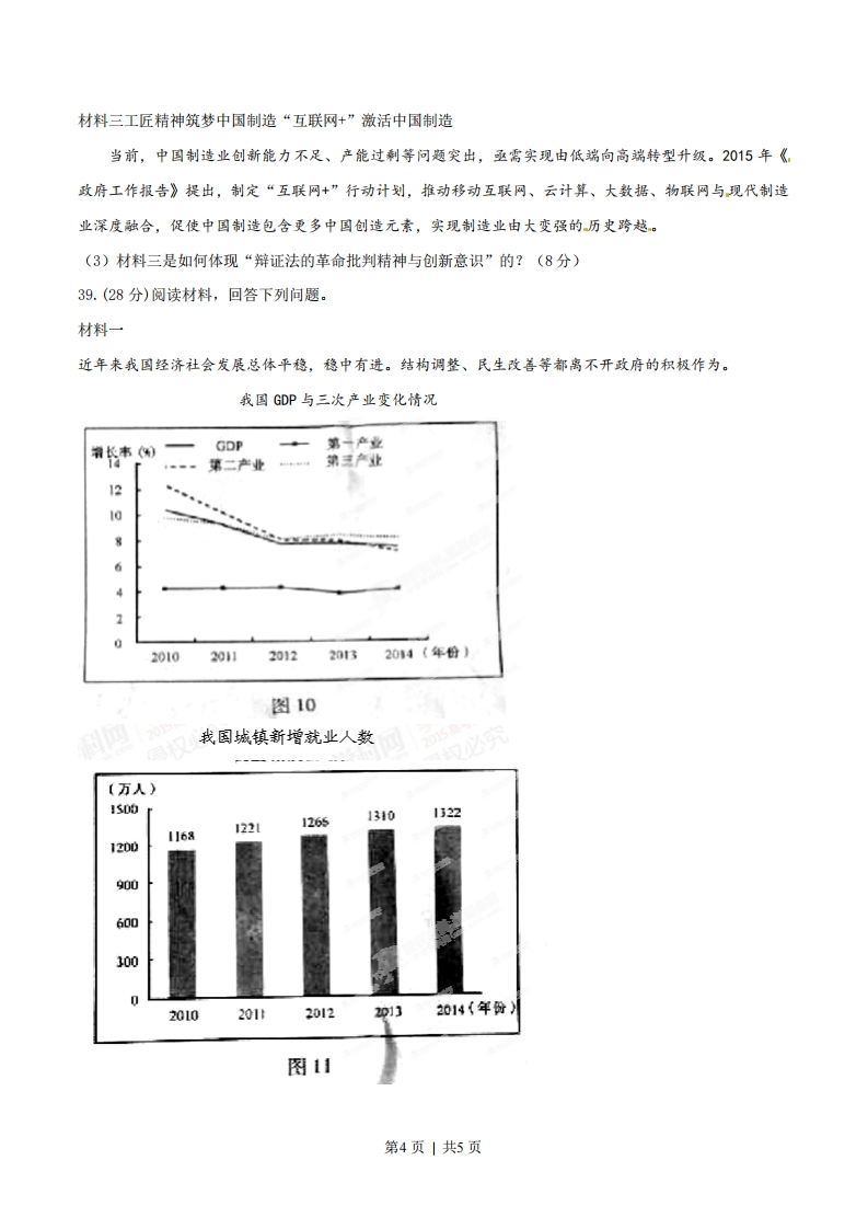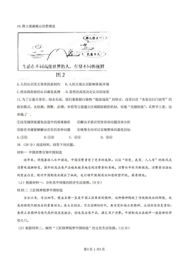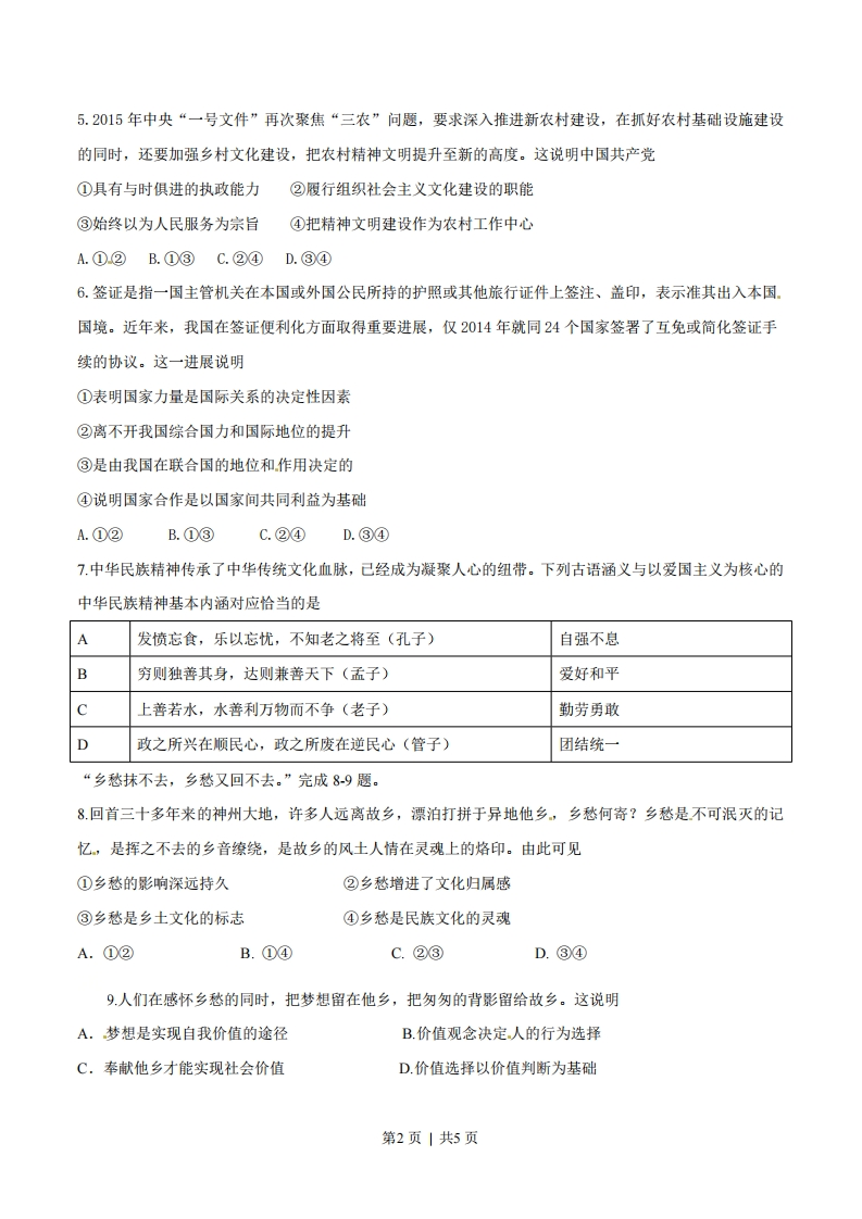 绝密★启封前2015年普通高等学校招生全国统一考试文科综合能力测试政治(安徽卷)一、选择题:本题共12小愿,每小题4分,共48分。在每小题给出的四个选项中,只有一项是符合愿目要求的。1出境游作为一种大众消费,其需求量(Q)受出境游价格(P)、居民收入(M)等因素影响。不考虑其他因素。下图中能正确反映P与Q、M与Q关系的图形有A.①③B.①④C.②③.D.②④2.2014年,我国实际使用外商直接投资1196亿美元,居世界首位。对外直接投资1029亿美元,与利用外资并驾齐驱。这表明①保持了进出口贸易平衡,不断提高开放型经济水平②可以主导国际金融市场,可以充分发挥经济的比较优势③实施“引进来”和“走出去”战略取得了重大成就④在经济发展中能够更好利用国际市场优化资源配置A.①②B.①④C.②③D.③④3.某国去年商品价格总额为20万亿元,流通中所需要的货币量4万亿元。假如货币流通速度不变,今年商品价格总额30万亿元,不考虑其他因素,理论上今年流通中所需的货币量为A.5万亿元B.6万亿元C.7.5万亿元D.10万亿元4.法律是治国之重器,良法是善治之前提。建设中国特色社会主义法治体系,坚持科学立法、民主立法,必须问法于民、立法为民,既要发挥人大代表在立法活动中的作用,又要拓宽公民有序参与立法的途径。这意味着①社会主义民主是人人享有的广泛民主②我国法律是人民意志的体现③人大代表代表人民参加行使国家权力④公民要积极依法行使立法权A.①③B.①④C.②③D.②④第1页|共5页