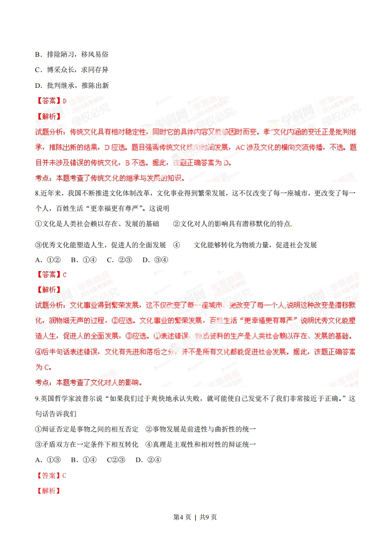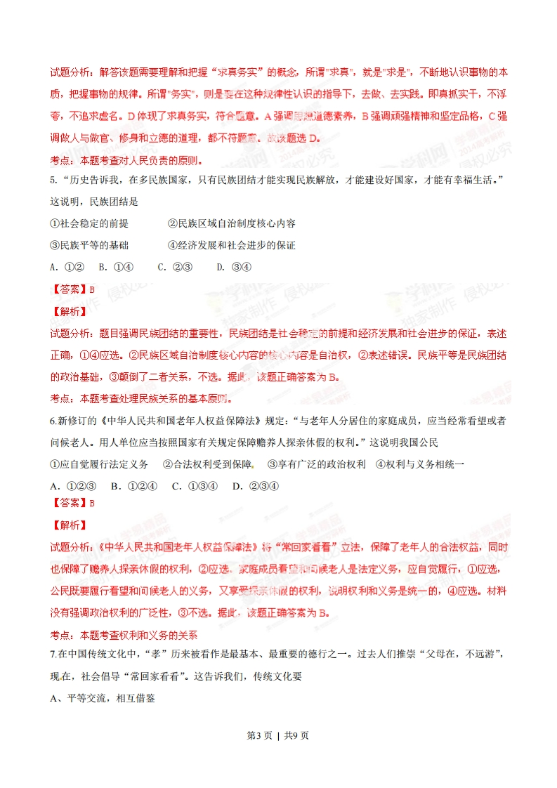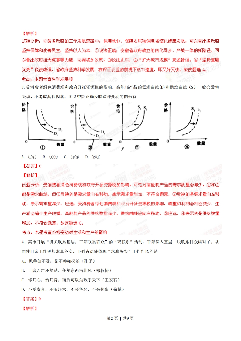 绝密★启封前2014年普通高等学校招生全国统一考试文科综合能力测试政治(安徽卷)说明:本卷为安徽卷,由学科网政治解析团队第一时间独家人工录入。一、选择题:本题共11小题,每小题4分,共44分。在每小题给出的四个选项中,只有一项是符合题目要求的。1读图1,在不考虑其他因素的前提下,甲乙两国在充分发挥自己的相对优势,进行分工与贸易,据此可以判断甲国:每人的芳动生产率一设食w千克人肉类:侧千克整点:1000千克一国:.每人的务动生产率、肉类:10千克”。44图1①甲国出口粮食比出口肉类优势大②乙国出口粮食比出口肉类优势大③甲国出口肉类比出口粮食优势大④乙国出口肉类比出口粮食优势大A.①②B.①④C.②③D.③④【答案】B中家制【解析】试题分析:本题考查学生读取和获取信急的能力,有图可知,甲国每人生产的粮食和肉类的劳动生产率与乙国相比,甲国生产的粮食是乙国的4/5,内类是乙国的1,2,可知甲每人生产粮食的劳动生产率与乙国接近,而生产肉类则远远不及乙国,生产效率是乙国的一半,故甲国出口粮食比出口肉类优势大,乙国出口粮肉类此出口粮食优势大,据此选项①④正确,②③错误,选B.70权考点:本题考查经济全球化.2.安徽省“积极探索四化同步、产城一体的新路径,确立了强化产业支撑保障就业、以完善公共服务保障安居、以有序推进农业转移人口市民化保障城镇化健康发展的工作思路。”这说明政府①坚持以人为本,创新发展理念②扩大城市规模,破解城乡二元结构③加大统筹等力度,协调城乡发展④坚持速度优先,加快城镇化的进程A.①③B.①④C.②③D.②④【答案】A第1页|共9页