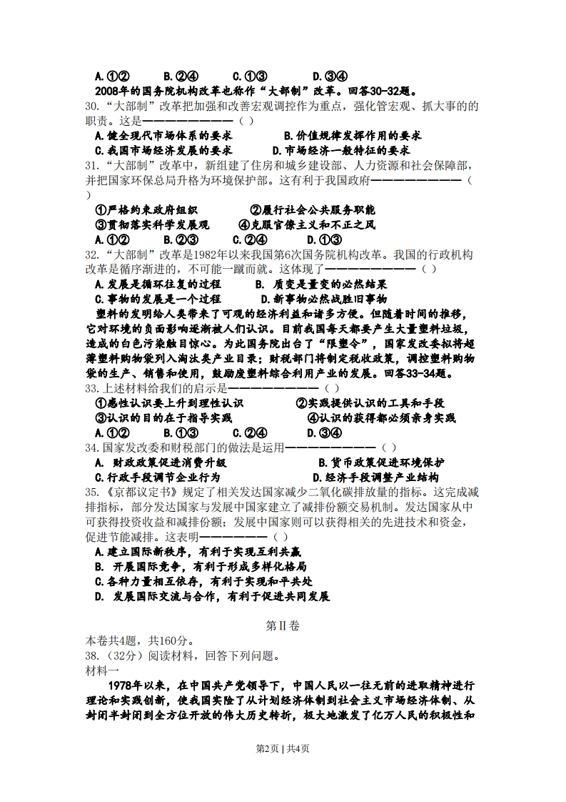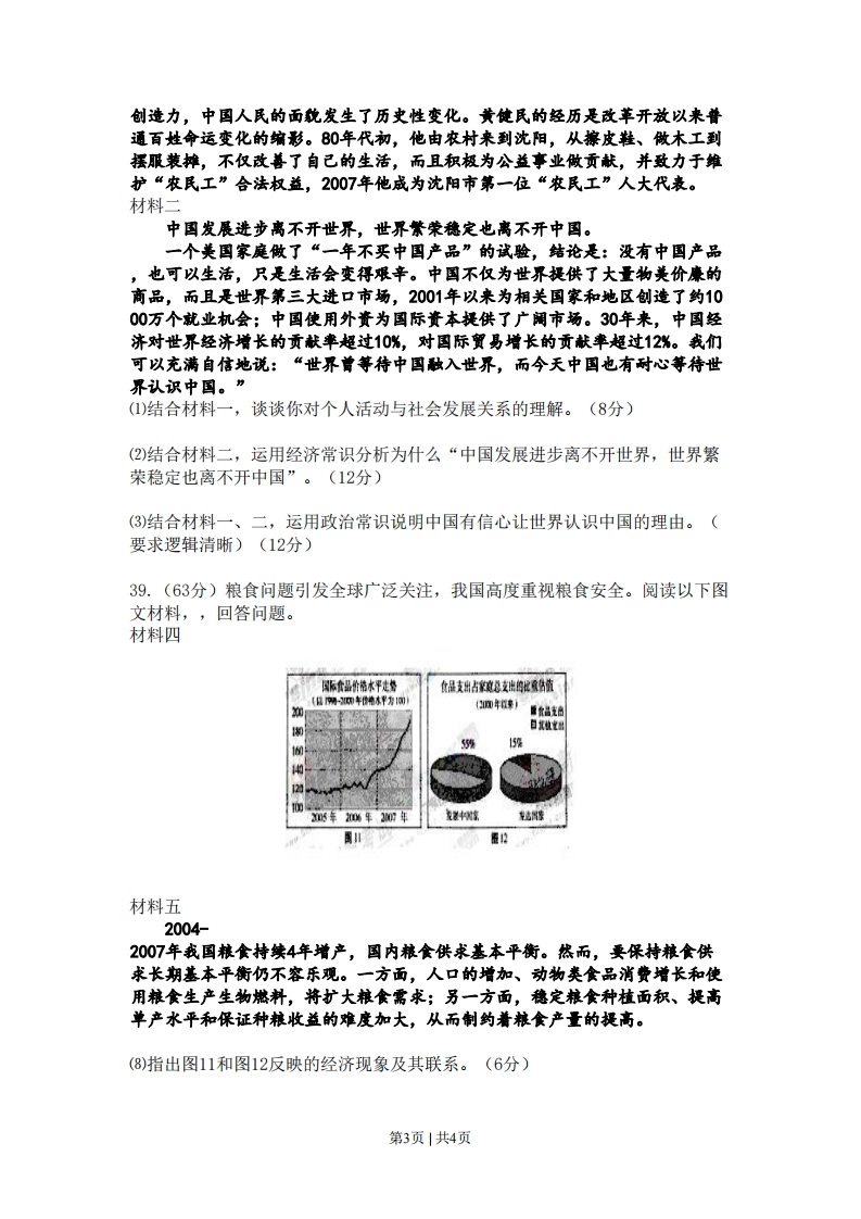 2008年普通高等学校招生全国统一考试(天津卷)文科综合能力测试第I卷本卷共35小题,每小题4分,共140分。在每题给出的四个选项中,只有一项是最符合题目要求的。25.“非学无以广才,非志无以成学”。肖志国由一个儿时捕捉萤火虫、怀揣无限遐想的孩子,历经求学苦读、艰辛探索,研发出第一代性能稳定的蓄光型自发光材料,成为发光材料专家。他的发明被誉为世界自发光史上的第三次革命。这给我们的启示是一()A现实是理想的必然结果B.现实是理想的发展方向C.理想产生于现实的需要D.理想在奋斗中变为现实26.天津“泥人张”彩塑形神毕肖、栩栩如生,被誉为民族艺术的奇葩,深受中外人士喜爱。如果该商品以人民币表示的出口价格上涨5%,其他条件不变,美元贬值后该商品以美元标价应-()A.上涨不足5%B.上涨5%以上C.下降不足5%D.下降5%以上27.汶川地震让半个亚洲震动,让整个世界震惊。党和政府及全国人民迅速应对震灾赢得世界赞誉。俄新社评论说:“一个总理在两小时内被飞赴灾区的国家,一个能够出动十万救援人员的国家,一个企业和私人捐款达到数十亿的国家,一个因争相献血、自愿抢救伤员造成交通堵塞的国家,永远不会被打垮。”这体现了一-一()①中国共产党立党为公、执政为民②个人利益与国家利益相结合的原则③我国政府是人民利益的捍卫者④从群众中来到群众中去的工作方法A.①②③B.①②④C.①③④D.②③④28.2007年初,农工党中央就农村留守儿童的教育问题提出建议,教育部给予了长达6页的书面答复,并制定了加强农村留守儿童教育工作的7项措施,有力地促进了这一问题的解决。这表明民主党派是在一()A展行文化管理的职能B.参与国家政策的执行C.发挥参政议政的作用D.参与国家权力的行使29.2008年北京奥运会是全中国人民热切期盼的盛事。漫画《情有独钟》蕴含的哲理是①现象是本质的表现②主观与客观相符合③整体与部分相互制约④内因通过外因起作用第1页|共4页
