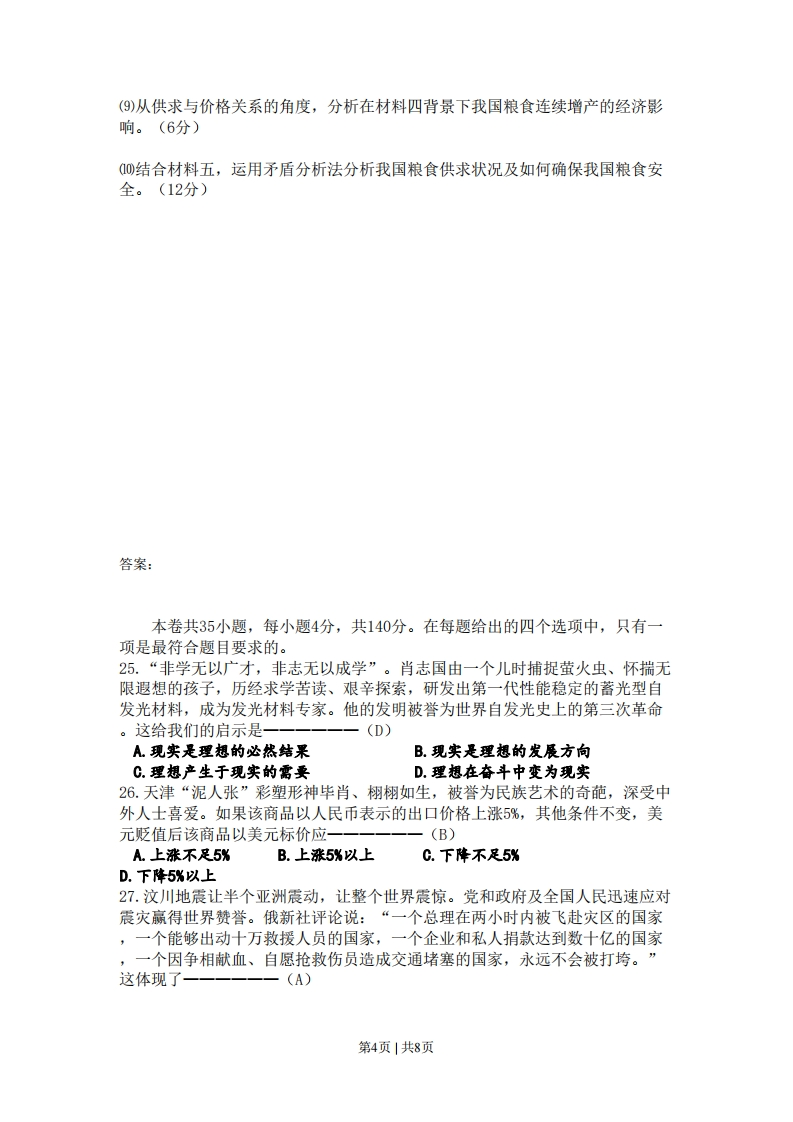 2008年普通高等学校招生全国统一考试(天津卷)文科综合能力测试第I卷本卷共35小题,每小题4分,共140分。在每题给出的四个选项中,只有一项是最符合题目要求的。25.“非学无以广才,非志无以成学”。肖志国由一个儿时捕捉萤火虫、怀揣无限遐想的孩子,历经求学苦读、艰辛探索,研发出第一代性能稳定的蓄光型自发光材料,成为发光材料专家。他的发明被誉为世界自发光史上的第三次革命。这给我们的启示是一()A现实是理想的必然结果B.现实是理想的发展方向C.理想产生于现实的需要D.理想在奋斗中变为现实26.天津“泥人张”彩塑形神毕肖、栩栩如生,被誉为民族艺术的奇葩,深受中外人士喜爱。如果该商品以人民币表示的出口价格上涨5%,其他条件不变,美元贬值后该商品以美元标价应-()A.上涨不足5%B.上涨5%以上C.下降不足5%D.下降5%以上27.汶川地震让半个亚洲震动,让整个世界震惊。党和政府及全国人民迅速应对震灾赢得世界赞誉。俄新社评论说:“一个总理在两小时内被飞赴灾区的国家,一个能够出动十万救援人员的国家,一个企业和私人捐款达到数十亿的国家,一个因争相献血、自愿抢救伤员造成交通堵塞的国家,永远不会被打垮。”这体现了一-一()①中国共产党立党为公、执政为民②个人利益与国家利益相结合的原则③我国政府是人民利益的捍卫者④从群众中来到群众中去的工作方法A.①②③B.①②④C.①③④D.②③④28.2007年初,农工党中央就农村留守儿童的教育问题提出建议,教育部给予了长达6页的书面答复,并制定了加强农村留守儿童教育工作的7项措施,有力地促进了这一问题的解决。这表明民主党派是在一()A展行文化管理的职能B.参与国家政策的执行C.发挥参政议政的作用D.参与国家权力的行使29.2008年北京奥运会是全中国人民热切期盼的盛事。漫画《情有独钟》蕴含的哲理是①现象是本质的表现②主观与客观相符合③整体与部分相互制约④内因通过外因起作用第1页|共8页