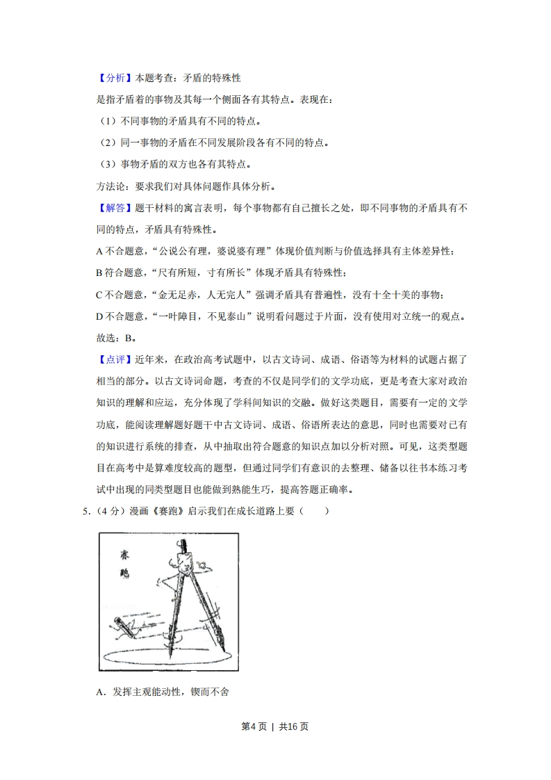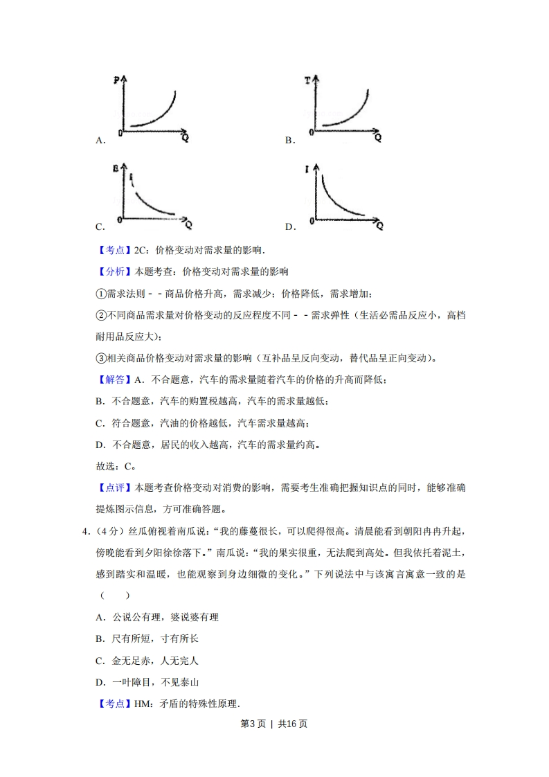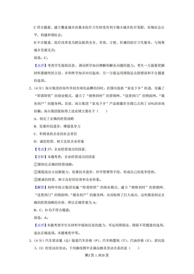 2009年天津市高考政治试卷解析版套考答案与试题解析一、选择题部分本卷共11题,每题4分,共44分,在每题列出的四个选项中,只有一项是最符合题目要求的。1.(4分)2009年初,我国政府推出新医改方案。该方案的目标是建立覆盖城乡居民的基本医疗卫生制度,为群众提供安全、有效、方便、价廉的医疗卫生服务,实现人人享有基本医疗卫生服务。这项改革有利于()A.提高收入水平,改善人民生活B.完善分配制度,调节过高收入C.实现社会公平,构建和谐社会D.统筹城乡发展,实现优势互补【考点】X7:建设社会主义和谐社会:X8:实现社会公平和正义.【分析】本题考查:实现社会公平正义:建设社会主义和谐社会(1)实现社会公平正义:坚持维护和实现公平正义,促进社会和谐,当前需要着重把握以下几个问题:第一,把维护社会公平提高到更加重要的位置。第二,正确认识和处理效率与公平的关系。第三,切实解决人民群众关心的热点难点问题。第四,以健全的制度保障社会公平正义。制度是社会公平正义的根本保证。加强保障公平正义的制度体系建设,最终建立一个以权利公平、机会公平、规则公平、分配公平为主要内容的完整的社会公平制度保障体系,使广大人民群众能够共建共享社会发展的政治经济文化成果,才能真正实现和维护社会公平正义,从而体现社会主义制度的优越性,最终促进社会和谐。(2)建设社会主义和谐社会:构建社会主义和谐社会,就是要促进人与人、人与社会、人与自然的和谐。社会主义和谐社会应该是民主法制、公平正义、诚信友爱、充满活力、安定有序、人与自然和谐相处的社会。【解答】A错误,提高收入水平要从合理分配入手,医疗改革并不能直接提高收入水平:B不合题意,医疗改革并不能完善分配制度,二者无直接关系:第1页1共16页