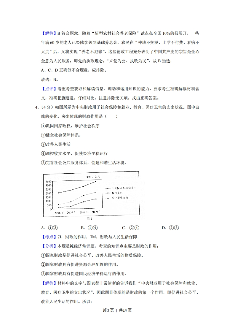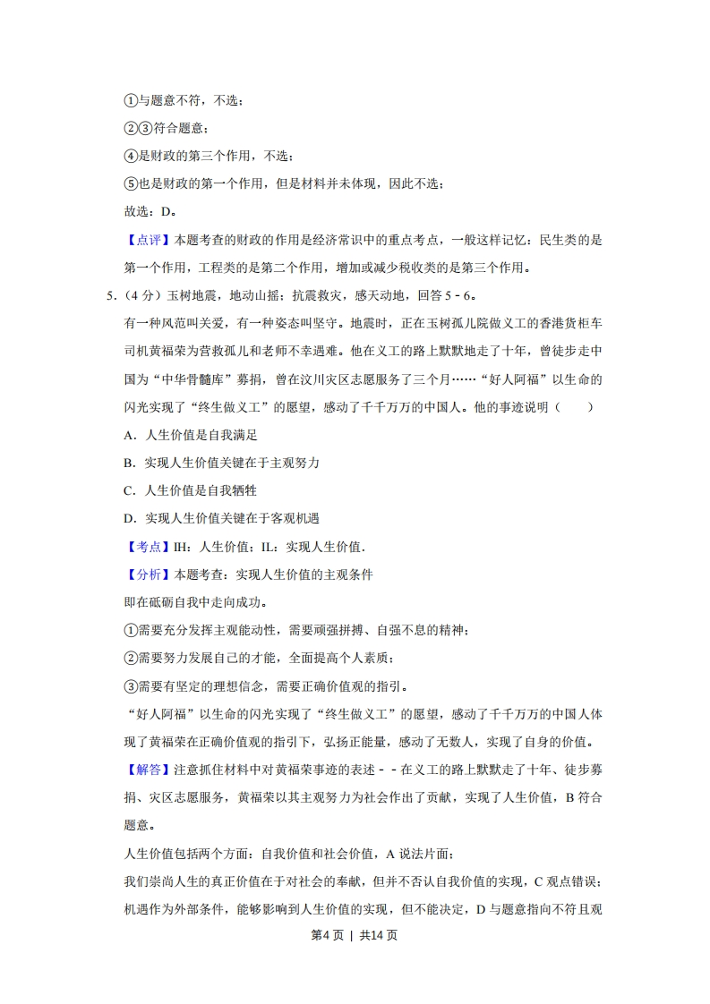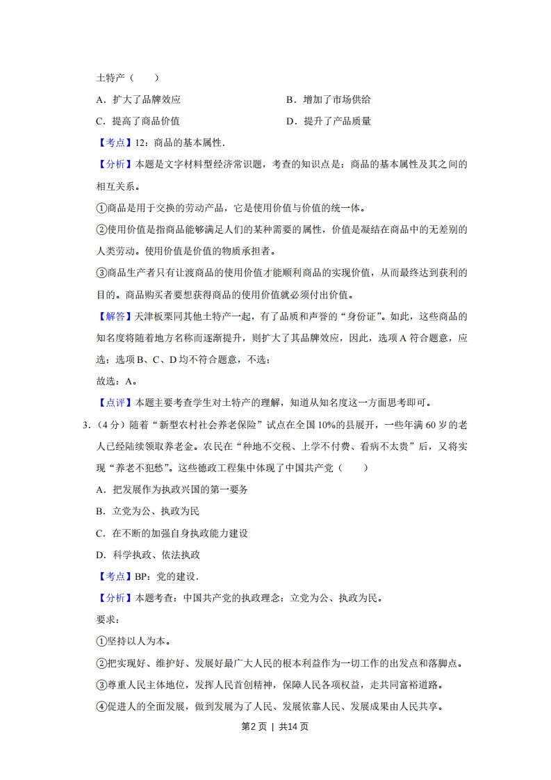 2010年天津市高考政治试卷解析版事考答案与试题佩折一、选择题(共10小题,每小题4分,满分36分)1.(4分)长期以来,对经济快速增长的片面追求已威胁到人类的生存环境,进而损害到人类自身的利益。在建的中新天津生态城以修复、保护生态为主旨,探索人类生存发展的新模式。生态城建成后,将实现可再生能源的广泛利用、节水生活化、城区无垃圾等目标。这体现了科学发展观中的()①以人为本②全面发展③协调发展④可持续发展。A.①②③B.①②④C.①③④D.②③④【考点】8L:科学发展观.【分析】本题考查的知识点是科学发展观的基本内涵,深入贯彻落实科学发展观,必须把推动经济社会发展作为第一要义,把以人为本作为核心立场、把全面协调可持续作为基本要求、把统筹兼顾作为根本方法。【解答】在建的中新天津生态城以修复、保护生态为主旨,探索人类生存发展的新模式,体现了科学发展观的以人为本的核心立场,有利于人与自然的协调发展,因此选项①③符合题意:全面发展是指全面落实中国特色社会主义事业经济建设、政治建设、文化建设、社会建设、生态文明建设五位一体总体布局,题中并未体现,所以选项②不选:生态城建成后,将实现可再生能源的广泛利用、节水生活化、城区无垃圾等目标,有利于促进经济的可持续发展,因此选项④符合题意:故选:C。【点评】本题旨在考查学生对科学发展观的具体内涵的理解能力,以及对材料的分析解读能力。2.(4分)目前,天津板栗被国家质检总局批准为国家地理标志保护产品,成为受法律保护的原产地产品。以蓟县为主产区的天津板栗同静海独家老醋、蓟县盘山磨盘柿,汉沽茶淀玫瑰香葡萄、宁河七里海河蟹等土特产一起,有了品质和声誉的“身份证”。这使上述第1页1共14页