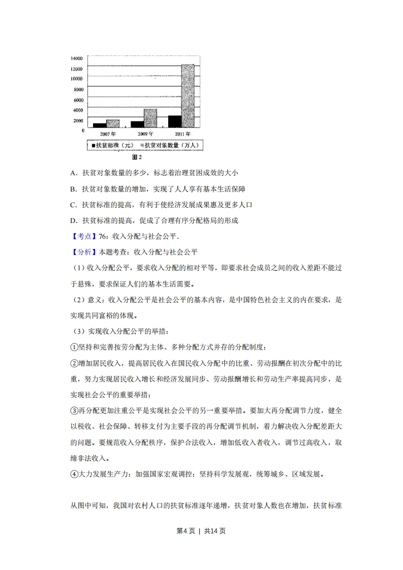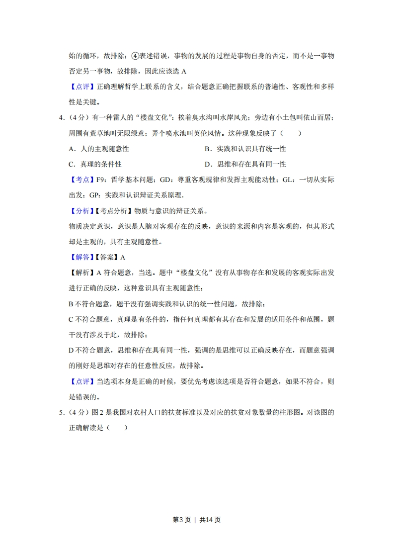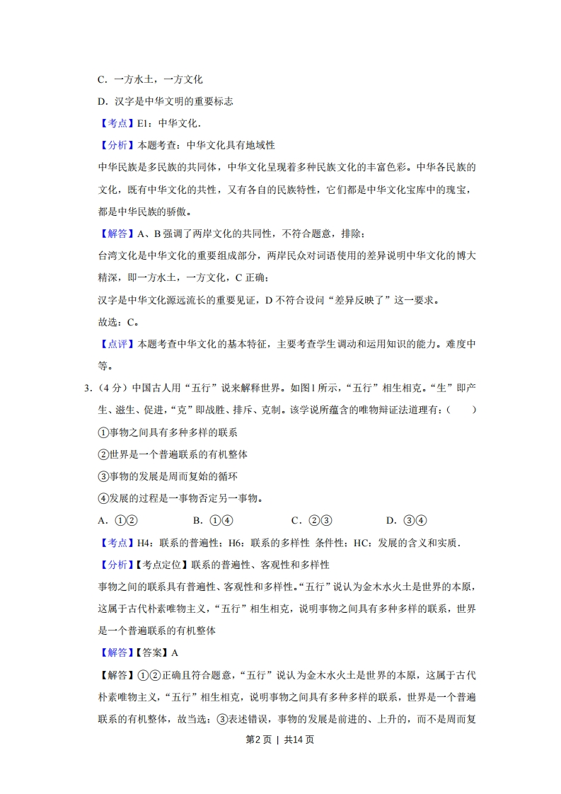2012年天津市高考政治试卷解析版事考答案与试题佩析一、选择题(共11小题,每小题4分,满分44分)1.(4分)“俯身接地气,用心听民意。”近来在广阔的华夏大地上,新一轮党员干部下基层活动正在蓬勃展开。群众反映干部们带来了政策和资金,改善了干群关系:干部们体会到只有“接地气”,才能“有人气”。下基层活动的良好成效体现了我们党()A.坚持政治领导的领导方式B.坚持民主集中制原则C.坚持依法执政的执政方式D.坚持密切联系群众的工作方法【考点】BO:中国共产党的性质宗旨和指导思想:BP:党的建设.【分析】【考点定位】中国共产党的建设本题解题的关键是能够区分群众路线的工作方法与民主集中制的工作原则,即前者是具体怎样做的问题,后者是工作程序问题。材料中强调干部们要下基层、接地气,即要求党员干部们要坚持密切联系群众的工作方法。【解答】党的政治领导是指党对国家路线、方针政策的领导,A材料未体现,排除:民主集中制是在民主基础上的集中和集中指导下的民主相结合的制度,是我们党的根本组织和活动原则,而“下基层”是党处理与人民群众关系的一种做法,B排除:依法执政是党的基本执政方式,强调党坚持依法治国,C材料未体现,排除:“党员干部下基层”“接地气”“改善了干群关系”,体现了党坚持群众路线、密切联系群众的工作方法,D正确。故选:D【点评】本题考查中国共产党的工作方法,主要考查学生获取和解读信息、调动和运用知识的能力。难度中等。2.(4分)初到台湾的大陆游客,常会因台湾民众把“花生”叫“土豆”,把“熊猫”叫“猫熊”,把“公共汽车”叫“公车”,把“窝心”解释为“温馨、贴心”,而引发一些“美丽的误会”。两岸民众对词语使用的差异反映了()A.两岸文化同根同源B.中华文化底蕴厚重第1页|共14页
