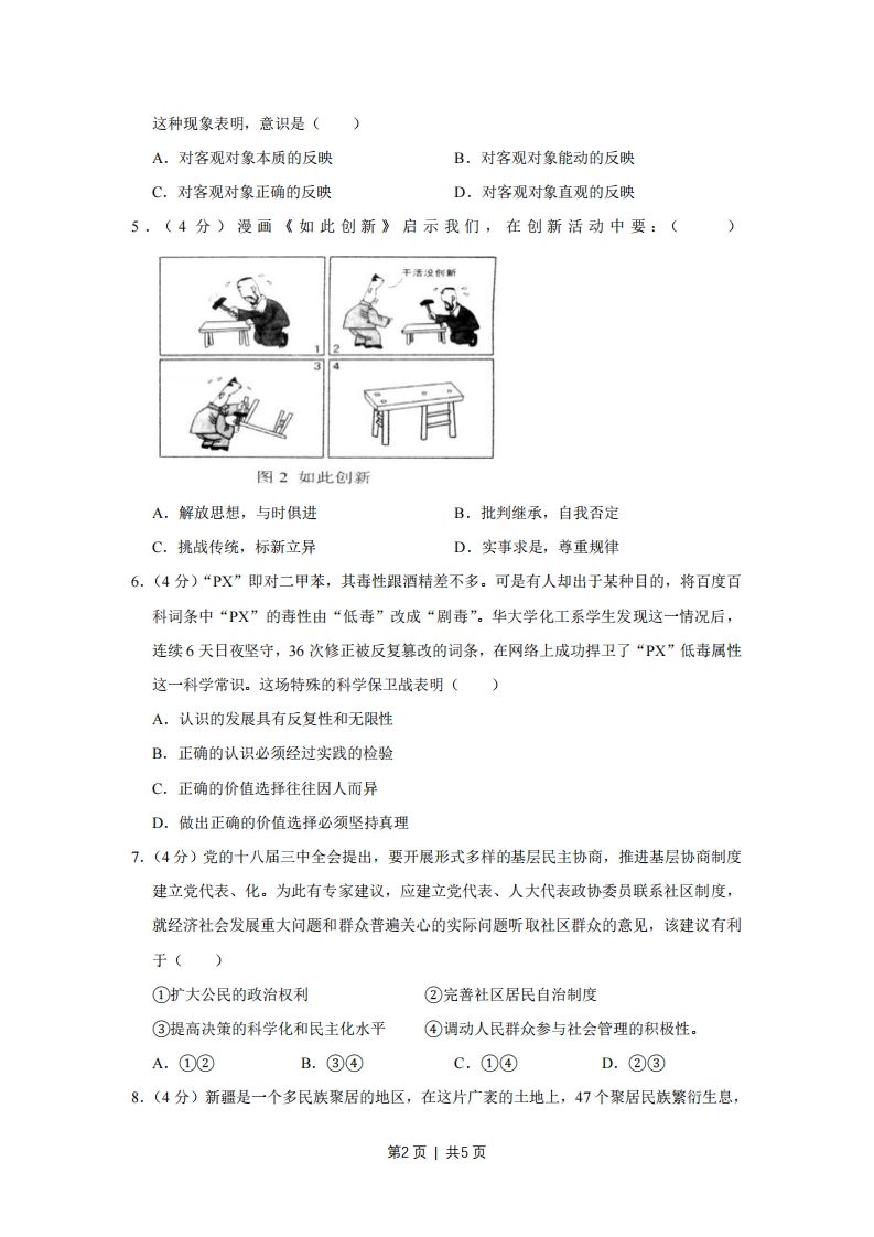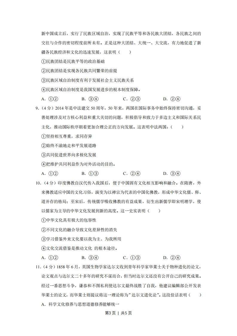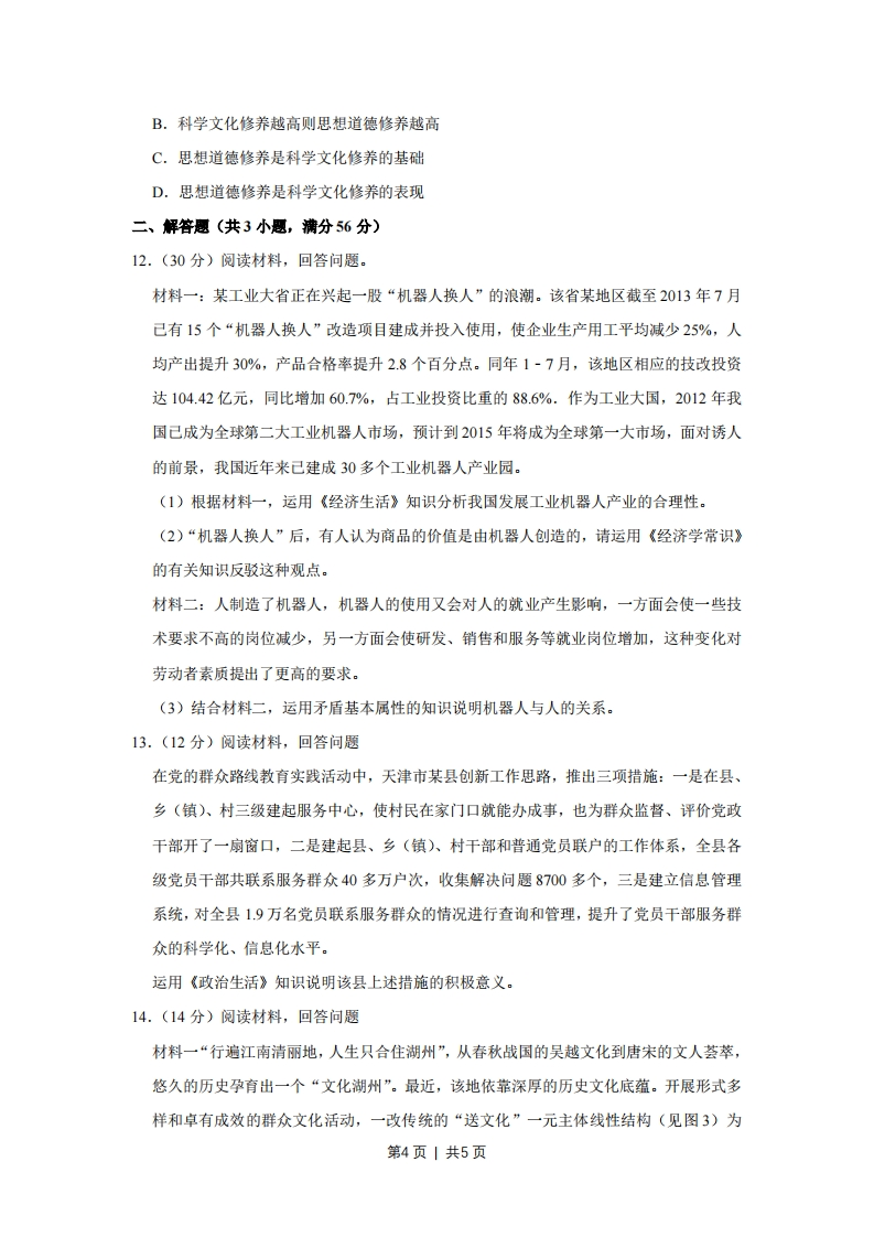 2014年天津市高考政治试卷一、选择思1.(4分)河北省饶阳县的程秀把的4亩地入股流转给某民营农业科技有限公司,成为该公司的股东和员工。程秀说:“除了每亩每年保底租金800元外,我春节前又领了15%的分红,加上每月工资1200元,一年下来能挣两万多。”她的收入()①属于按生产要素分配②受公司经营状况的影响③属于按劳分配④受股票价格波动的影响。A.①②B.③④C.①④D.②③2.(4分)某商业银行发售的一款理财产品期限为133天,认购金额在5万610万元之间的预计到期年化收益率(即当前收益率算成年收益率)为6.20%.一市民购买7万元该产品,其预期收益的计算方法为()A.70000×6.20%B.70000×6.20%÷365C.70000×6.20%÷365×133D.70000×6.20%×1333.(4分)根据如图判断2014年以来人民币兑美元汇率变动的趋势,并据此推算对我国进出口贸易产生的影响。下列选项中正确的是:()美元兑换人民币比率走势图6.176.166.156.146.136.126.116.106.092014-012014-022014-032014-04A,人民币升值有利于出口,不利于进口B.人民币升值不利于出口,有利于进口C.人民币贬值不利于出口,有利于进口D.人民币贬值有利于出口,不利于进口4.(4分)现实世界空间是三维的,绘画作为平面艺术史二维的。画家在二维平面所画的,只能是三维现实空间中实际物体的一部分,而人脑则通过这个部分将其想象成完整情形,第1页|共5页
