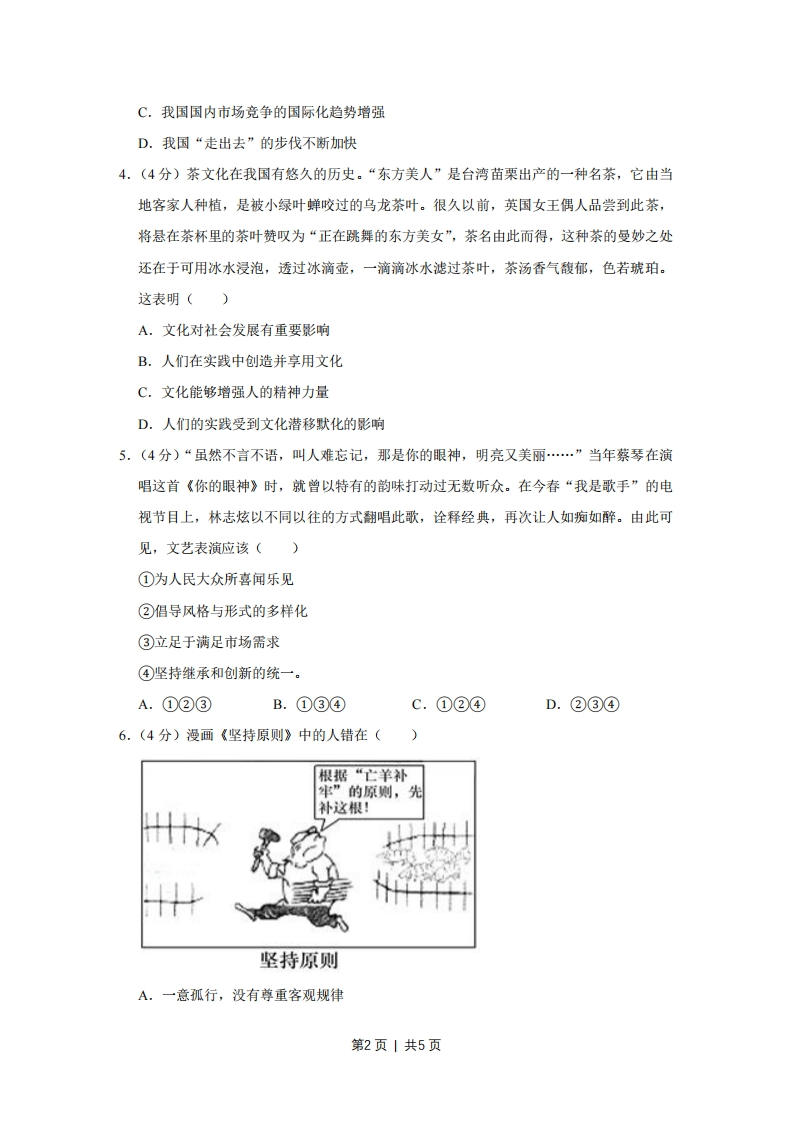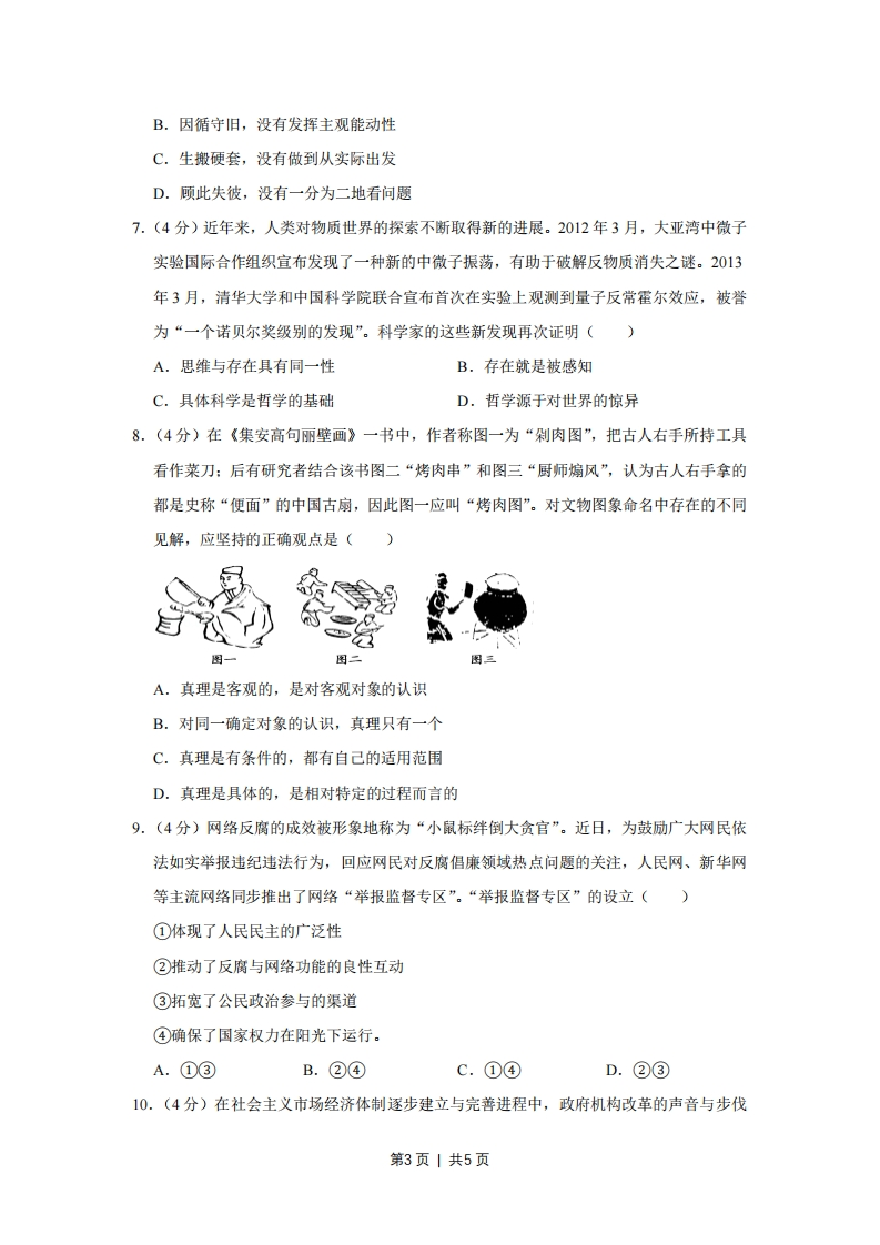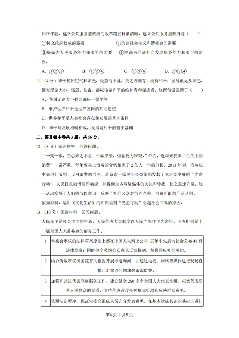 2013年天津市高考政治试卷一、本卷共11题,每题4分,共44分.在每题给出的四个选项中,只有一项是最符合题目要求的.1.(4分)党的十八大明确指出,到2020年实现城乡居民人均收入比2010年翻一番。这一目标的提出,体现了“居民收入增长和经济发展同步”的原则,顺应了人民过上更好生活的新期盼。实现居民收入倍增()①要大力发展社会生产力②要着力调整国民收入分配格局③是全面建成小康社会的要求④是促进收入分配公平的根本措施。A.①②③B.①②④C.②③④D.①③④2.(4分)在新一代移动互联网技术的浪潮下,全球许多名噪一时的大企业陷入困境:曾作为无线通信代名词的摩托罗拉被他人掌控:家电行业先驱索尼、松下和夏普巨额亏损:原来全球最大的智能手机平台塞班系统,如今只剩下2.6%的市场份额。这些案例表明()A,拥有最先进的技术储备,是企业长盛不衰的重要保障B.缺乏国家必要的技术规划,是企业由盛而衰的主要原因C.缺乏用于技术创新的资金投入,是企业竞争失利的根本原因D.适应市场发展趋势的技术创新,是企业保持竞争力的关键因素3.(4分)如图是2004-2012年我国对外贸易指标,图中数据显示()250002000015000100003000020042005200%200720082009201020112012◆出口一进口(亿关元)A.产品进口优化了国内的产业结构B.产品出口拉动了我国经济的增长第1页|共5页