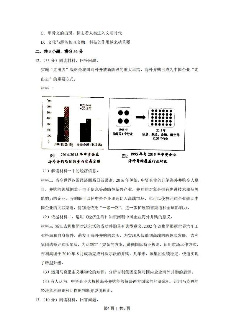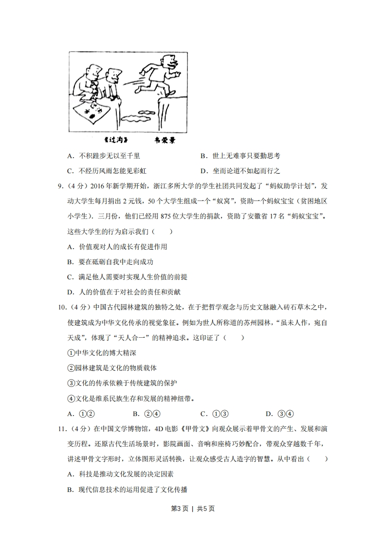 2016年天津市高考政治试卷一、本卷共11小题.每小题4分,共44分.在每个小题给出的四个选项中,只有一项是符合题目要求的,1.(4分)党的十八届五中全会通过了《中共中央关于制定国民经济和社会发展第十三个五年规划的建议》,该文件广泛听取了各民主党派中央、全国工商联和无党派人士的意见和建议。今年两会上,代表和委员拿到的“十二五”规划纲要草案,就是在该文件的指导下制定的。这说明()①中国共产党是中国特色社会主义事业的领导核心②我国实行共产党领导的多党合作和政治协商制度③人大代表是国家权力机关的组成人员,代表人民行使决定权④人民政协是协商民主的重要渠道,履行参政议政的国家职能。A.①②B.①④C.②③D.③④2.(4分)网络空间是亿万民众共同的精神家园,维护互联网的良好秩序是广大民众的共同心声。第十二届全国人大常委会第十五次会议初次审议了《中华人民共和国网络安全法(草案)》,而后该草案在中国人大网公布,向社会公众征求意见。这表明()A,依法治国与依法执政是统一的B.政府决策能够反映民意、集中民智C.社会主义民主具有广泛性和真实性D.公民通过社会公示制度参与民主监督3.(4分)2015年,中国外交交出了一份令人欣喜的成绩单。从夯实构建中美新型大国关系共识,到巩固深化中非全面战略合作伙伴关系:从参与解决伊核问题,到推动巴黎气候大会协议达成:从中韩、中澳自贸协定生效,进口商品降价,到多国调整对华签证政策,出入境更加方便,中国与世界进入了深度互动。从中可以看出()①中国已成为维护世界秩序的主导力量②中国是维护世界和平与发展的重要力量③国际关系时由国家间的共同利益决定的④我国的外交政策是为人民的利益服务的。A.①②B.①③C.②④D.③④4.(4分)2016年1月1日,M先生收到L先生偿还的为期一年的借款本金10万元与利息第1页|共5页