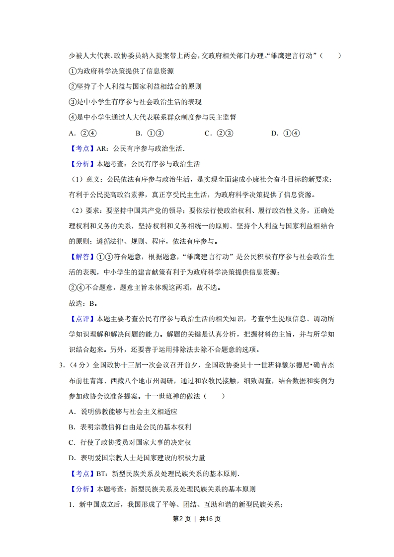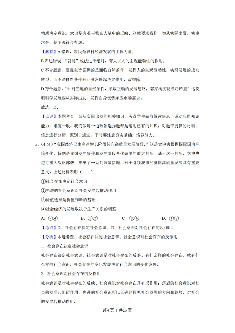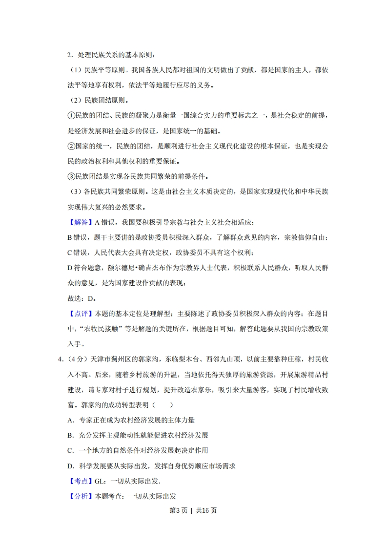 2018年天津市高考政治试卷解析版事考答来与试题解折一、选择题(共11小题,每小题4分,满分44分)1.(4分)改革开放40年来,中国从低收入发展中国家发展成为世界第二大经济体,并迈向中等收入国家行列,其成就得益于全球化。同时,中国为全球化创造巨大市场,己成为世界经济增长的重要擎,多年来对世界经济增长的贡献率超过30%.这说明全球化()A.是以平等互利为基础的B.是解决发展问题的根本途径C.有利于推动国际新秩序的建立D.既有利于中国的发展也有利于世界的发展【考点】95:经济全球化的影响.【分析】本题考查:经济全球化的影响经济全球化是生产力发展的产物,同时又推动了生产力的发展,经济全球化促进了生产要素在全球范围内的流动、国际分工水平的提高以及国际贸易的迅速发展,从而推动了世界范围内资源配置效率的提高、各国生产力的发展,为各国经济提供了广阔的发展空间。【解答】A不合题意,题意主旨不体现经济全球化是以“平等互利为基础的”:B表述错误,“根本途径”说法错误:C不合题意,题意主旨与此项无关,排除:D符合题意,“中国发展的成就得益于全球化,同时,中国为全球化创造巨大市场,推动世界经济增长”,这说明全球化既有利于中国的发展也有利于世界的发展。故选:D。【点评】本题用“中国发展的成就得益于全球化,同时,中国为全球化创造巨大市场,推动世界经济增长”为案例,考查经济全球化。考查学生提取信息、调动所学知识理解和阐释事理的能力,解答时要仔细审读材料,提取有效信息,对应相关选择项,作出正确的选择。2.(4分)为培养学生的社会责任感,某地开展面向中小学生的“雏鹰建言行动”。几年来,学生围绕“环境保护”“中医药文化”等20多个主题开展探究,形成5万余条建言,不第1页|共16页