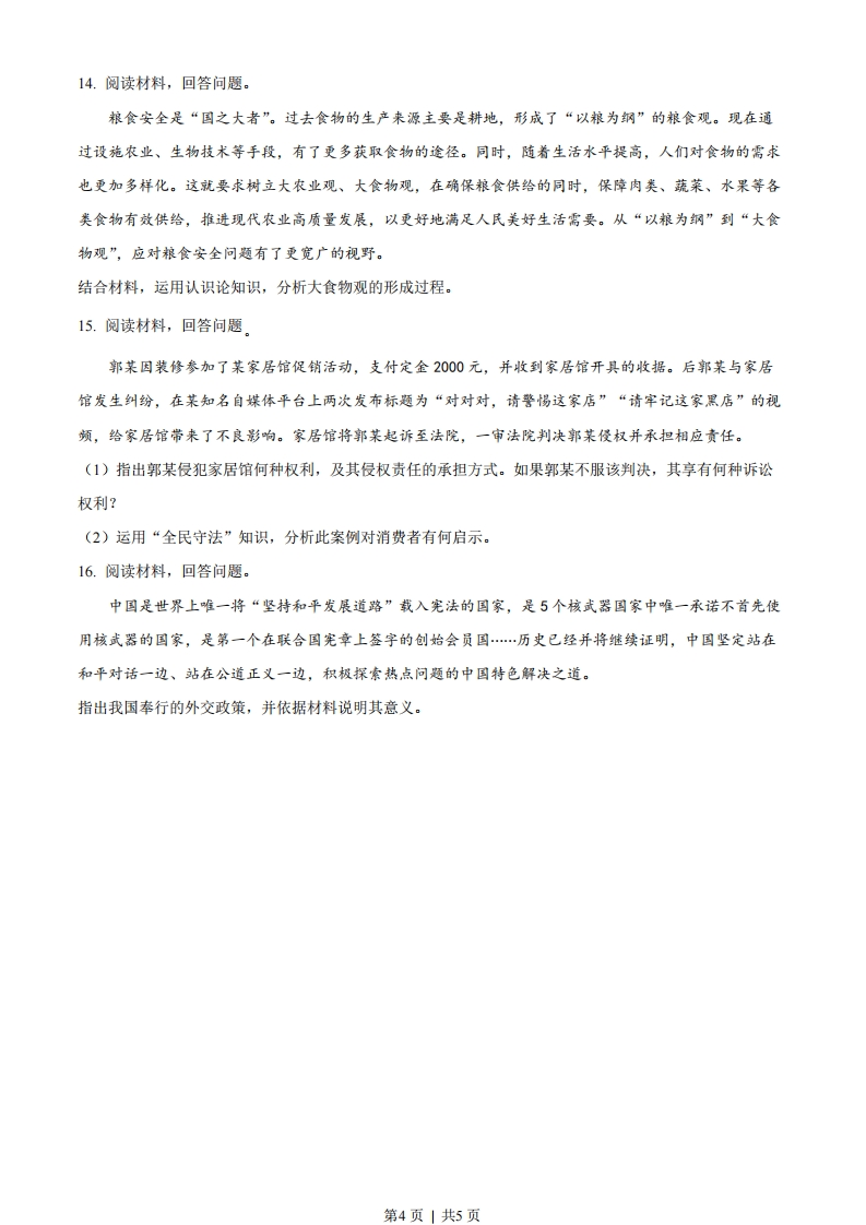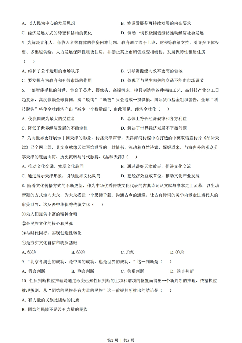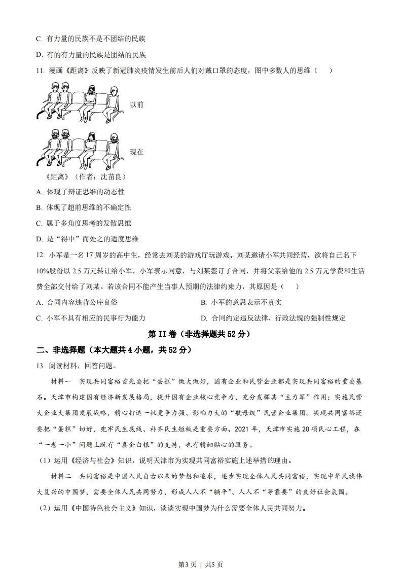 2022年天津市普通高中学业水平等级性考试思想政治本试卷分为第I卷(选择题)和第II卷(非选择题)两部分。满分100分,考试时间60分钟。第I卷(选择题共48分)一、选择题(本大题共16小题,每小题3分,共48分。在每小题给出的四个选项中,只有一项是最符合题目要求的)1.百年风雨兼程,百年伟大跨越。一代代中华儿女唱着《没有共产党就没有新中国》这首心底的歌,迎来新中国,走进新时期,迈入新时代。历史和现实、理论和实践都雄辩地证明()①中国共产党执政是历史的选择,是人民的选择②只有坚持党的领导才能实现中华民族伟大复兴③中国共产党始终代表社会各阶级、各阶层的利益④中国共产党必须坚持民主执政这一基本执政方式A①②B.②③C.①④D.③④2.把党的建设作为一项伟大工程来推进,是我们党的一大创举。截至2021年7月1日,全党现行有效党内法规共3615部,形成了一个比较完善的党内法规体系,并以此为主形成了一套系统完备的党的制度。党的制度建设是()①党领导立法、带头执法的要求②党履行国家各项职能的重要保障③坚持党要管党、全面从严治党的要求④党永葆旺盛生命力和强大战斗力的需要A.①②B.①④C.②③D.③④3.新业态经济迅猛发展的同时,也带来一系列法律问题。2021年8月印发的《法治政府建设实施纲要(2021一2025)》提出,及时跟进研究数字经济、人工智能等相关法律制度,抓紧补齐短板,保障新业态新模式健康发展。这体现全面推进依法治国要()A.坚持文明规范执法B.完善法律实施机制C.坚持法治和德治相结合D.建立完备的法律体系4.2022年5月12日,中共中央宣传部举行“中国这十年”系列主题新闻发布会第三场,介绍了过去十年中国经济和社会发展的累累硕果:近1亿农村贫困人口全部脱贫、居民人均可支配收入增长近八成、人均预期寿命提高至77.9岁…这充分体现了()第1页」共5页