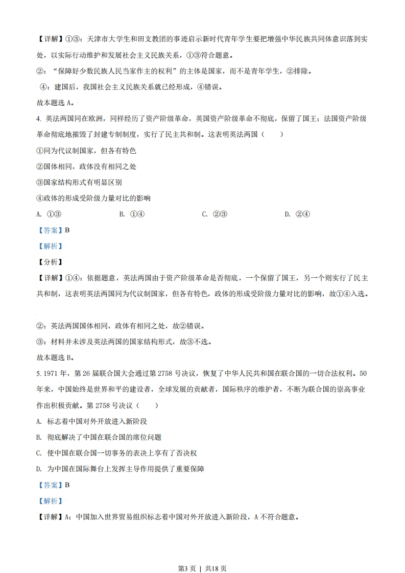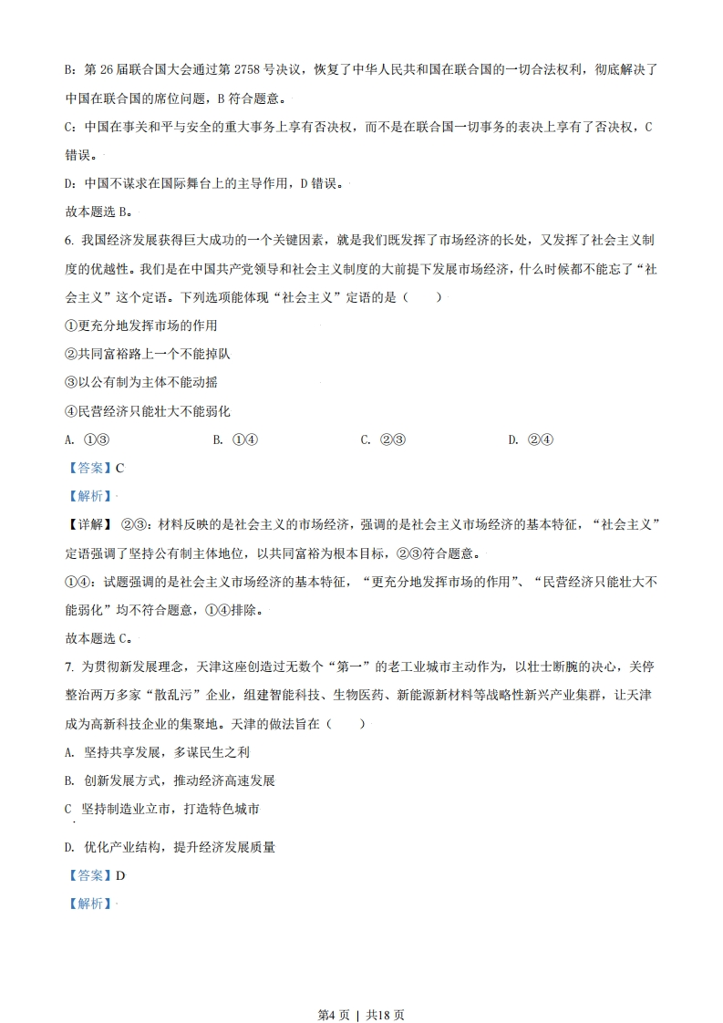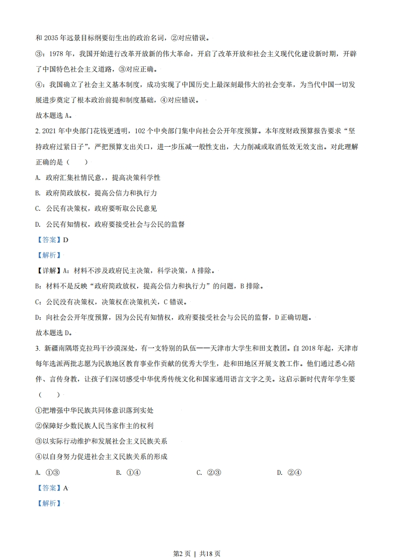 2021年天津高考政治试题本试卷分为第I卷(选择题)和第Ⅱ卷(非选择题)两部分,共100分,考试用时60分钟。第I卷1至4页,第Ⅱ卷5至6页。答卷前,考生务必将自己的姓名、考生号、考场号和座位号填写在答题卡上,并在规定位置粘贴考试用条形码。答卷时,考生务必将答案涂写在答题卡上,答在试卷上的无效。考试结束后,将本试卷和答题卡一并交回。祝各位考生考试顺利!第I卷注意事项:1.每题选出答案后,用铅笔将答题卡上对应题目的答案标号涂黑。如需改动,用橡皮擦干净后,再选涂其他答案标号。2.在每题给出的四个选项中,只有一项是最符合题目要求的。1.2021年是中国共产党成立100周年。我们党的一百年,是矢志践行初心使命的一百年,是第路蓝缕奠基立业的一百年,是创造辉煌开辟未来的一百年。这一百年,党团结带领人民完成和推进了一系列大事。下列大事与其意义对应正确的是()①完成新民主主义革命,建实现了中国从几千年封建专制政治向人民民主的伟大飞跃立中华人民共和国②完成社会主义革命,确立→开启了全面建设社会主义现代化国家新征程社会主义基本制度③进行改革开放新的伟大·开辟了中国特色社会主义道路革命完成了中华民族有史以来最为广泛而深刻的社会变革,为当代中国一切发④全面建成小康社会展进步奠定了根本政治前提和制度基础A.①③B.①④C.②③D.②④【答案】A【解析】【详解】①:中华人民共和国的成立,实现了中国从几千年封建专制政治向人民民主的伟大飞跃,彻底结束了旧中国半殖民地半封建社会的历史,使中华民族以崭新的姿态自立于世界民族之林,①对应正确。②:开启全面建设社会主义现代化国家新征程是由中华人民共和国国民经济和社会发展第十四个五年规划第1页」共18页
