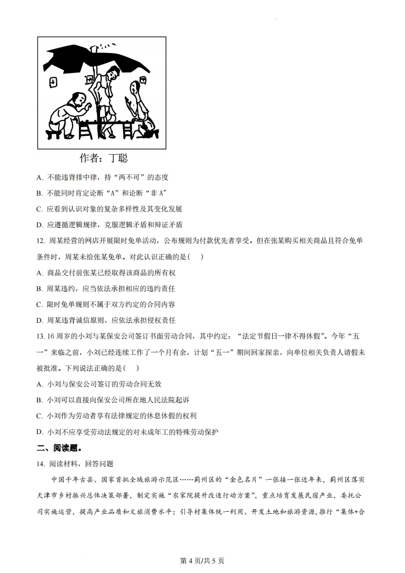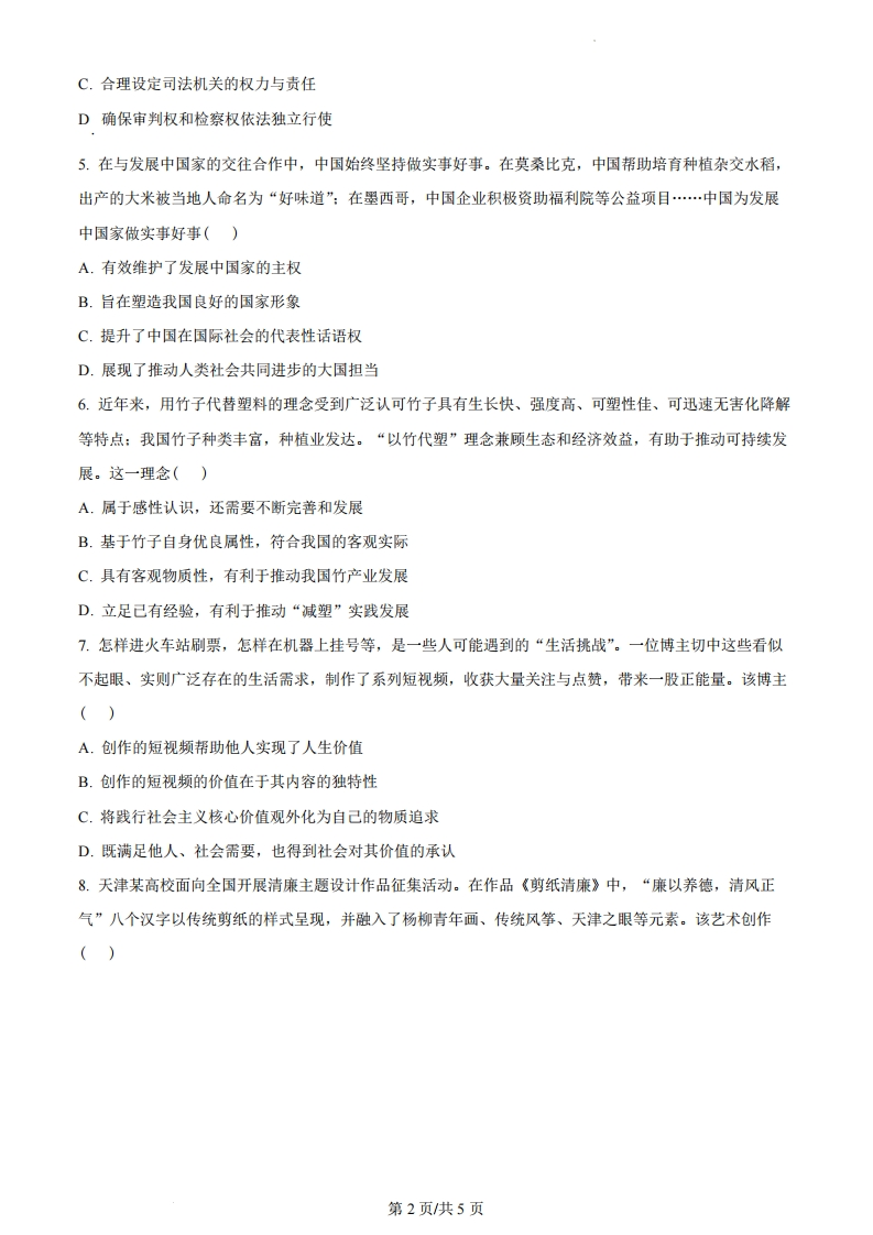 2023年天津高考政治试卷一、选择题。1.党的二十大报告强调“中国化时代化的马克思主义行”。中国化时代化的马克思主义贴近国情、贴近时代、贴近人民,回答了中国之问、世界之问、人民之问、时代之问,成为中国共产党能、中国特色社会主义好的理论支撑。强调“中国化时代化的马克思主义行”()①彰显了中国共产党人的理论自信②要求我们不断开辟马克思主义中国化时代化新境界③意味着中国化时代化的马克思主义是检验真理的标准④明确中国化时代化的马克思主义是世界各国的行动指南A.①②B.①④C.②③D.③④2.“晋江经验”集中体现了习近平总书记推进县域现代化的思路。晋江在福建率先推出居住证制度,在教育就业等方面坚持同城同待遇、保障全覆盖:在发展经济的同时,积极推进文化惠民、让老百姓在家门口享受到丰富多彩的文化生活。晋江的这些做法折射出推进中国式现代化要()①构建新发展格局②着力维护和促进社会公平正义③实现区域优势互补④坚持物质文明和精神文明协调发展A①②B.①③C.②④D.③④3.2023年全国两会前夕,代表委员们走进群众收集意见建议,准备议案提案。在广东,杨登辉代表广泛征集建议,笔记本上写满技能人才培养的“金点子”:在河南,马萧林委员把调研重点放在红色遗产保护利用上,积极探索让文物“活”起来的有效方式…代表委员们()A.深入基层汇集民意,是全过程人民民主的生动实践B.建言献策贡献智慧力量,使议案提案顺利转化为政府决策C.解决了群众关心的突出问题,助力党和国家事业兴旺发达D.把群众意见化为议案提案,是对国家大事行使决定权的表现4.司法公开是评判一个国家法治水平的重要标准。我国司法机关不断探索司法公开的新方式、新渠道,使人民群众通过政务网站、手机客户端等了解司法、走近司法、评价司法,让司法权在阳光下运行。这表明,司法公开()A.发挥人民监督作用推进公正司法B.保证司法程序和司法结果的公正第1页共5页