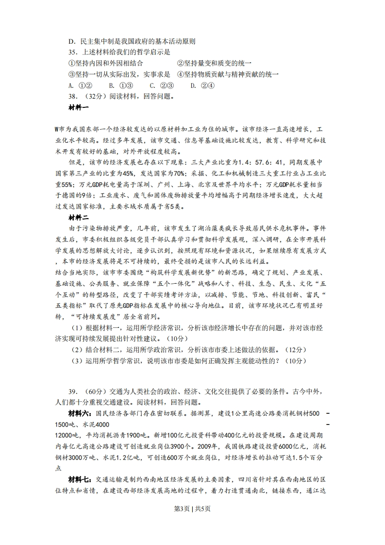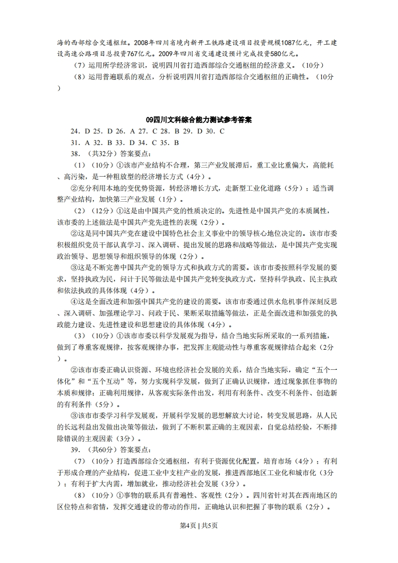2009年普通高等学校招生全国统一考试(四川卷)文科综合能力测试一一政治试题及答案24.十八世纪,亚当·斯密发现在一家扣针厂里,生产一枚扣针需要经过18道工序。这家工厂由10个工人分别承担1一2道工序,每天共生产48000枚扣针,平均每天生产4800枚。如果让工厂各自独立完成全部工序,那么他们中的任何一个人,一天连20枚扣针也生产不出来,这说明企业内部的分工协作可以A.减少生产商品的社会必要劳动时间B.减少单位劳动时间的商品产量C.提高生产单位商品所耗费的劳动量D.减少商品的个别价值25.在新农村建设中,某村村民以土地承包经营权入股,村集体以农田水利设施和部分建筑物入股,与一花卉经营商合作成立了股份有限公司,村民和村集体都成为公司的股东,村民同时成为公司的雇员。这种做法①发展了农村公共服务体系②改变了农村集体经济的性质③有利于农业产业化经营④发展了家庭承包经营制度A.①②B.①③C.②③D.③④26.小张按1美元兑换8元人民币的汇率换得1000美元,两年后美元兑换人民币的汇率下跌了20%,小张又将1000美元换回人民币。在不考虑其他因素的条件下,小张A.损失了人民币1600元B.减少了人民币损失1600元C.损失了美元160元D.减少了美元损失160元27.工人秦某是一位区政协委员,他花费大量时间走访调查,写出了《关注个体经济,建议停止工商非法收费》的调研报告,并将报告递交给全国人大代表。2008年8月,以这份报告为基础形成的全国人大代表议案建议,得到了国务院的采纳:从当年9月1日起,全国统一停止征收个体工商户管理费和集贸市场管理费。个体户每年每户节支650元。他说,“别说我是个政协委员,这个事儿,是个有责任的公民都可以干!”上诉事例说明①公民行使政治权利一定要通过人大代表②人民代表大会制度保障人民参与国家管理③政协委员在我国参政议中起着重要作用④公民依法行使政治权利是推动民主发展的前提A.①②B.②③C.②③④D.①②③④28.2008年5月,居民徐某欲购摩托车,因在政府网站未查到养路费征收标准和办理程序等相关资料,便以快递方式去函所在区交通局申请告知与购车相关的政府信息,并注明自己的通讯地址和联系方式,该局签收后在法定期限内无回复。为此,徐某向该区人民法院提起行政诉讼,要求法院裁定该局“行政不作为”并诉求其在一定期限内履行主动公开政府信息的法定责任。区法院依据《政府信息公开条例》最终判定被告行为违法,原告胜诉。上诉事例说明①政府严格执法行政是依法治国的重要环节②司法机关公正执法是依法治国的根本保障③立法机关严格立法程序是依法治国的前提条件④公民意识和法制观念的增强是依法治国的基础A.①②B.①②④C.②③④D.①②③④第1页|共5页
