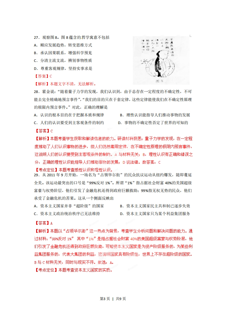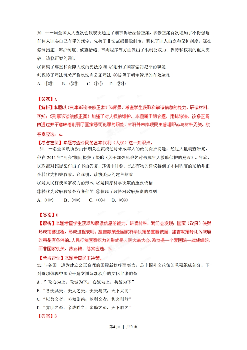 2012年普通高等学校招生全国统一考试(四川卷)文科综合第一部分选释题(共140分)【试题总评】本卷符合《考试大纲》要求,命题注重测试对学生能力的考查。总体上难度适中,试题设计遵循以下原则:1.试题考点分布合理,覆盖面较广,突出考查主干知识和核心知识,考点均为教材中的重点内容。2.试题考查了学生多方面的能力,尤其是利用所学知识分析问题和解决实际问题的能力等,体现了政治学科特点,符合考试大纲考核目标的要求。3.试题贴近社会生活,关注社会热点,注重课本知识与社会热点的紧密结合,学以致用。4.试卷整体以中档试题为主,符合学生能力的培养和提高。5.所选题目都是当今社会热点问题,一次考查学生分析问题和解决问题的能力。6.考查的角度和知识点需要考生具备一定的思维能力。主观材料题命题角度新颖,要求高,虽然整体看不难,但是有一定的区分度,是一套选拔考生综合素质能力的好试题。本部分共35小题,每小题4分,共140分。在每小题给出的四个选项中,只有一项是最符合题目要求的。24.汽油和汽车是必须组合在一起才能满足人们行车需求的商品。汽油价格的变动不仅会引起汽油需求量的变动,还会影响消费者对汽车的需求。假定其他条件不变,下列能够反映油价上涨对汽车需求量影响的是Q(顺求量)D【答案】D【解析】本题考查学生描述和阐释事物的能力以及调动和运用知识的的能力。汽油和汽车是互补商品,存在互补关系的商品,它们之间呈同向关系,即汽油价格上涨会引起汽油需求量的的减少,从而使与之成互补关系的汽车需求量也随之减少,汽油价格上前与点上涨后相比汽车需求量减少。故选D【考点定位】本题考查价格变动对生活的影响(即价格变动对呈互补关系的商品的影响)。第1页1共9页