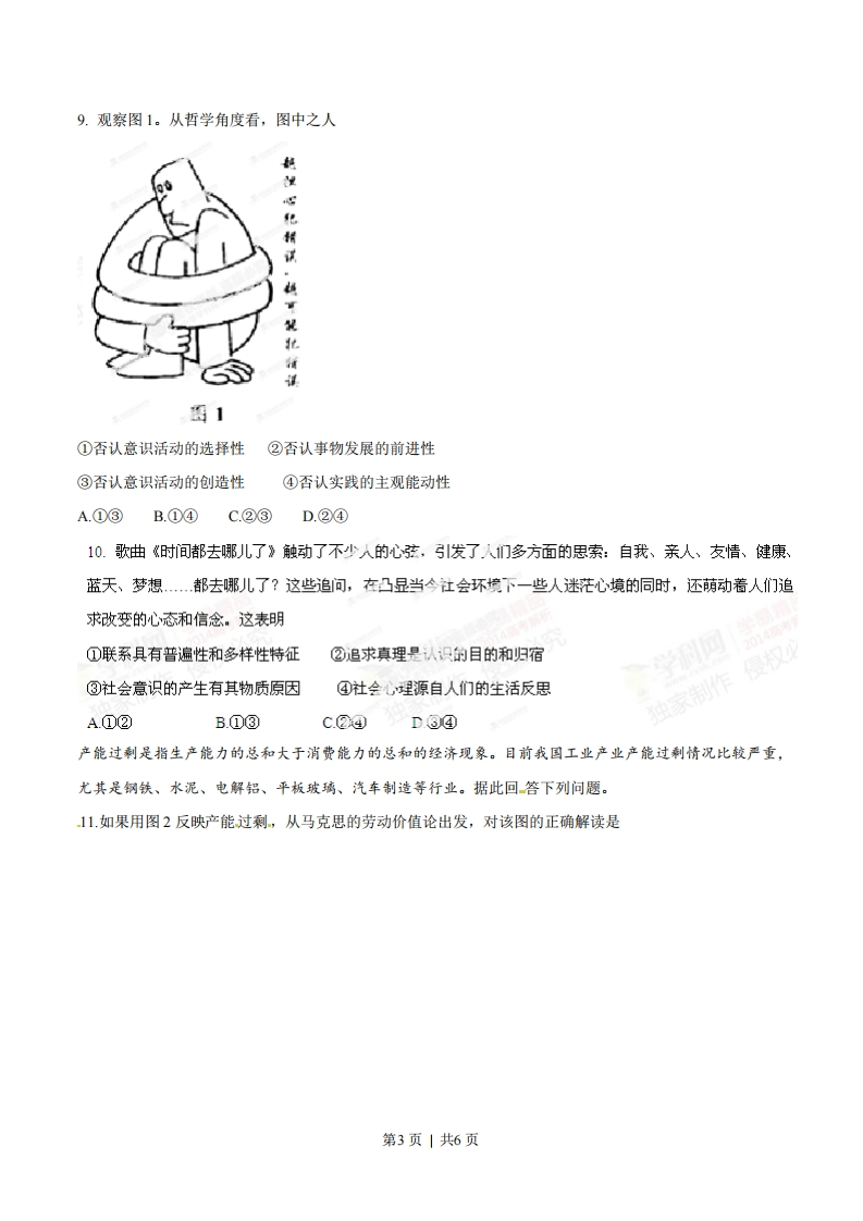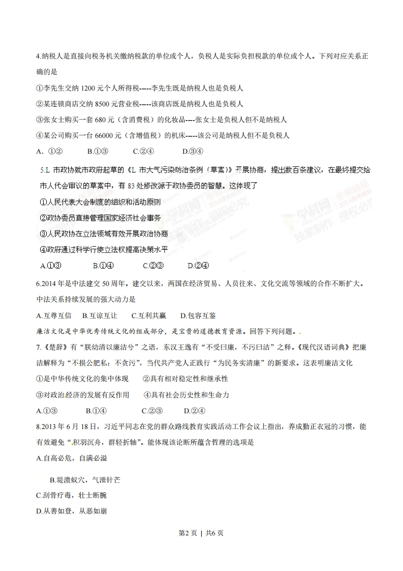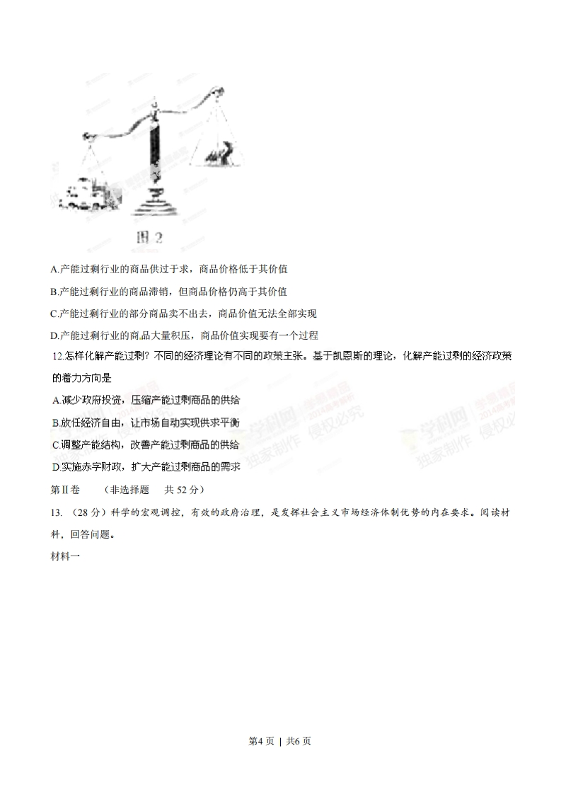 绝密★启封前2014年普通高等学校招生全国统一考试文科料综合能力试攻治(四川卷)说明:本卷为四川卷,由学科网政治解析团队第一时间独家人工录入。一、选择题:本题共12小题,每小题4分,共48分。在每小题给出的四个选项中,只有一项是符合题目要求的。1.2014年第一季度人民币对美元贬值2.64%,改变了人民币近九年来单边升值的状况,市场对人民币的贬值预期较强。在此背景下,假设其他条件不变,下列图示中,能反映以进口大豆为原料的国内企业对进口大豆需求变动的是PPP(价格)(价格)(价格)DD,D0冯求界()商术】0(需求喷)Q网求鼎)ABD2.M村在确认村民的土地经营权等权属后,将1000亩土地的经营权流转给T公司,用于种植蔬菜和花卉,每户村民按850斤大米(约1400元)/亩×年的标准领取租金。对此认识正确的是①村民获得租金是因为土地与资本和劳动结合创造了价值②土地所有权在土地向专业公司流转后仍归每户村民所有③村民通过土地经营权流转所获收入属于非农业劳动收入④土地经营权流转能使市场有效发挥配置土地资源的作用A.①②B.①③C.②④D.③④3.2014年4月11日,上海证券交易所发布公告,终止中国长江航运集团南京油运有限公司股票(*$T长油)》交易资格。这意味着已连续四年亏损的*$T长油终于退出股票市场,持有该股票的股民也因此不同程度地受到损失。*ST长油退市事件的警示是①上市公司应努力改善治理结构,着力提高资本使用放效萄②上市公司应不断调整资本结构,尽力降低股市融资水平③投资者应保持理性,越是经营不善的公司投资风险越大④投资者应承受风险,风险越大的公司其投资收益率越高A.①③B.①④c.②③D.②④第1页|共6页