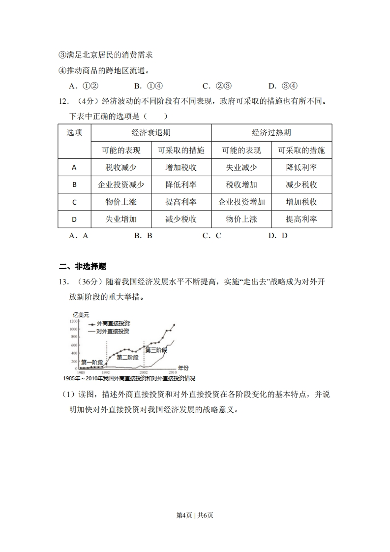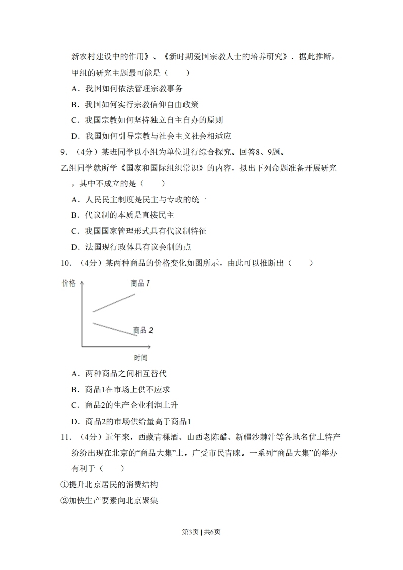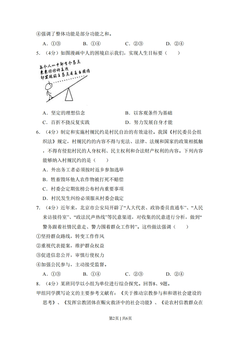 2012年北京市高考政治试卷一、选择题(每小题0分)优秀城市雕塑体现了城市的精神品质和文化追求。北京“十二五”期间将新建一批呈现北京历史文化特色和“北京精神”的城市雕塑,分布在京城的大街小巷。回答1、2题。1.(4分)优秀城市雕塑的文化价值主要表现为()①显示城市的文化底蕴②活跃城市的文化市场③增强人们的精神力量④培育优秀的文化人才。A.①③B.①④C.②③D.②④2.(4分)优秀城市雕塑作为公共环境艺术作品()①体现了城市环境对雕塑风格的依赖②反映了雕塑理念与城市环境的统一③体现了城市环境是时代精神的产物④反映了历史情怀与时代精神的整合。A.①②B.①③C.②④D.③④3.(4分)随着国际化程度不断提高,北京越来越多的中餐馆开始提供英文菜单,但一些菜单的译法闹出不少笑话。看来有关部门出版了《美食译苑·-中文菜单英文译法》一书,将2158道中餐菜名翻译成外国人能看懂的英文名称。此举有助于()A.丰富中华饮食文化的内涵B.促进中西饮食文化的传播C.展现中华饮食文化的魅力D.减少中西饮食文化的差异4.(4分)加强改革顶层设计和总体规划,重点解决体制性障碍和深层次矛盾,全面协调推进经济、政治、文化、社会等体制创新。从哲学角度,以上论述()①运用了科学的系统优化方法②把握了矛盾主次方面的辩证统一③坚持了重点论和两点论统一第1页|共6页