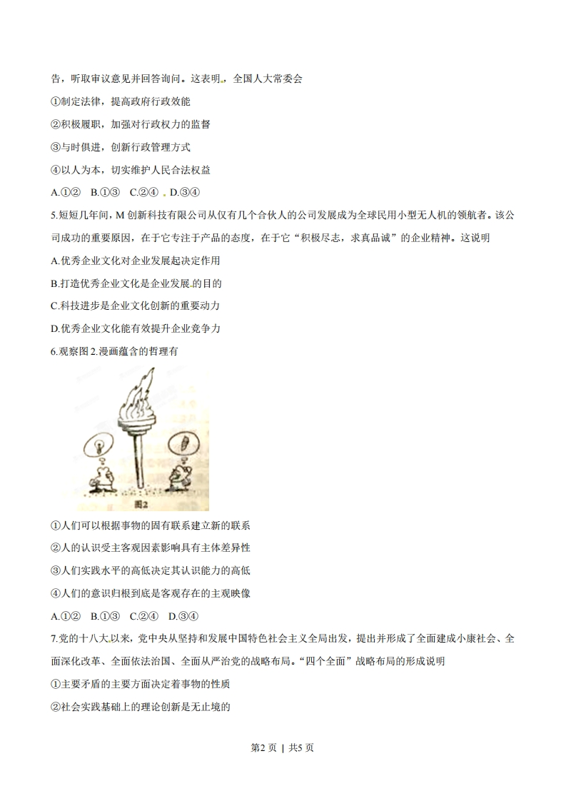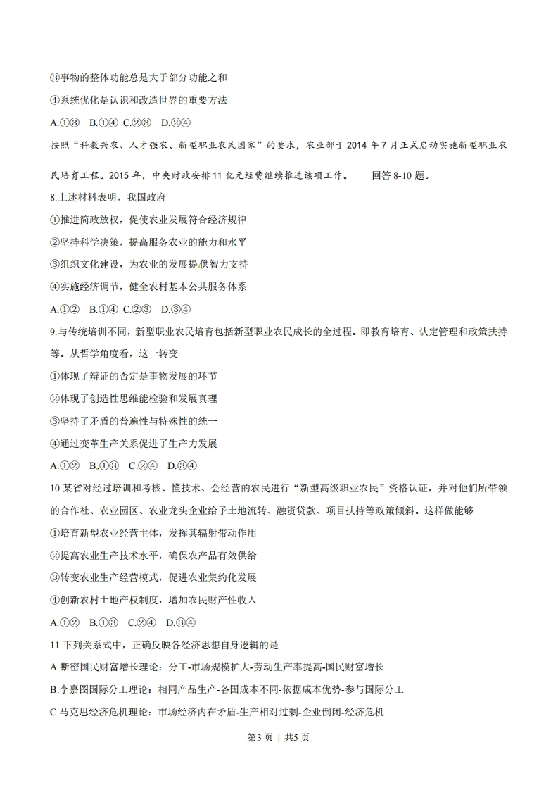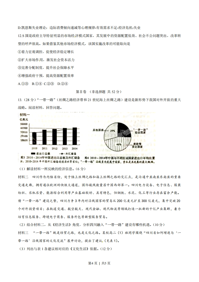 四川省文科综合政治第I卷(选择题共48分)1假设其他条件不变,下列与图1所反映的信息相符合的是价D0图1Q(数量)A卷烟税率上调,导致卷烟价格和购买量的变动B.原油价格下跌,导致汽油价格和需求量的变动C.银行利率下调,导致棉花价格和种植量的变动D.汽油价格上涨,导致天然气价格和销量的变动2.“数以亿计的人可在自家屋顶、田间建立一个小型发电厂,只要它覆盖着太阳能电池板,而且通过互联网和电网与世界连接相互交易”,这是“互联网+能源”的一个远景和行动。其重大意义在于①每个人都可以是电力消费者也可以是生产者②可以极大地促进能源的清洁替代和绿色替代③能源供给结构将实现电能化且价格十分低廉④“互联网+能源”能全面推动各传统产业升级A.①②B.①③C.②④D.③④3.2014年,我国国内生产总值比上年增长7.4%,低于7.5%的目标:服务业增加值比重为48.2%,比上年提高1.3个百分点:城镇新增就业1322万人,超额完成新增就业1000万人的目标。这意味着①我国经济结构更加趋于优化②服务业成为我国经济的主导③第三产业吸纳就业的能力强④经济增长主要依靠创新驱动A.①②B.①③C.②④D.③④4.2015年,全国人大常委会办公厅出台《关于改进完善专题询问工作的若干意见》,要求围绕社会普遍关注和人民群众期待的重大问题,每年安排1至2位国务院副总理或国务委员向全国人大常委会作专项工作报第1页|共5页