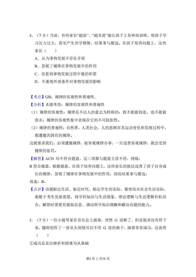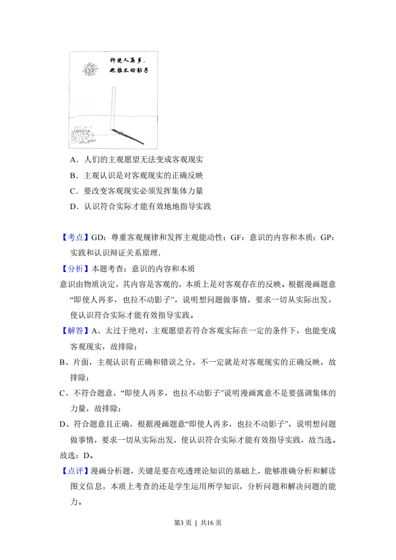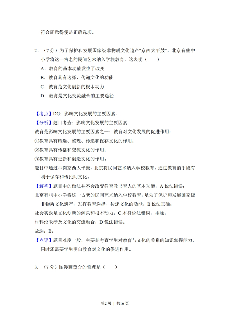 2013年北京市高考政治试卷事考答来与试想解析一、单项选择题,共12题,每题7分1.(7分)“笔墨当随时代”,绘画艺术要有时代精神,就要有创新。然而不继承优秀的传统遗产,创新很难有稳固的根基。这表明绘画艺术的发展要()A.正本清源,独树一帜B.海纳百川,有容乃大C.薪火相传,推陈出新D.各美其美,和而不同【考点】DJ:文化传承与创新.【分析】题目考查:文化传承与创新:文化传承和创新的途径:(1)继承传统,推陈出新文化创新必须批判地继承传统文化,“取其精华、去其糟粕”,“推陈出新、革故鼎新”。一方面,我们不能离开传统文化,空谈文化创新。另一方面,体现时代精神,是文化创新的重要追求。(2)面向世界,博采众长文化创新必须加强不同民族文化之间的交流、借鉴与融合,做到博采众长。态度:以世界优秀文化为营养,充分吸收外国文化的有益成果。(3)在文化创新中,必须把握好当代文化与传统文化、民族文化与外来文化的关系,要坚持正确的方向。题目中通过绘画这一例子,说明的主题是绘画艺术要具有时代精神,传统文化要有创新,要与时代结合,传统的遗产要代代相传。【解答】A强调的是要有自己的个性,与题意不符:BD强调的是尊重文化的多样性,与题意不符。“不继承优秀传统遗产,创新很难有稳固的根基”,从这里我们可知道该题强调的是绘画艺术的发展需要继承传统,要做到薪火相传,推陈出新,C说法正确:故选:C。【点评】题目难度一般,主要是考查学生对题目中的主题的把握,在遇到此类题目,学生需要十分准确的理解选项的意思,将选项与题目的主题结合起来,第1页|共16页