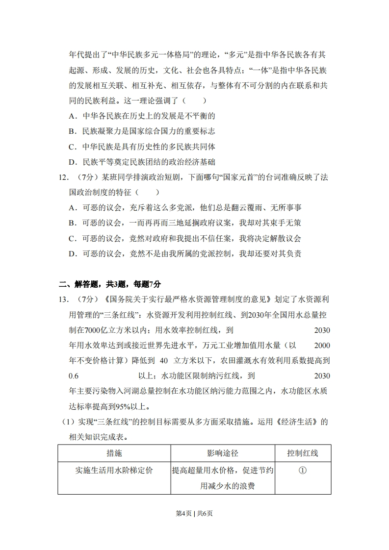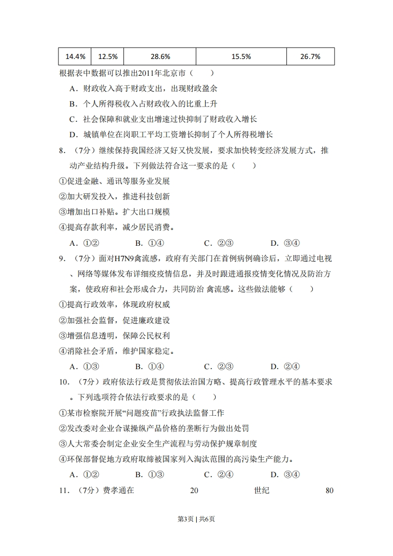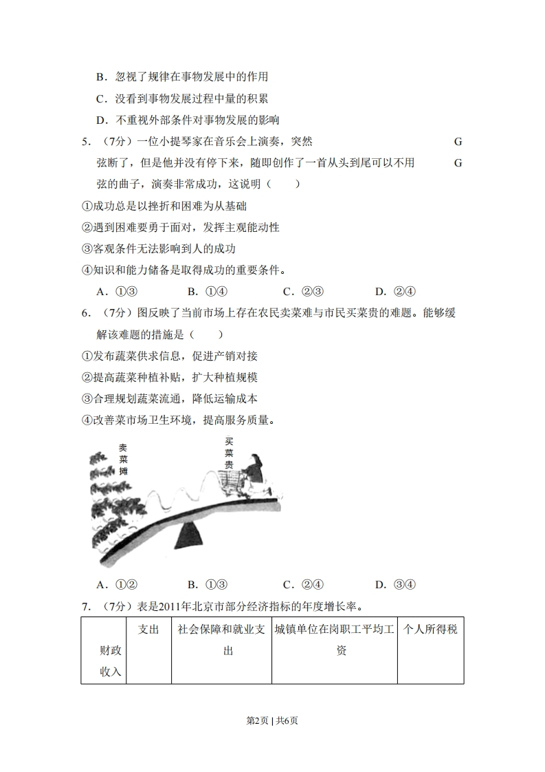 2013年北京市高考政治试卷一、单项选择题,共12题,每题7分1.(7分)“笔墨当随时代”,绘画艺术要有时代精神,就要有创新。然而不继承优秀的传统遗产,创新很难有稳固的根基。这表明绘画艺术的发展要()A.正本清源,独树一帜B.海纳百川,有容乃大C.薪火相传,推陈出新D.各美其美,和而不同2.(7分)为了保护和发展国家级非物质文化遗产“京西太平鼓”,北京有些中小学将这一古老的民间艺术纳入学校教育。这表明()A,教育的基本功能发生了改变B,教育具有选择、传递文化的功能C.教育是文化创新的根木动力D,教育是文化交流融合的主要途径3.(7分)图漫画蕴含的哲理是()即使人再多,也熊不动制子A.人们的主观愿望无法变成客观现实B.主观认识是对客观现实的正确反映C.要改变客观现实必须发挥集体力量D.认识符合实际才能有效地地指导实践4.(7分)当前,有些家长“超前”、“超负荷”地让孩子上各种培训班,使孩子学习压力过大,甚至产生厌学情绪,结果事与愿违。在孩子培养问题上,这些家长()A.认为事物发展不存在矛盾第1页|共6页