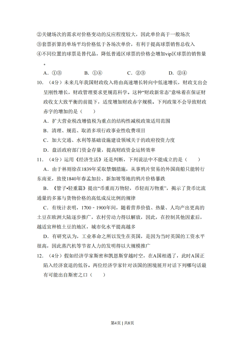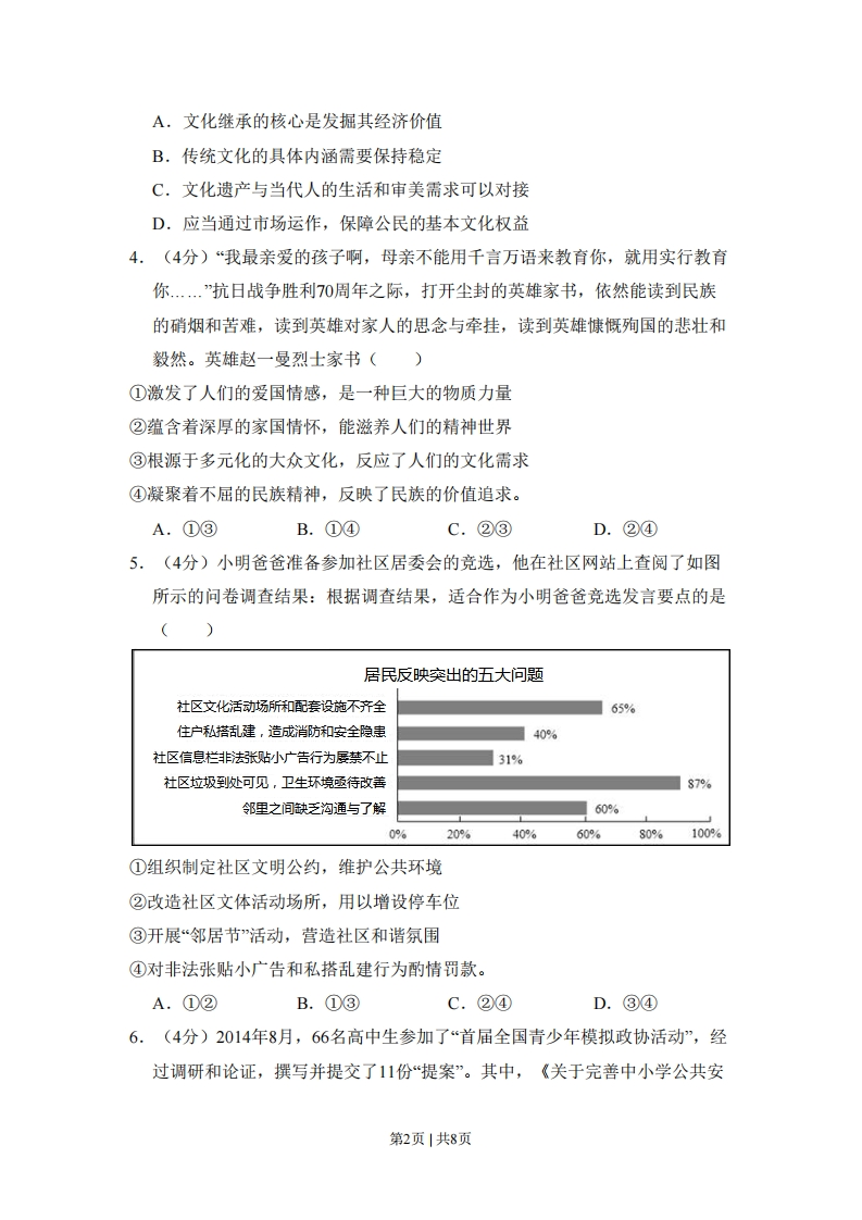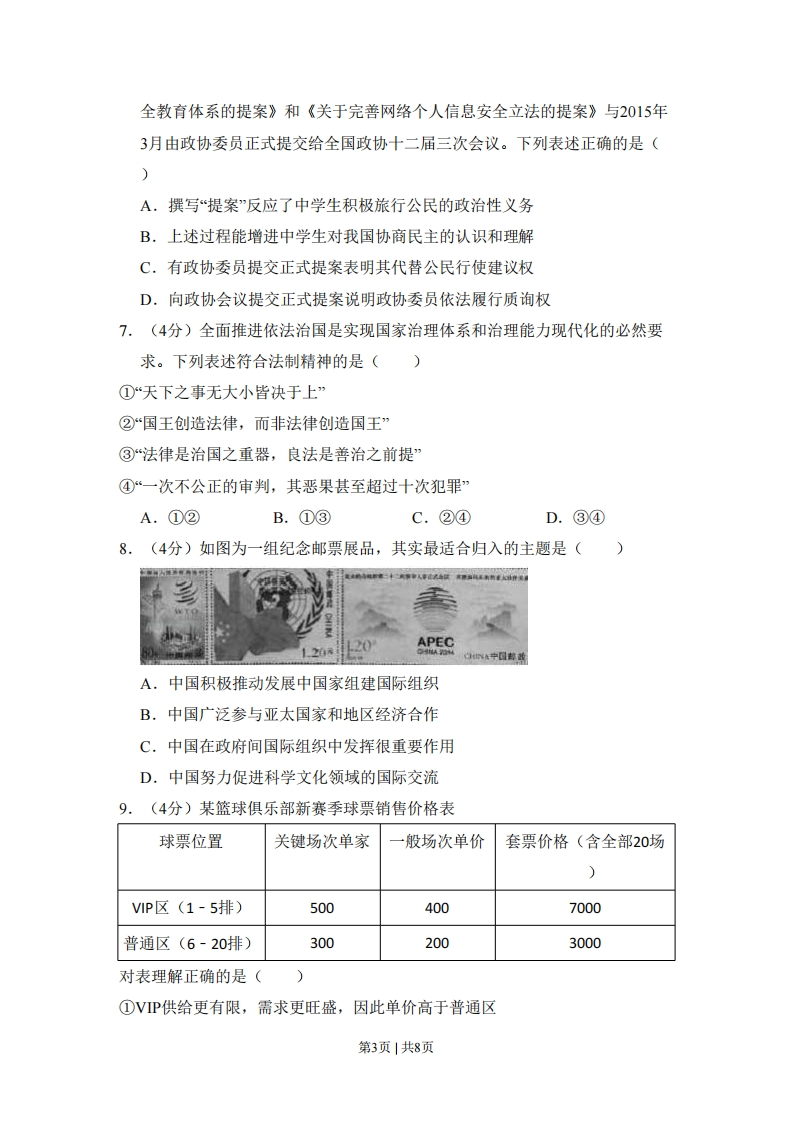 2015年北京市高考政治试卷一、选择题(每小题4分)1.(4分)读图,谷雨谷雨源自“雨生百谷”之说,古人将谷雨分为三候:“一候萍始生,二候鸣鸠拂其羽:三候戴胜降于桑,”每年4月19日至21日,当太阳到达黄经30度时为浴雨节气,此后气温迅速回升,雨量增多,适合农作物生长,农业生产进入繁忙时期,人们食香椿,赏牡丹,开始采摘谷雨茶。这说明在我国古代人们()①认识到了节气与农业关系生产的客观联系②将节气智慧融入生产和生活实践中③顺应自然节律,对自然的征服④在实践中获得了对人与自然关系的完整认识。A.①②B.①③C.②④D.③④2.(4分)“5W”是职业生涯规划中常用的思考模式(如图),这一模式启示我们,确定职业生涯规划时候()Who are you?你是谁?What do you want?你想干什么?What can you do?你能干什么?What can support you环境支挥或允许你干什么?What can you be in the end?你最终的职业目标是什么?①应明确自身兴趣、技能、和价值观②外部因素的支持和干扰具有根本影响③愿望、动机、和实现结果之间一致的④要在权衡理想和现实的过程中确立目标。A.①②B.①④C.②③D.③④3.(4分)盘龙藻井变身雨伞,飞檐角上的瑞兽蹲踞在铅笔上,朝珠成了时尚耳机.北京故宫博物院一改人们印象中的“正襟危坐”,以管藏文物和古典建筑为元素创作了多款热销产品。这说明()第1页|共8页