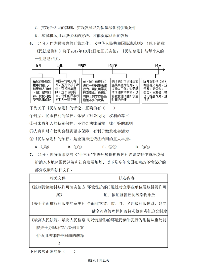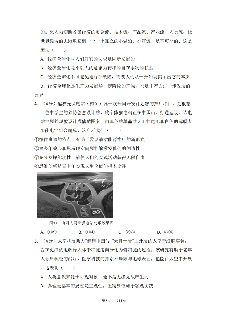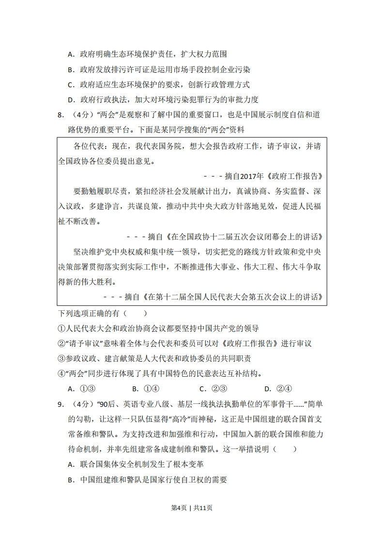 2017年北京市高考政治试卷一、选择题(本部分共12小题,每小题4分,共48分。在每小题列出的四个选项中,选出最符合题目要求的一项。)1.(4分)上面为某报刊登的一则新闻,对该新闻理解正确的有()中学生庙会练摊创意萌鸡热销所有收入将作为奖学金提供给西部贫困地区某中学本报讯蜜蜂鸡、,民族鸡、粉萌雄主是一群中学生。原来这是某校学生鸡、项链鸡·…50余种,近2000只造型的公益集市“搬”进了庙会。学生们在各异的超萌玩偶鸡在鸡年庙会上格外受北京传统庙会上玩创意、做公益,吸引欢迎,卖到火热,而卖这些玩偶的庙会了很多人的关注。①根据市场需求设计产品体现了同学们对市场动态的把握②文化创新的源泉是同学们对市场动态的把握③同学们的成功体现了思想道德修养在个人成长中的首要作用④同学们在奉献社会中锻炼了能力,实现了自己的价值。A.①③B.①④C.②③D.②④2.(4分)在中国水墨画里,“墨分五色”中的“五色”常指“焦、浓、重、淡、清,即使只用水墨,也可使画面产生视觉效果的变化,阴阳明暗、凹凸远近、苍翠秀润、动静巨微,尽在“五色"”之妙。下列认识正确的有()①“墨分五色”在墨色运用上丰富多变,是辩证思维的体现②墨色浓淡的变化表现出无穷境界,蕴含着丰富的文化内涵③墨作为一种独特的文化载体,是中华民族精神的集中表现④追求内敛、含蓄、崇尚飘逸、空灵,是时代精神的典型特征。A.①②B.①③C.②④D.③④3.(4分)经济全球化曾经被人们视为阿里巴巴的山洞,现在又被不少人看作潘多拉的盒子世界经济的大海,你要还是不要,都在那儿,是回避不了第1页1共11页