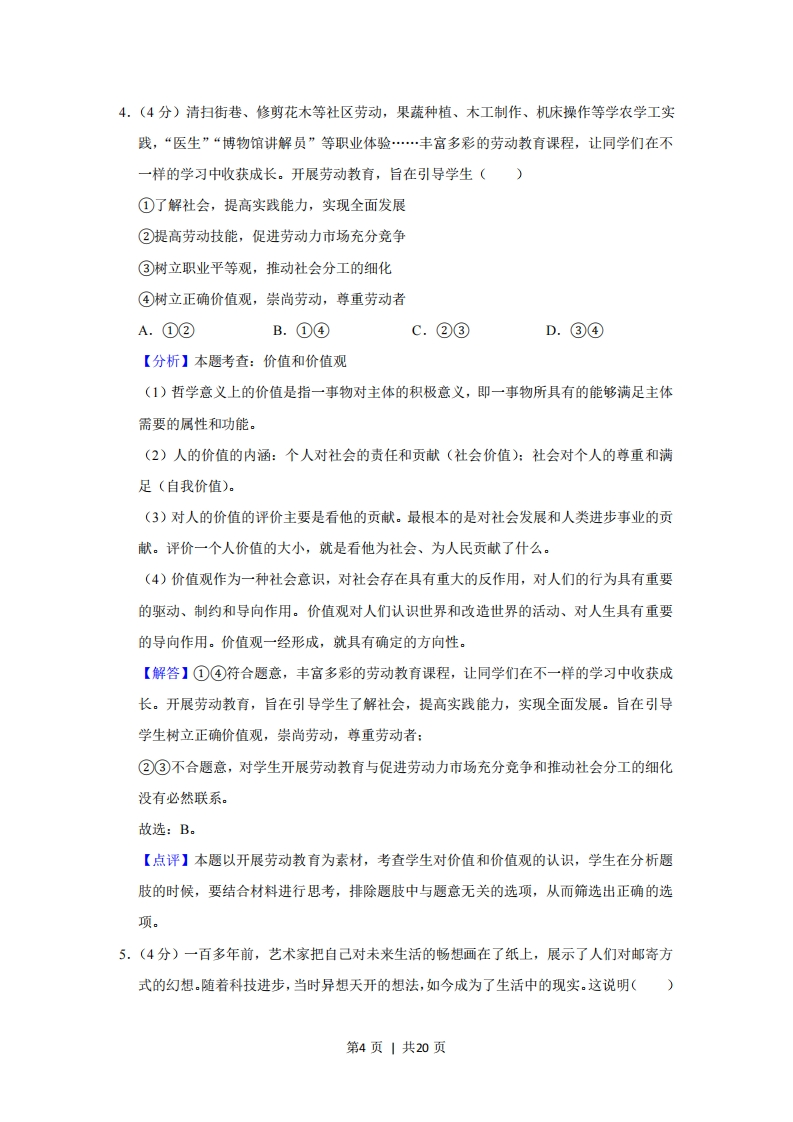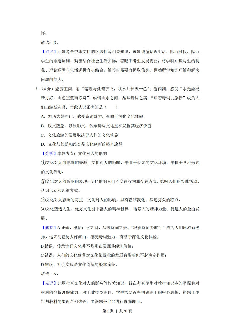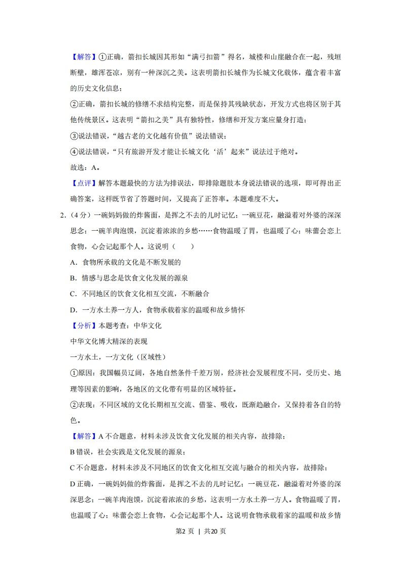 2019年北京市高考政治试卷◆考答案与试题解析一、选择题:共12小题,每小题4分,共48分。在每小题列出的四个选项中,选出最符合题目要求的一项。1.(4分)“刀把楼、北京结、天梯、鹰飞倒仰…”箭扣长城因其形如“满弓扣箭”得名,城楼和山崖融合在一起,残垣断壁,雄浑苍凉,别有一种深沉之美,是明代长城最险段之一。箭扣长城的修缮不求结构完整,而是保持其残缺状态,开发方式也将区别于其他传统景区。下列选项正确的是()①箭扣长城作为长城文化载体,蕴含着丰富的历史文化信息②“箭扣之美”具有独特性,修缮和开发方案应量身打造③文化具有继承性,“箭扣之美”来自时间,越古老的文化越有价值④文化需要发展,只有旅游开发才能让长城文化“活”起来A.①②B.①④C.②③D.③④【分析】本题考查:文化的内涵和特点(1)含义:文化是相对于经济、政治而言的人类全部精神活动及其产品。(2)内容:既包括世界观、人生观、价值观等具有意识形态性质的部分,又包括自然科学和技术、语言和文字等非意识形态的部分。(3)特点①文化是人类社会特有的现象,是人类社会实践的产物。②海个人的文化素养不是天生的,而是通过对社会生活的体验,特别是通过参与文化活动、接受文化知识教育而逐步培养出来的。③人们的精神活动离不开物质活动,精神产品离不开物质载体。第1页|共20页