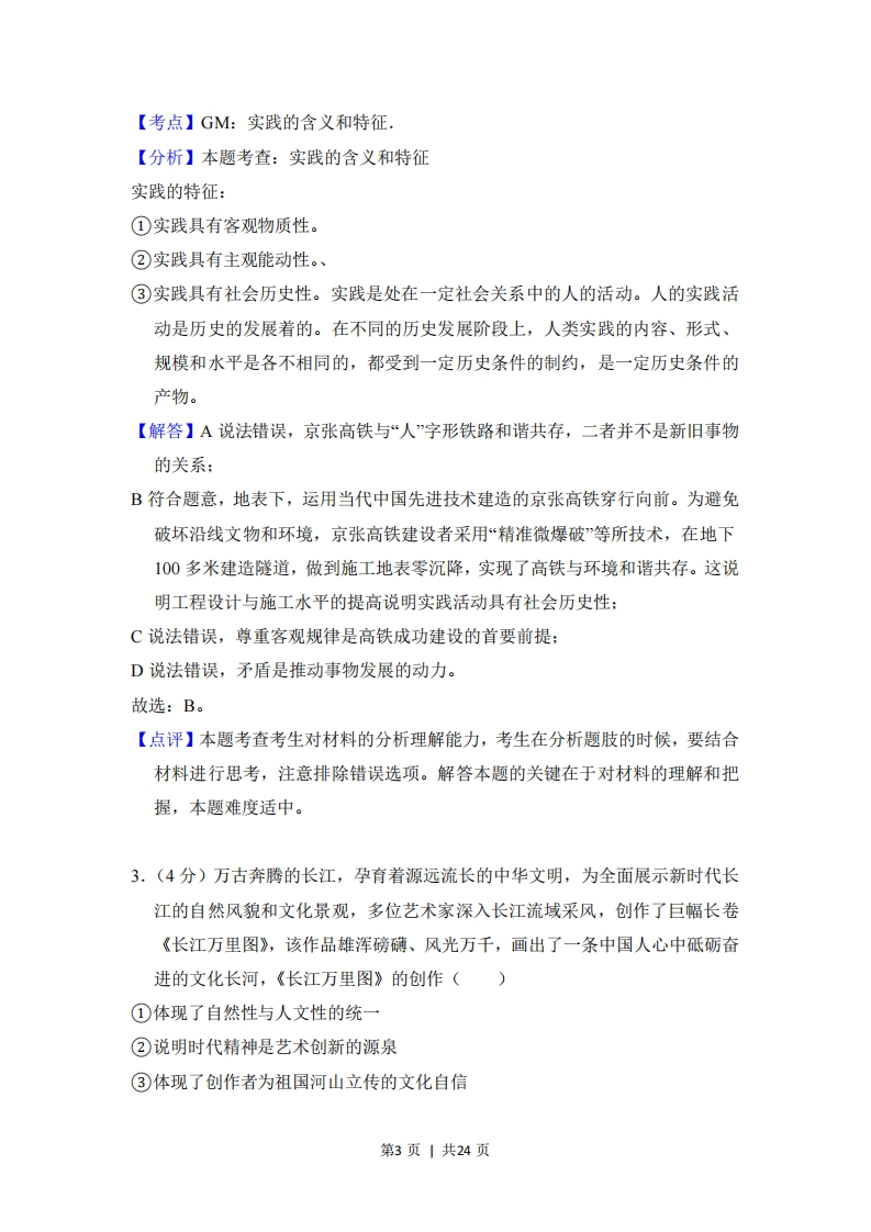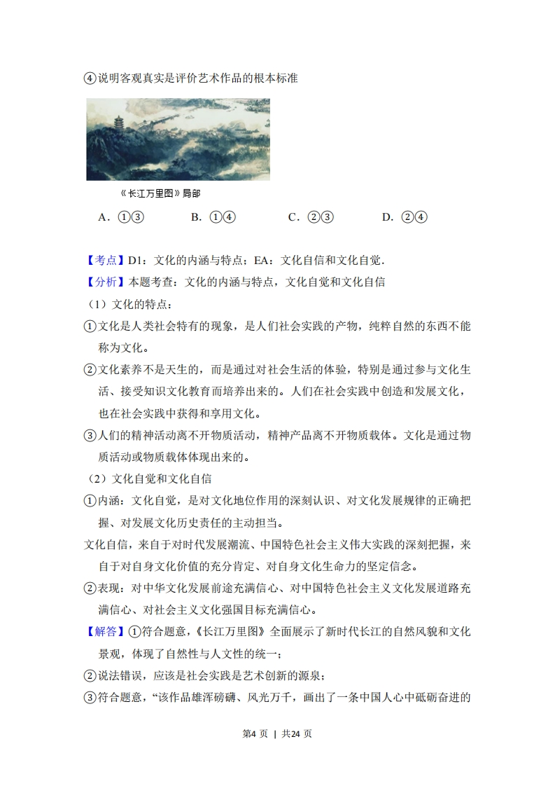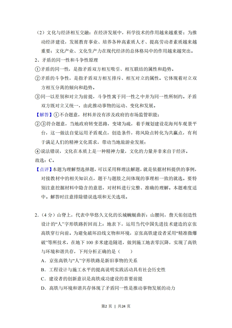 2018年北京市高考政治试卷考答来与试题解析一、选择题(共12小题,每小题4分,满分48分)1.(4分)每年三四月间,居庸关长城附近山花盛放。市郊铁路S2线列车穿行于花海中,被称为“开往春大的列车”,吸引了大量踏青的游客,游客的涌入给森林消防和轨道交通带来了安全隐患,当地政府采取封山禁入措施,但效果不理想,于是转变思路,变堵为疏,着手规划建设花海列车观景平台,这一做法()①履行了政府的市场监管职能,有利于建立良好市场秩序②自觉运用矛盾观点,创造条件,将风险点转化为共赢点③有利于满足人们的精神文化需求,带动当地旅游业发展④有利于开发该线路的经济价值,说明文化的力量来自于经济A.①③B.①④C.②③D.②④【考点】D4:文化与经济政治的关系:HK:矛盾同一性和斗争性原理【分析】本题考查:文化与经济、政治的关系,矛盾的同一性和斗争性原理1、文化与经济、政治的关系(1)文化与经济、政治相互影响①经济、政治决定文化。经济是基础,政治是经济的集中表现,文化是经济和政治的反映。②一定的文化由一定的经济、政治所决定,又反作用于一定的政治、经济,给予政治、经济以重大影响。第1页|共24页