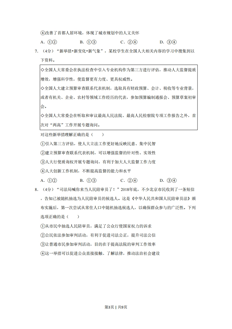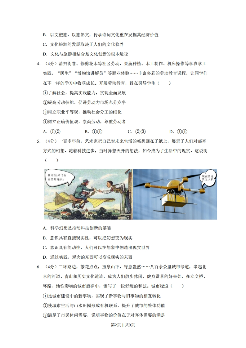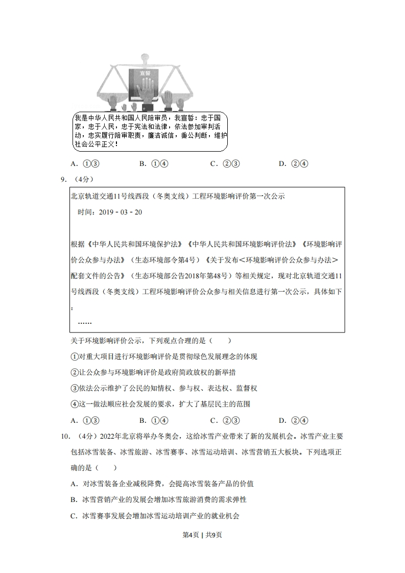 2019年北京市高考政治试卷一、选择题:共12小题,每小题4分,共48分。在每小题列出的四个选项中,选出最符合题目要求的一项。1.(4分)“刀把楼、北京结、天梯、鹰飞倒仰…”箭扣长城因其形如“满弓扣箭”得名,城楼和山崖融合在一起,残垣断壁,雄浑苍凉,别有一种深沉之美,是明代长城最险段之一。箭扣长城的修缮不求结构完整,而是保持其残缺状态,开发方式也将区别于其他传统景区。下列选项正确的是()①箭扣长城作为长城文化载体,蕴含着丰富的历史文化信息②“箭扣之美”具有独特性,修缮和开发方案应量身打造③文化具有继承性,“箭扣之美”来自时间,越古老的文化越有价值④文化需要发展,只有旅游开发才能让长城文化“活”起来A.①②B.①④C.②③D.③④2.(4分)一碗妈妈做的炸酱面,是挥之不去的儿时记忆:一腕豆花,融溢着对外婆的深深思念:一碗羊肉泡馍,沉淀着浓浓的乡愁…食物温暖了胃,也温暖了心:味蕾会恋上食物,心会记起那个人。这说明()A,食物所承载的文化是不断发展的B.情感与思念是饮食文化发展的源泉C.不同地区的饮食文化相互交流,不断融合D.一方水土养一方人,食物承载若家的温暖和故乡情怀3.(4分)登滕王阁,看“落霞与孤鹜齐飞,秋水共长天一色”:游西湖,感受“水光潋滟晴方好,山色空蒙雨亦奇”。纵情山水之间,品味诗词之美,“跟着诗词去旅行”成为人们出游新选择。对此认识正确的是()A.游历大好河山,感受诗词魅力,有助于深化文化体验第1页1共9页