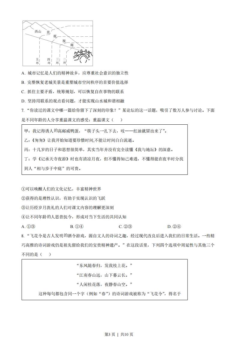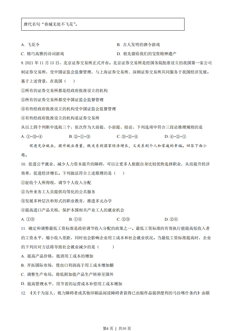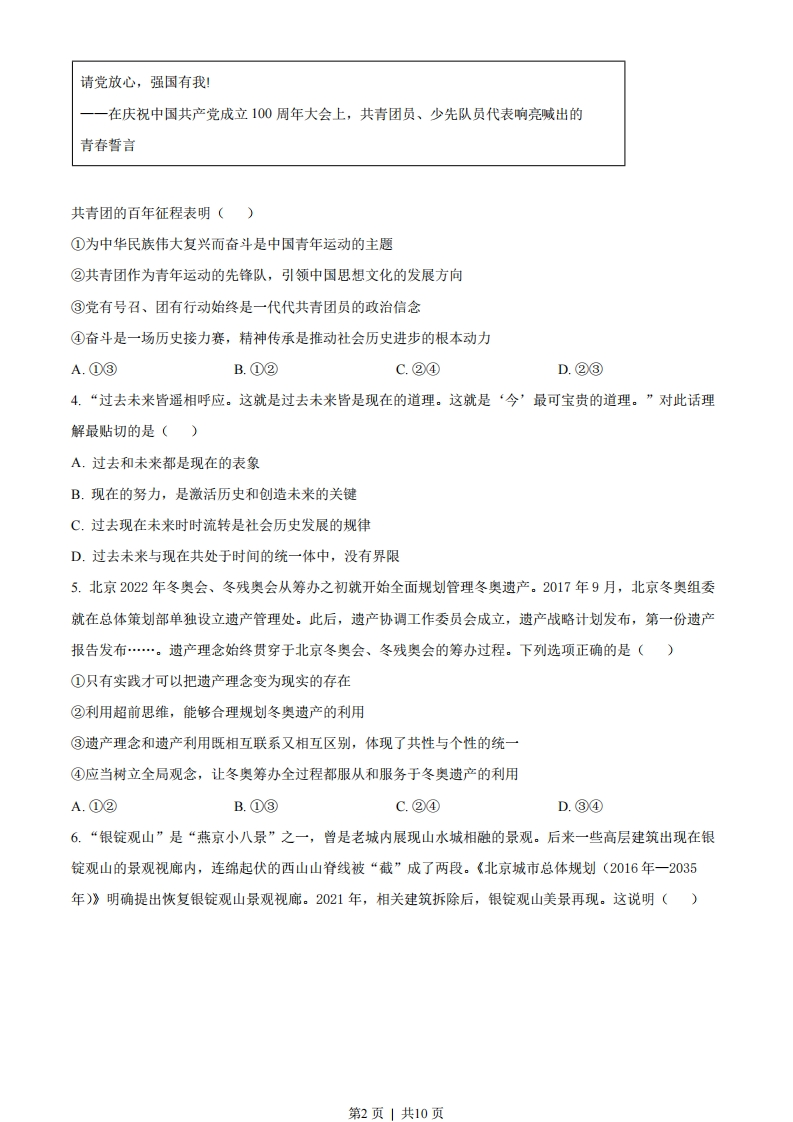 2022年北京市学业水平等级性考试思想政治试卷注意事项:本试卷共9页,100分。考试时长90分钟。考生务必将答案答在答题卡上,在试卷上作答无效。考试结束后,将本试卷和答题卡一并交回。一、本部分共15题,每题3分,共45分。在每题列出的四个选项中,选出最符合题目要求的一项。1.百年来,党团结带领全国各族人民绘就了人类发展史上的壮美画卷。党的十八大以来的这十年,以习近平同志为核心的党中央,解决了许多长期想解决而没有解决的难题,办成了许多过去想办而没有办成的大事,推动党和国家事业取得历史性成就、发生历史性变革。下列认识正确的是()①人民对美好生活的向往是我们党的奋斗目标②历史性成就的取得表明我国己进入社会主义高级阶段③全面建成小康社会是改革开放以来党的全部理论和实践的主题④实践证明了新时代党的一系列原创性的治国理政新理念新思想新战略的科学性A.①③B.①④C.②③D.②④2.我国宪法规定,公民有劳动的权利和义务,国家奖励劳动模范和先进工作者。回顾历史,劳模表彰随着党和国家事业的发展而发展。劳模表彰起步于新民主主义革命时期,历经几十年探索与发展,在中国特色社会主义新时代得到发扬光大。开展劳模表彰()①旨在保障劳动者接受职业技能培训的权利,提高劳动生产效率②是有效的社会动员方法,也是国家治理中不可或缺的制度安排③能进一步激励全党全国各族人民积极投身经济社会发展的实践④可以从根本上解决发展不平衡不充分的问题,实现共同富裕A.①③B.①④C.②③D.②④3.一百年来,中国共青团始终与党同心、跟党奋斗,团结带领广大团员青年把忠诚书写在党和人民事业中,把青春播撒在民族复兴的征程上,把光荣镌刻在历史行进的史册里。时代各有不同青春一脉相承国家兴亡,匹夫有责。只有走十月革命的路,才能救中国!一一共青团创始人之一张太雷表达的心声把青春献给祖国!一一社会主义革命和建设时期,广大团员青年喊出的响亮口号团结起来,振兴中华判一改革开放和社会主义现代化建设新时期,广大团员青年发出的时代强音第1页」共10页