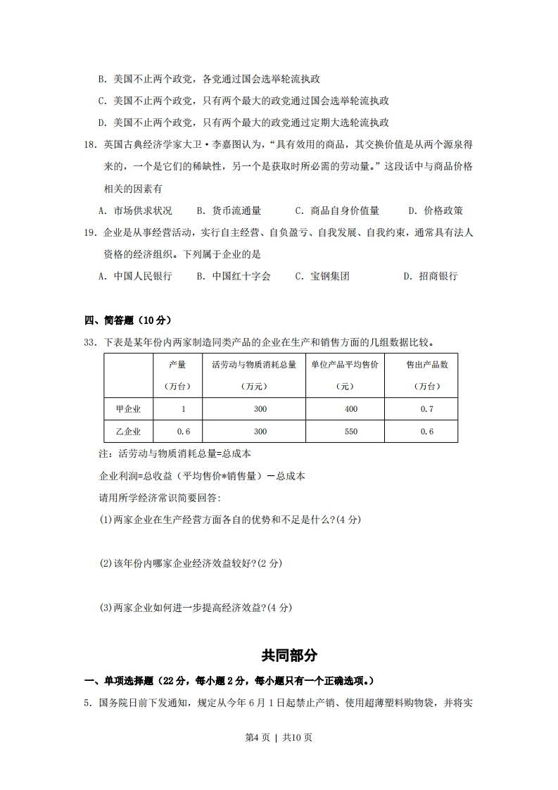 绝密★启封前2008年普通高等学校招生全国统一考试政治(上海卷)分叉部分A组(适合使用“二期”课改教材的考生)一、单项选择题(8分,每小题2分,每小题只有一个正确选项)1.2003年至2007年,最高人民法院共审结各类案件20451件。这体现了人民法院代表国家依法行使A.检察权B.立法权C.审判权D.行政权2.今年“两会”召开前,多名农民工建议全国人大代表向“两会”提交一份关于农民工医疗、养老等问题的提案。农民工的行为是A.依法直接参与民主决策B.依法间接参与民主决策C.依法直接参与民主管理D.依法间接参与民主管理3.2008年4月,国务院扶贫办草拟的扶贫标准调整办法把贫困标准从2007年的1067元提高到1300元,首次达到国际标准。这一标准不仅关注贫困人口维持基本生存所需要的收入,还考虑他们在教育医疗方面的支付能力。上述材料可以看出A.贫困线标准的提高不利于我国减贫事业的发展B.与国际标准接轨是减贫工作的根本出发点和落脚点C.贫困线标准的提高标志着我国已经全面建成小康社会D.新标准在保障基本生存的基础上加入了促进发展的理念4.在一些银行理财产品宣传单上常出现“包赚不赔”、“高收益”等字眼,而必要的风险提示很不明显。按照《中华人民共和国消费者权益保护法》,此举侵犯了消费者的A.结社权B.知情权C.受尊重权D.获得赔偿权二、不定项选择题(12分,每小题3分,年小题有一个或一个以上的正确选项,全部选对才给分,错选、少选、多选不给分。)16.“始终不渝走和平发展道路”,这是中国政府与中国人民根据时代发展潮流和自身根本利益作出的战略选择。走和平发展道路意味着第1页|共10页